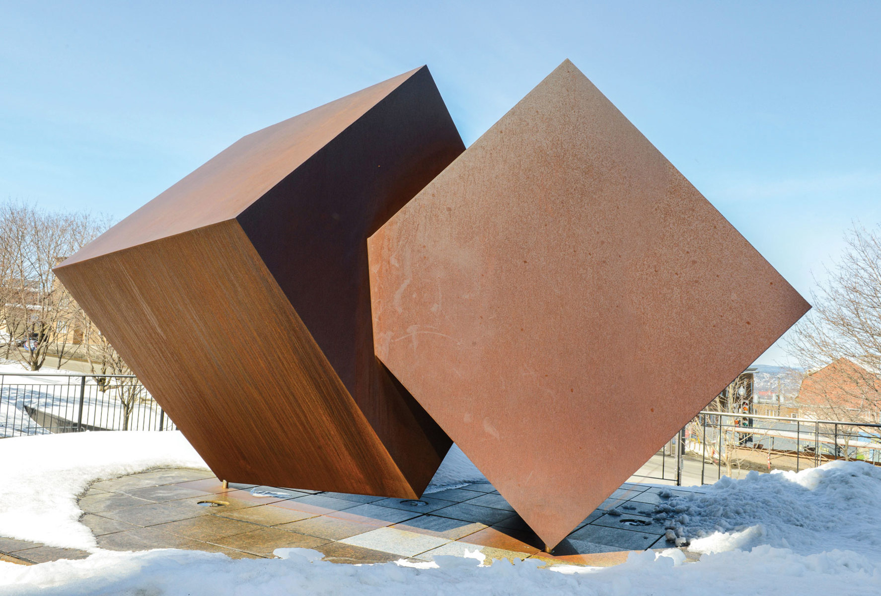 Composée de deux cubes d’acier imbriqués, cette sculpture forme en fait une seule entité : un couple reposant sur une base en granit. Selon l’angle de vue, elle présente une variété de plans et d’angles où joue la lumière.