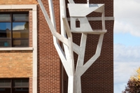 Marguerite Bourgeoys, arrivée en Nouvelle-France en 1653, est la première institutrice de la colonie et la fondatrice de la congrégation de Notre-Dame. La sculpture qui lui est dédiée prend la forme d’un arbre qui abrite une école, figurant à la fois l’enracinement dans le milieu et l’épanouissement par l’apprentissage.