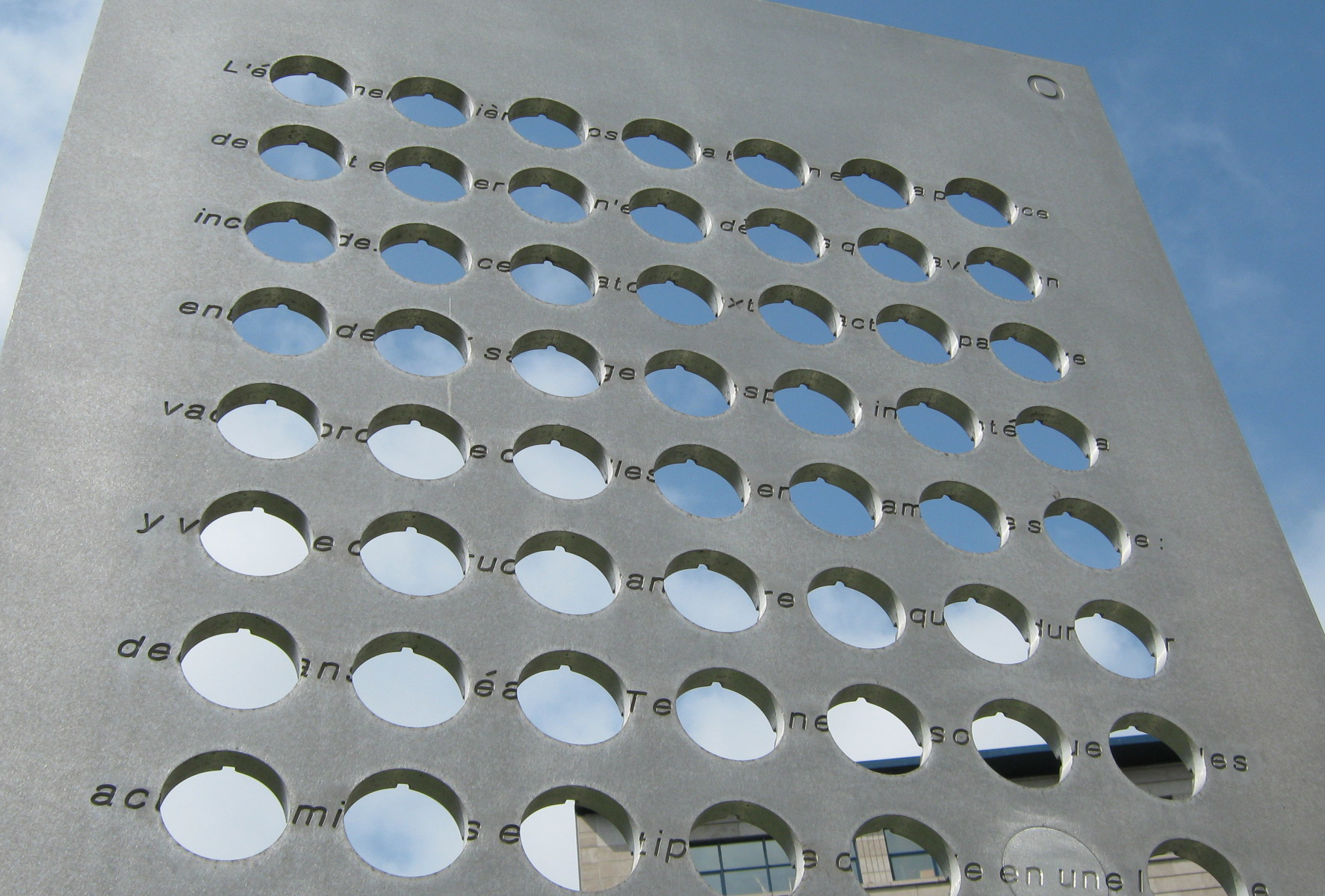 Un poème a été gravé sur quatre panneaux d’aluminium qu’on a ensuite percés de 476 trous, libérant autant de pièces circulaires, chacune avec un fragment de texte et une adresse URL. Remises à des participants, les pièces passent de main en main et leur trajet peut être suivi sur le Web. Après avoir circulé dans le monde, les pièces seront réinsérées pour que le poème, petit à petit, soit reconstitué.