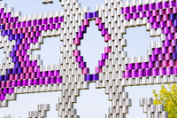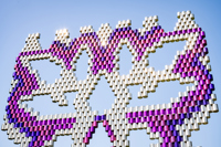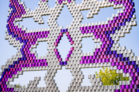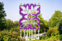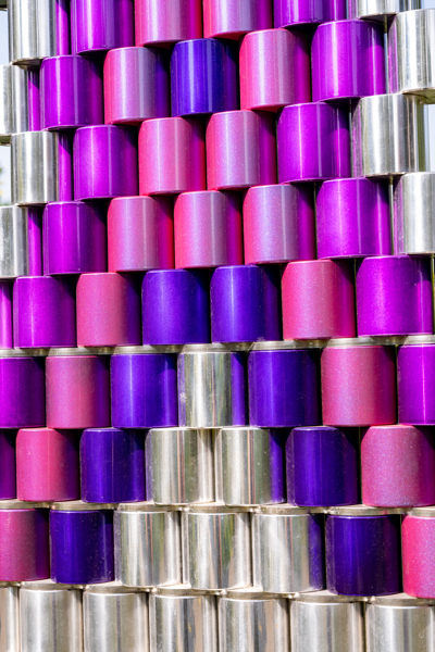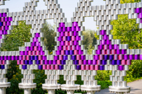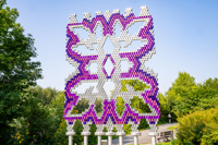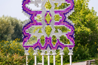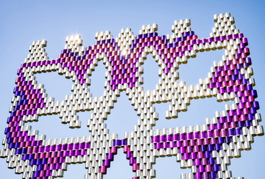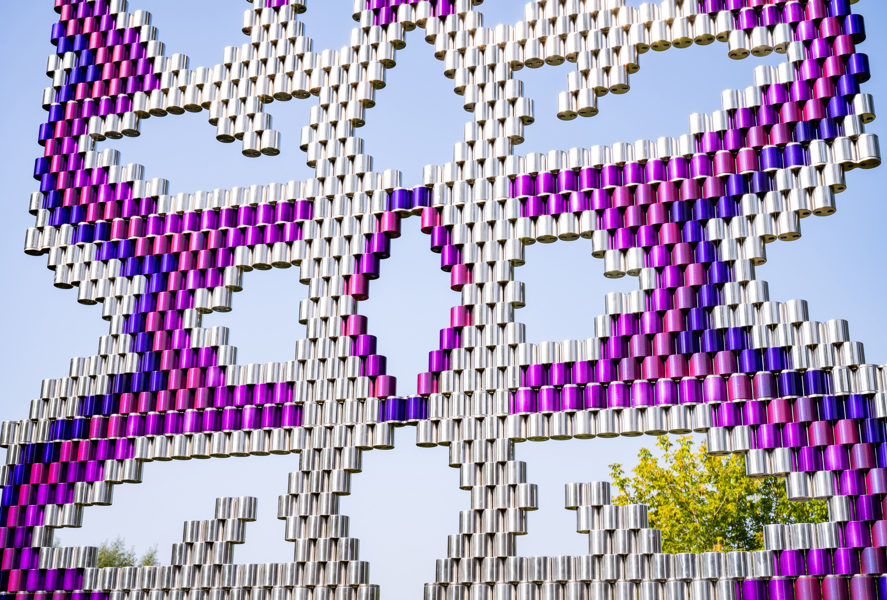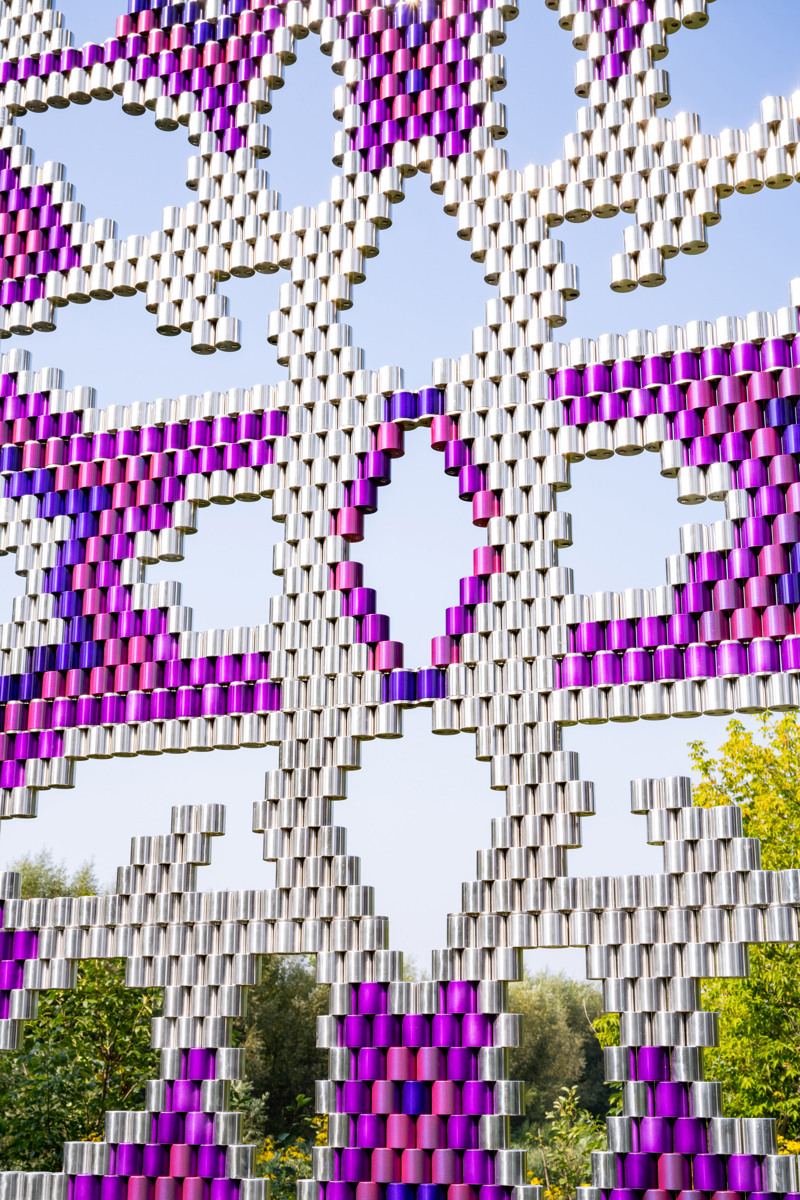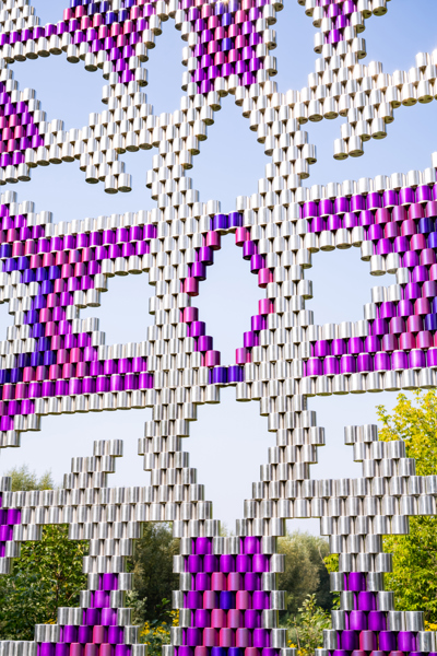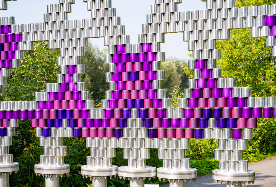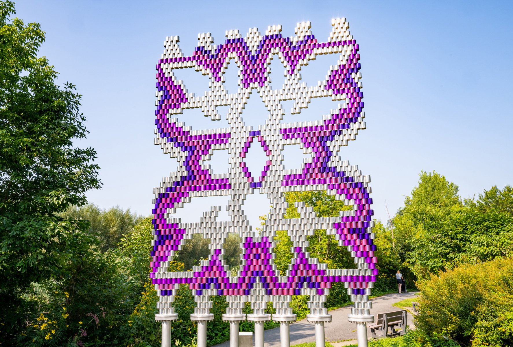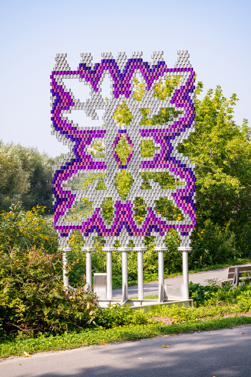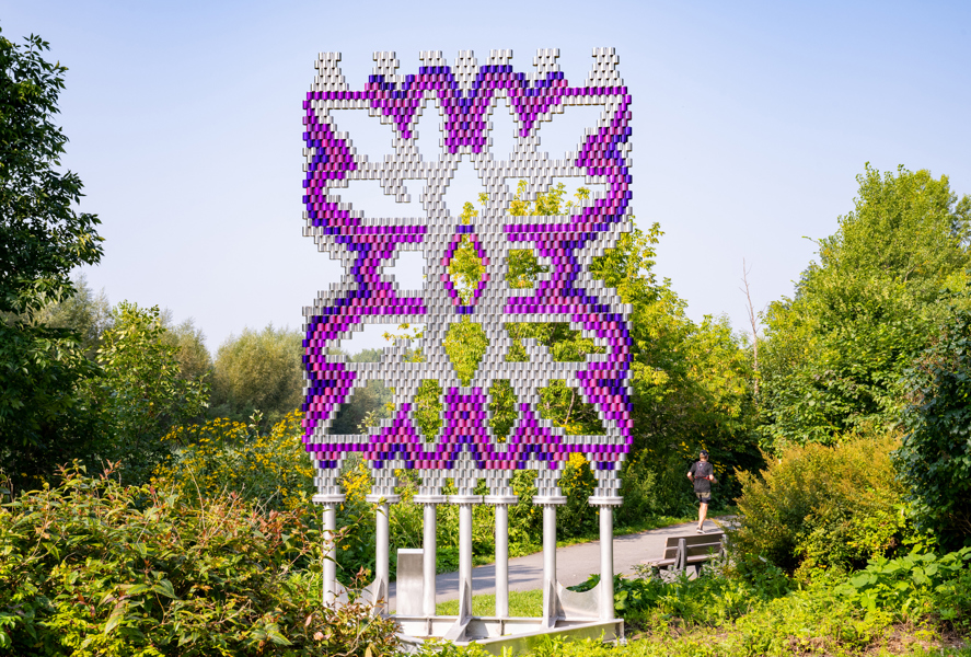 Quel délicat motif semble ici brodé dans le rideau de verdure ? Cette sculpture se compose de perles métalliques peintes en nuances de rose ou polies comme des miroirs. Sa silhouette géométrique figure une plante médicinale. Une dentelle qui encadre et reflète le paysage. De fait, cette œuvre contemporaine réinvente l’art autochtone du tissage de perles colorées. En agençant les pièces, elle symbolise les liens qui nous unissent aux objets et aux lieux. Elle métisse ainsi les époques et les cultures tout en célébrant la magie de la nature. Son titre signifie d’ailleurs « faire une offrande et rendre grâce » en langue anichinabée.