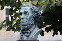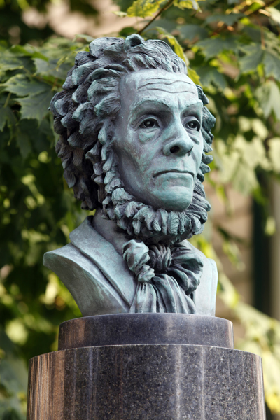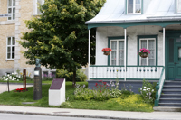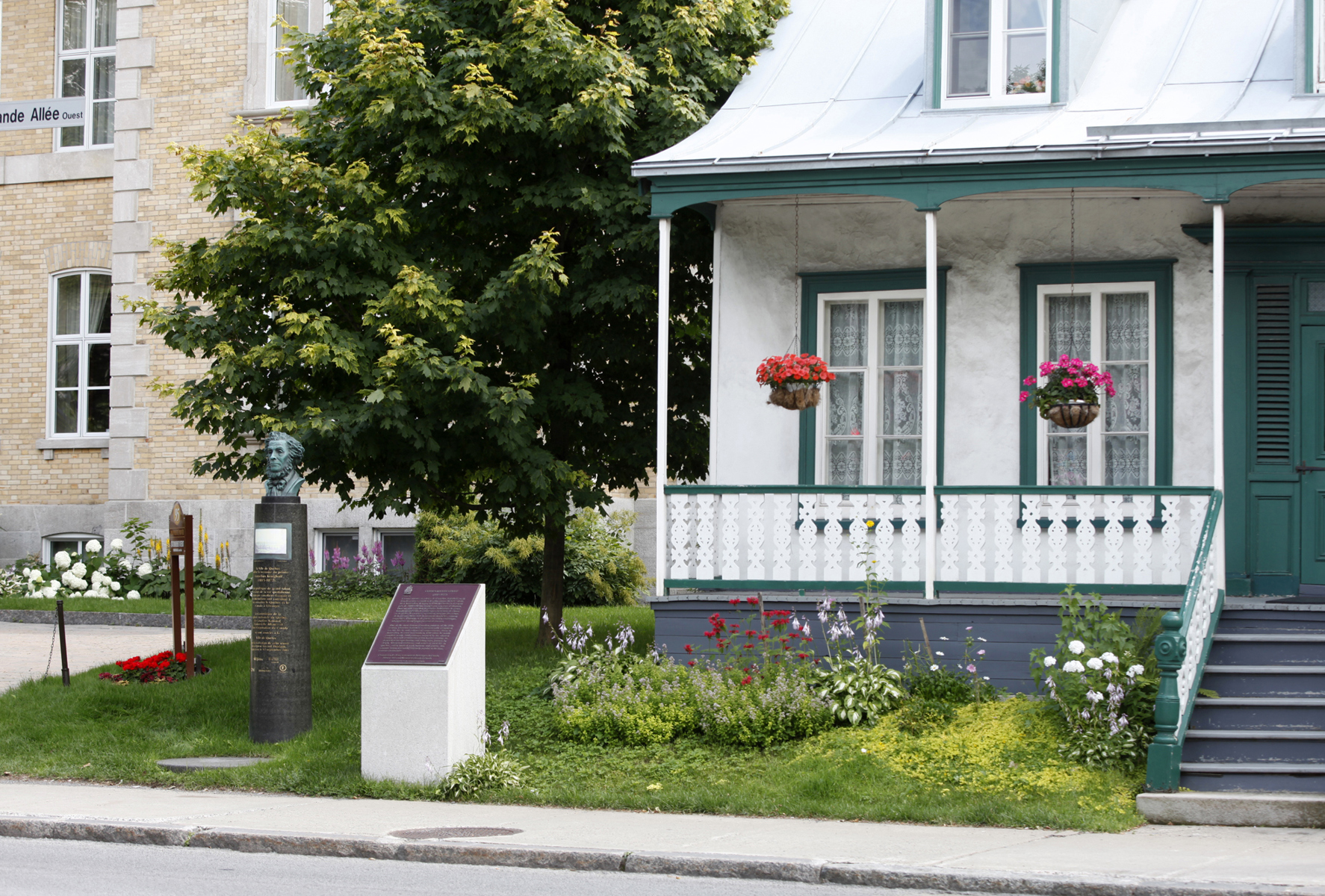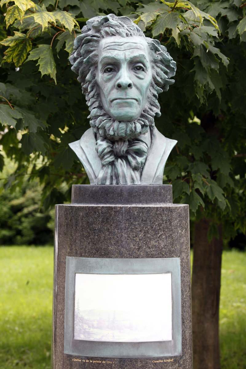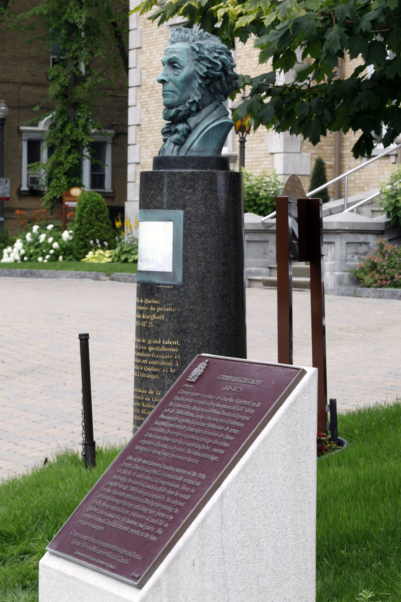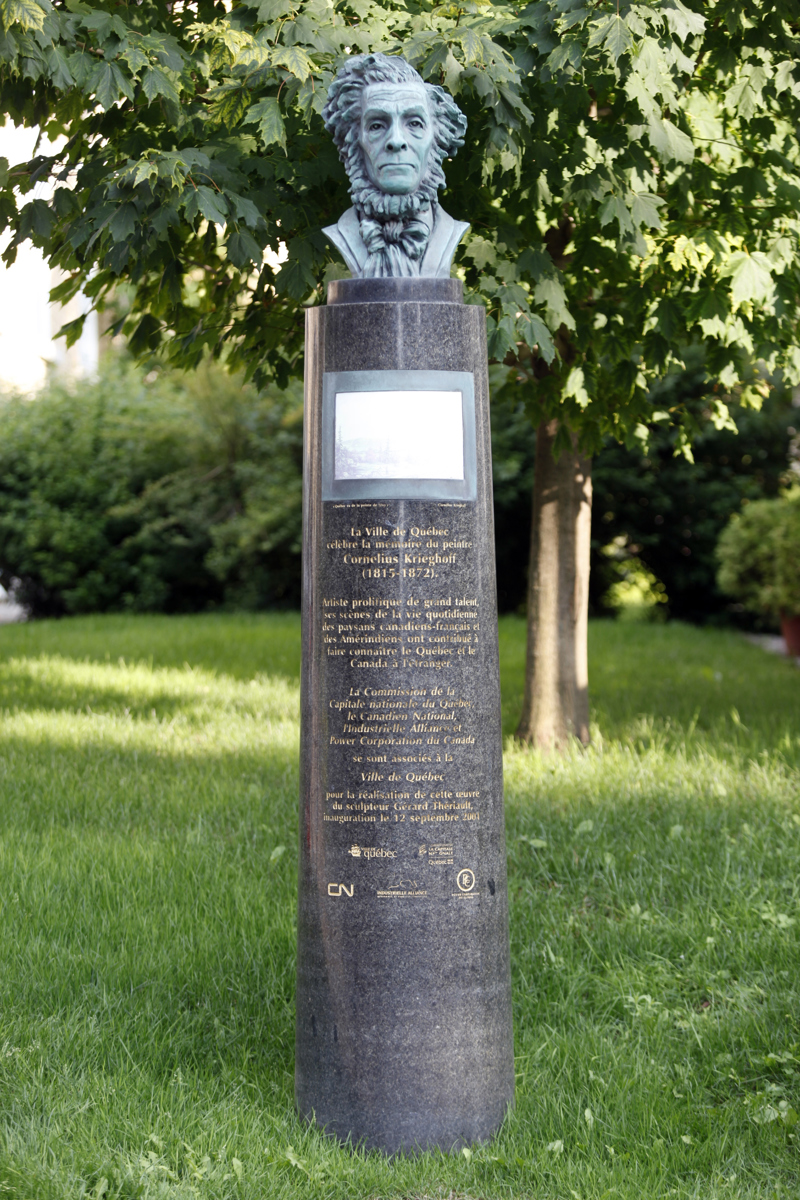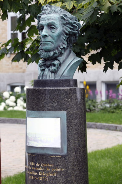 Le sculpteur charlevoisien Gérard Thériault (1939-2001) a signé ce buste en bronze de Cornelius Krieghoff (1815-1872). La sculpture qui lui rend hommage avoisine la maison qu’il a habitée quelque temps, au 115 de la Grande Allée Ouest. Le piédestal en granit est orné d’une reproduction du tableau Québec vu de la pointe de Levy, peint en 1853.