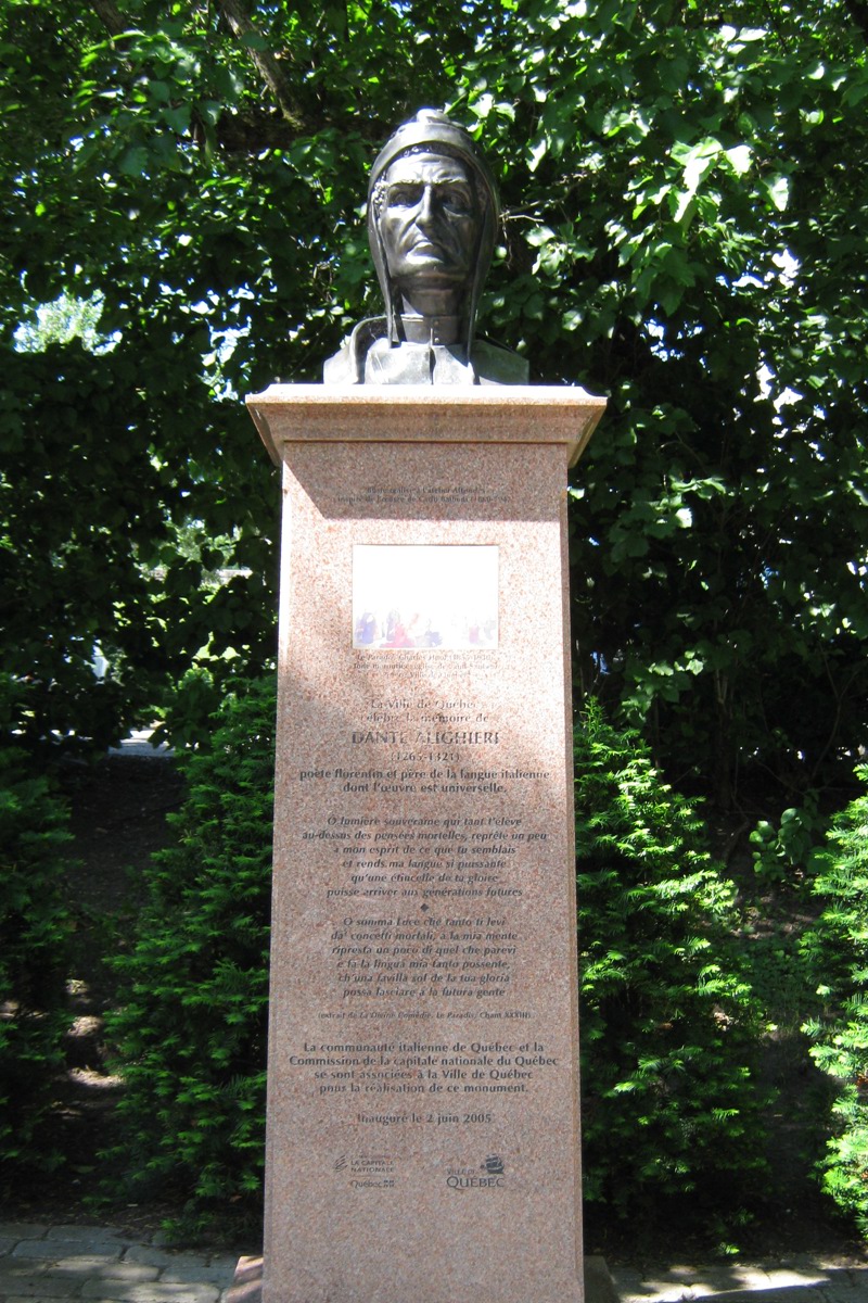 Dévoilé en 2005, ce monument de la ville de Québec rappelle Dante Alighieri, célèbre poète florentin auteur de La Divine Comédie et considéré comme le père de la langue italienne. La sculpture est l’œuvre de L’atelier Attitude de Montréal et est inspirée du buste de Dante réalisé par Carlo Balboni en 1921.