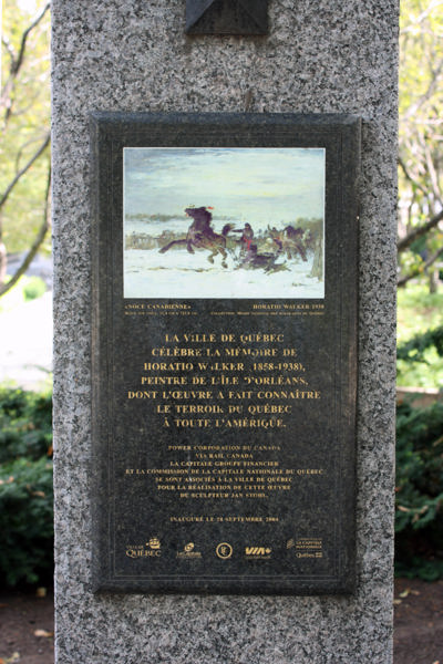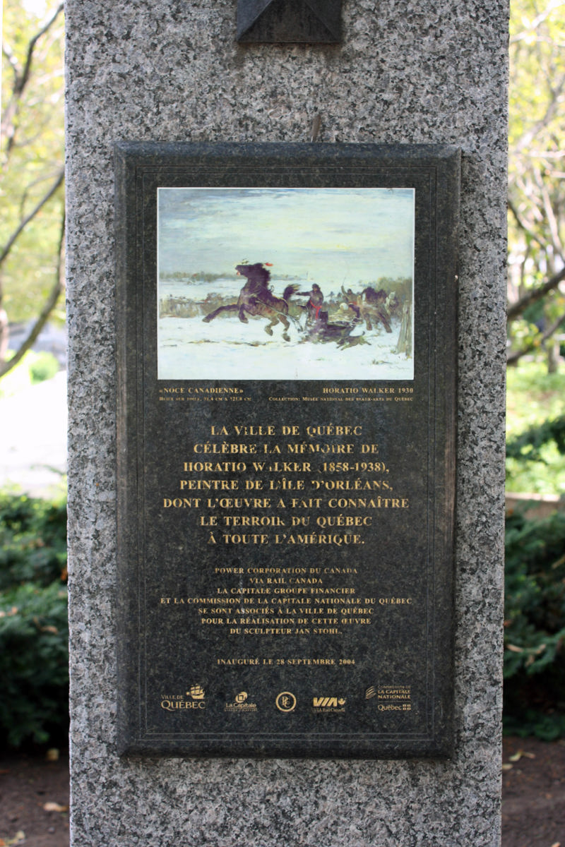 Horatio Walker, né en Ontario, compte parmi les peintres paysagistes canadiens les plus en vue des premières décennies du 20e siècle. Établi à l’île d’Orléans, il s’attache à peindre la vie rurale québécoise tout en la sublimant, à la manière de l’école de Barbizon, en France. On peut voir sur le piédestal une reproduction de son tableau Noce canadienne, réalisé en 1930.