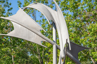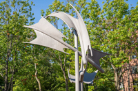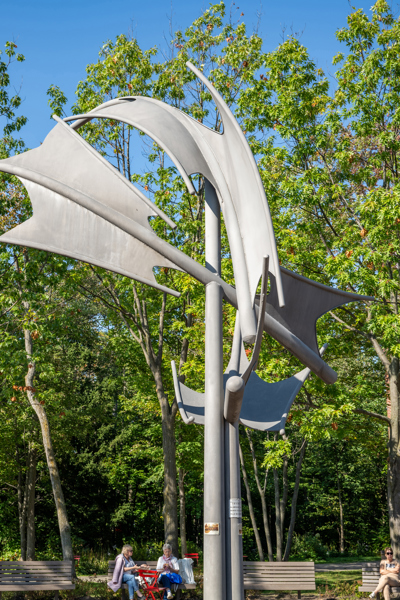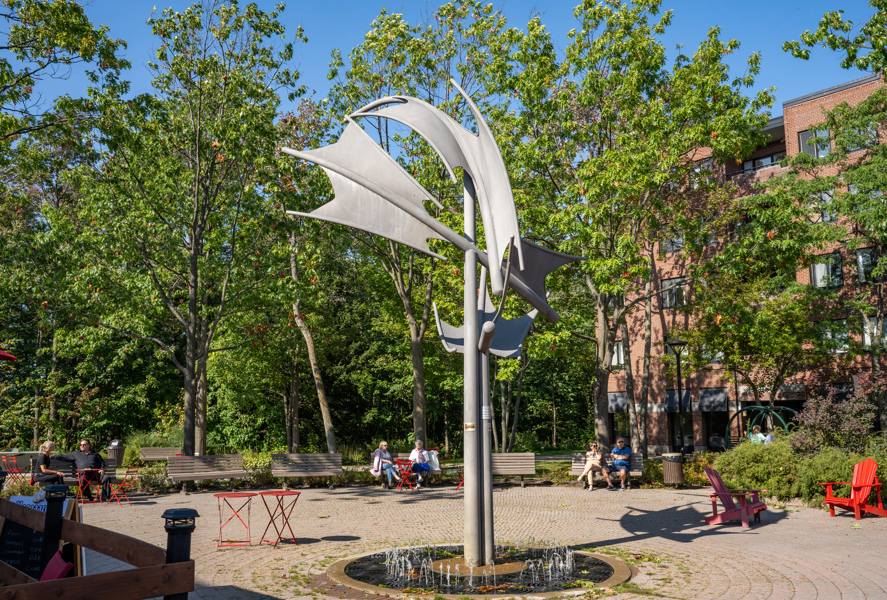 Une fontaine borde la base de cette sculpture qui occupe une place de choix au centre de la petite place en pavé aménagée à l’entrée du parc du Campanile.