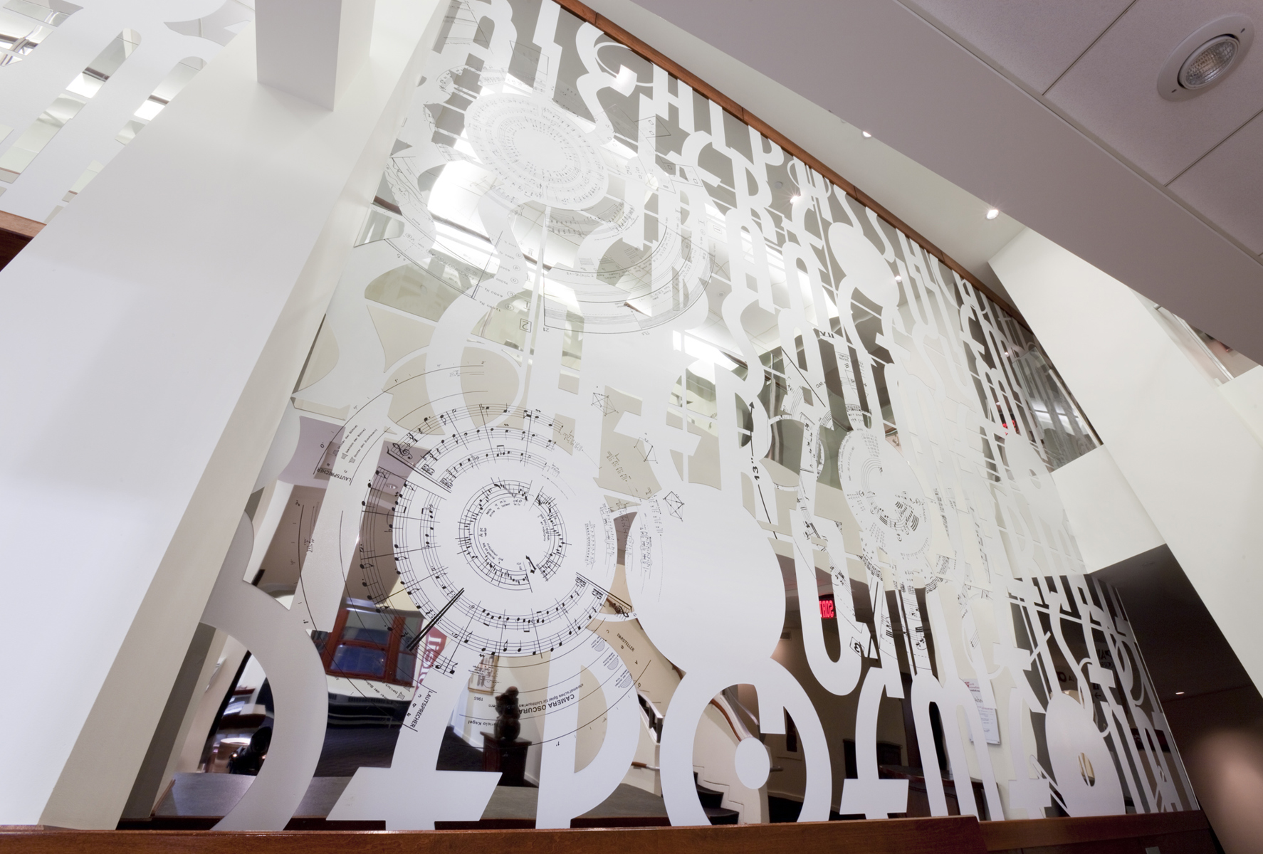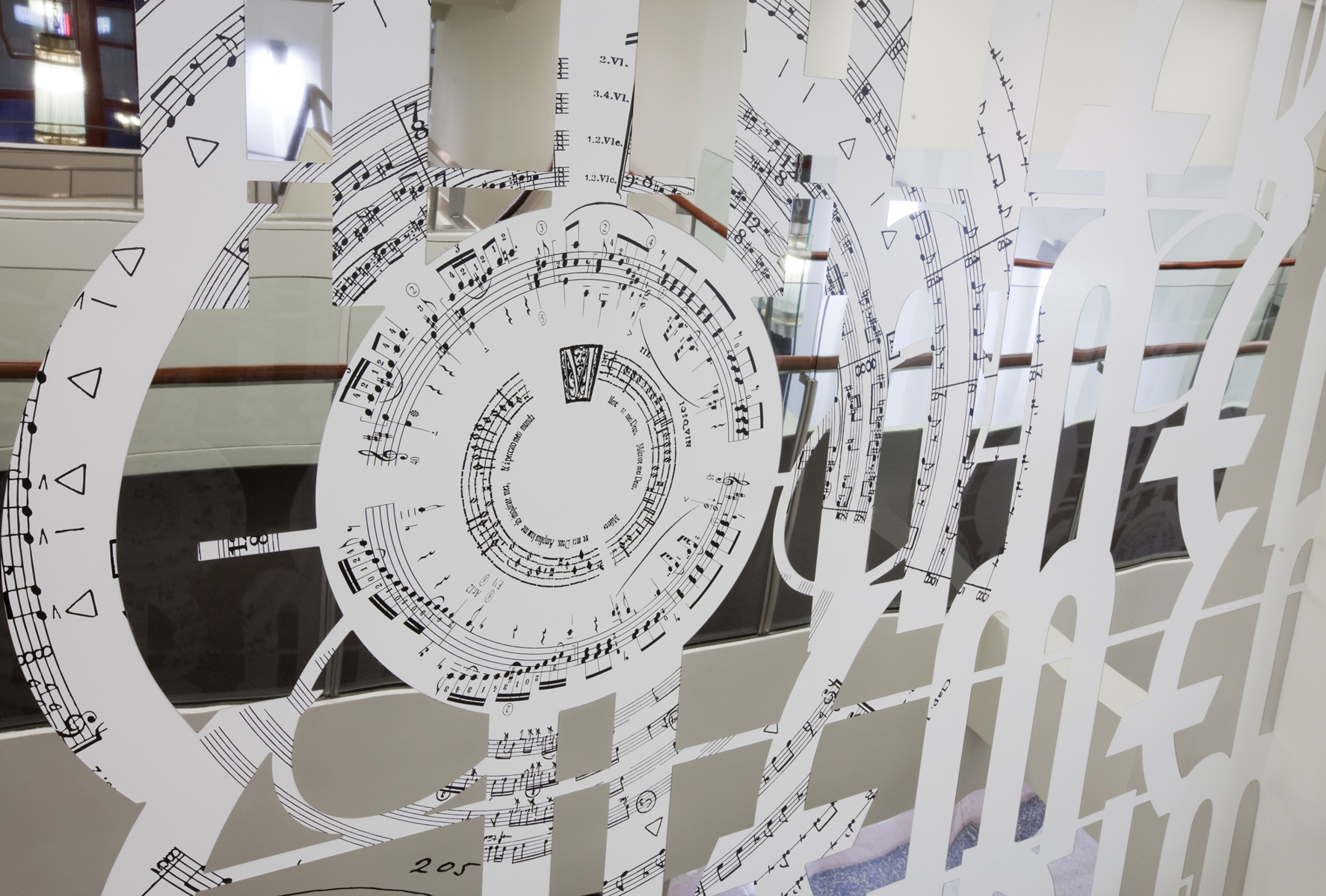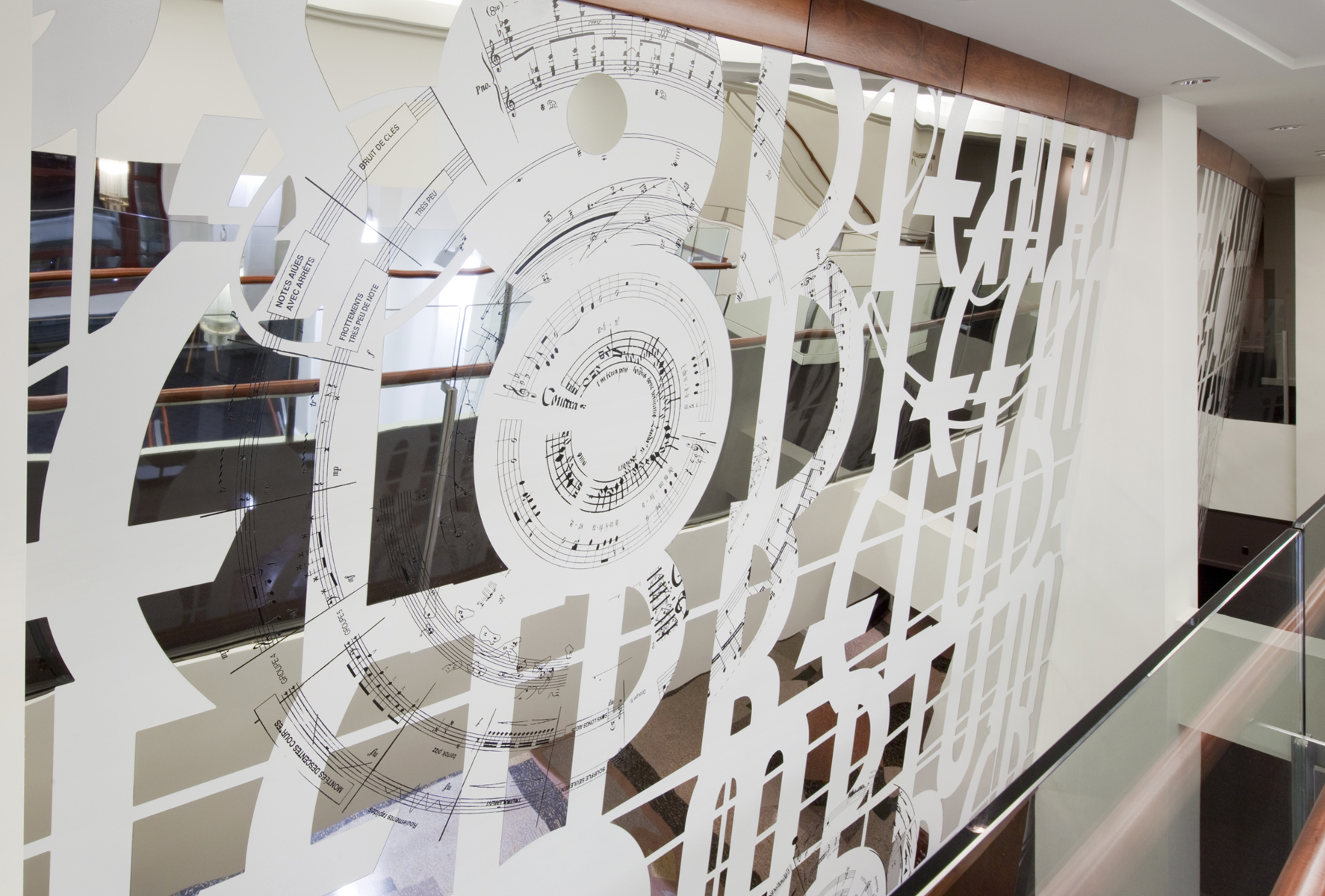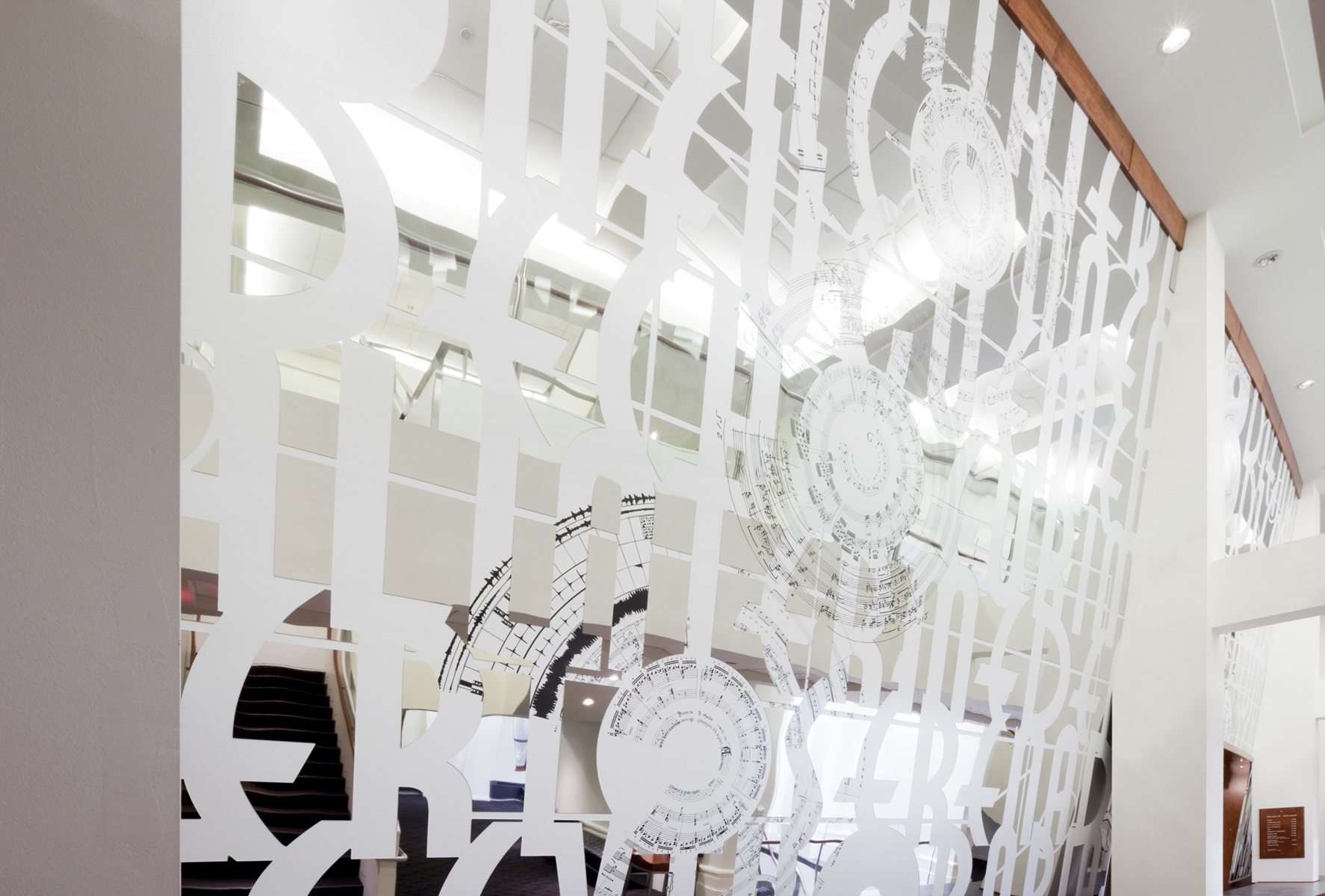 L’œuvre scintillante et lumineuse, réalisée en acier inoxydable fini miroir, crée une impression d’espace et de luminosité dans le foyer principal du Palais Montcalm. La surface de l’œuvre, composée de centaines de formes musicales et visuelles, est incurvée, permettant ainsi de créer des effets de perspective. Selon la position du spectateur, il est possible de voir sans être vu et d’être vu sans s’en rendre compte. Plusieurs formes d’écriture musicale inscrites entre les découpes de même que l’utilisation du noir et du blanc créent un lien avec la musique. Le tout s’harmonisant avec le style art déco propre à la salle et à l’édifice.