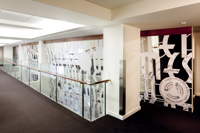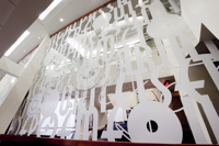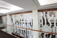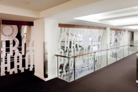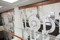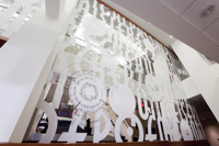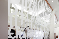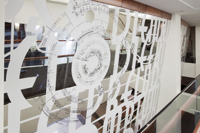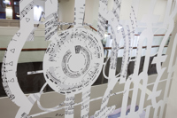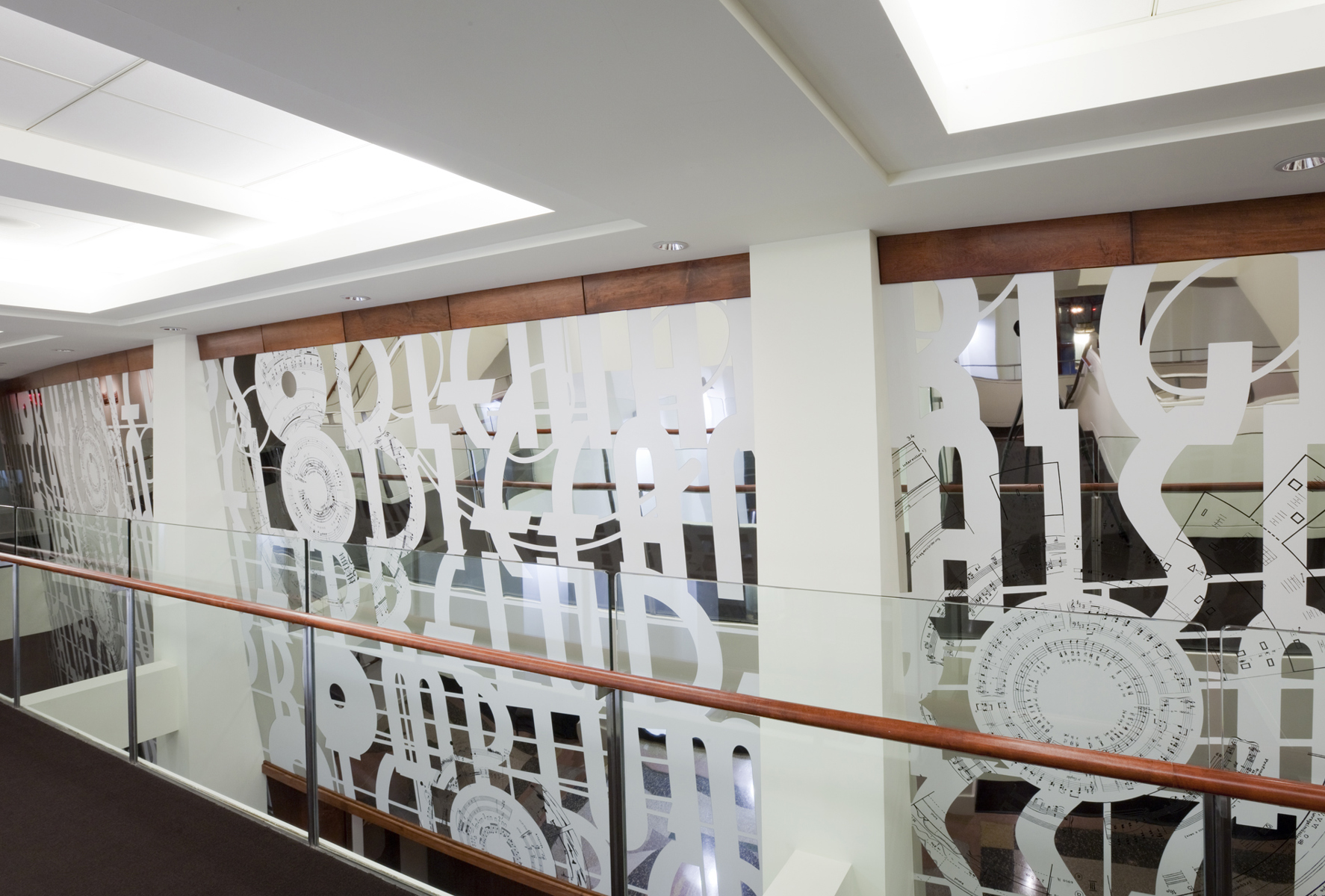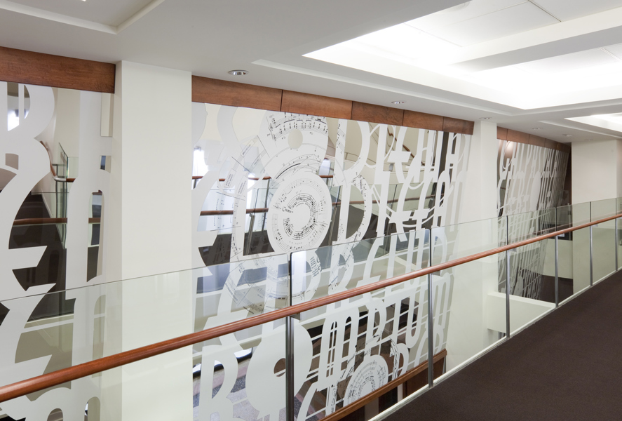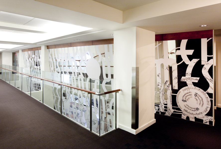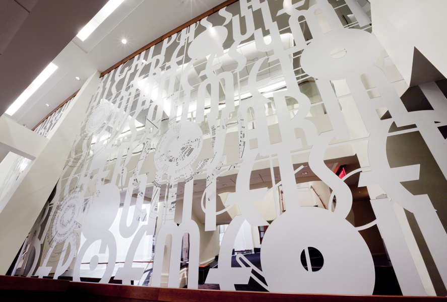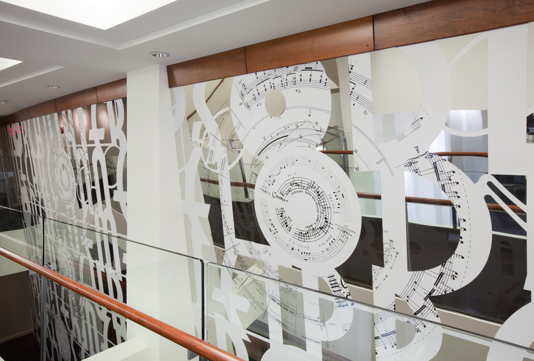 L’œuvre scintillante et lumineuse, réalisée en acier inoxydable fini miroir, crée une impression d’espace et de luminosité dans le foyer principal du Palais Montcalm. La surface de l’œuvre, composée de centaines de formes musicales et visuelles, est incurvée, permettant ainsi de créer des effets de perspective. Selon la position du spectateur, il est possible de voir sans être vu et d’être vu sans s’en rendre compte. Plusieurs formes d’écriture musicale inscrites entre les découpes de même que l’utilisation du noir et du blanc créent un lien avec la musique. Le tout s’harmonisant avec le style art déco propre à la salle et à l’édifice.