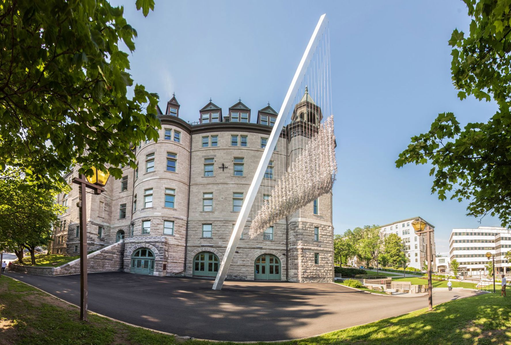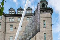 Codex Populi est la plus haute œuvre d’art public de Québec. Elle est constituée d’un mat incliné de 23 mètres – l’équivalent d’un bâtiment de 7 étages! L’œuvre rend hommage à la Conférence de Québec de 1864, où ont été élaborées plusieurs règles de fonctionnement du Canada. Les 9 520 crochets suspendus symbolisent les signatures des personnes ayant participé aux décisions politiques.