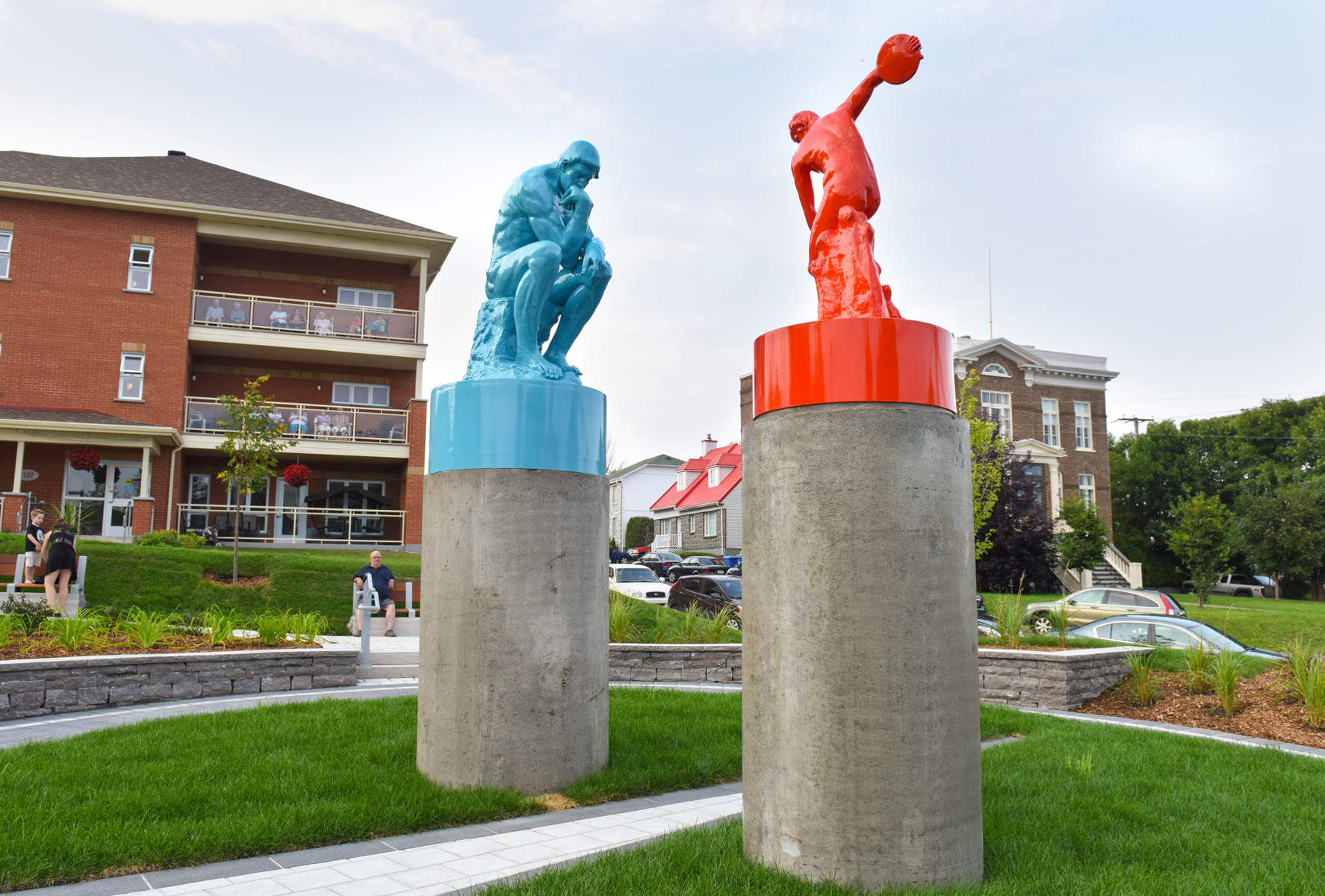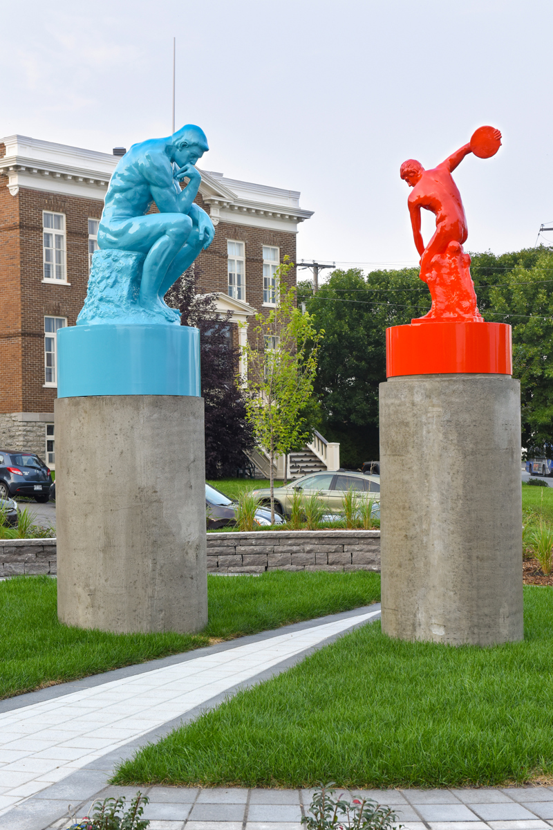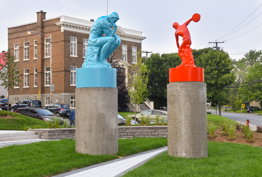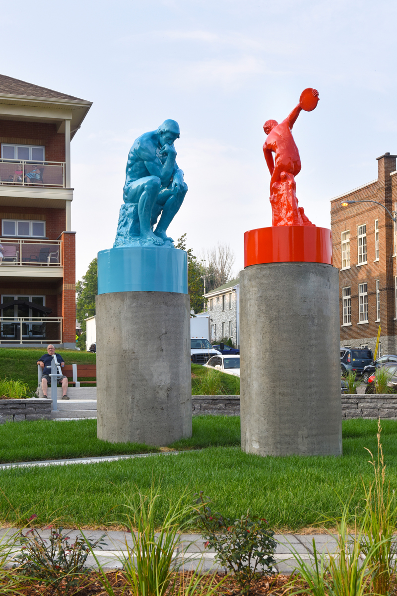 Cet ensemble sculptural met en relation deux œuvres emblématiques de l’histoire de l’art, Le penseur de Rodin et Le discobole de Myron. Les couleurs vibrantes et les socles de béton, tout comme la disposition dans l’espace, donnent aux sculptures une facture actuelle et accentuent en même temps leur pouvoir d’évocation.