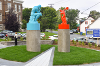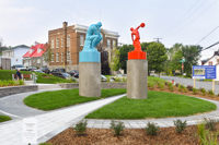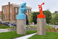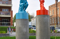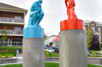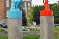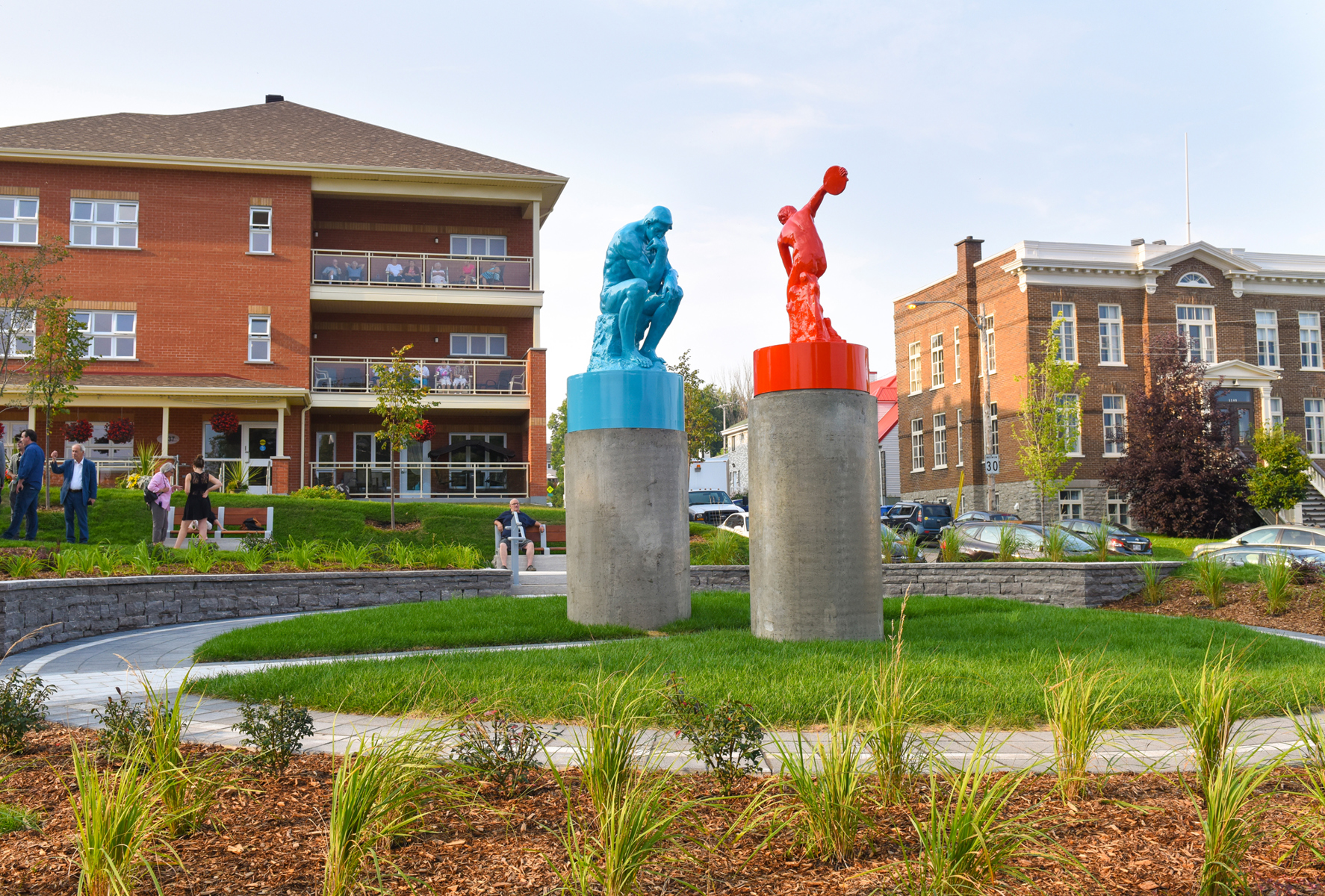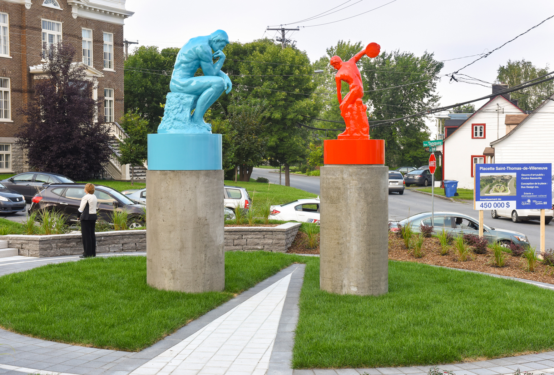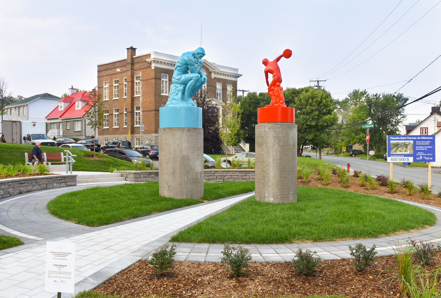 Cet ensemble sculptural met en relation deux œuvres emblématiques de l’histoire de l’art, Le penseur de Rodin et Le discobole de Myron. Les couleurs vibrantes et les socles de béton, tout comme la disposition dans l’espace, donnent aux sculptures une facture actuelle et accentuent en même temps leur pouvoir d’évocation.