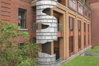 L’œuvre-miroir s’élance à partir d’un escalier extérieur. Elle reflète le mur de pierre qui lui fait face, pour suggérer à la fois la permanence et le caractère illusoire des choses. Les profils vides des nuages symbolisent la transformation et, en même temps, la liberté et la créativité.