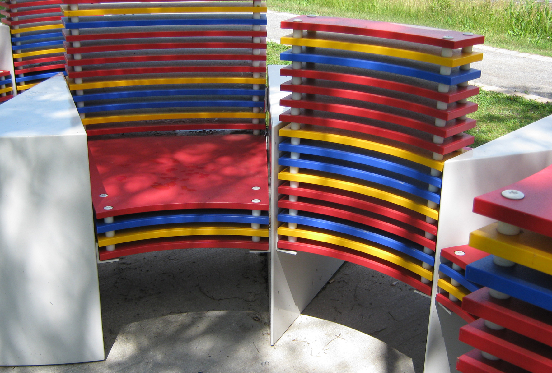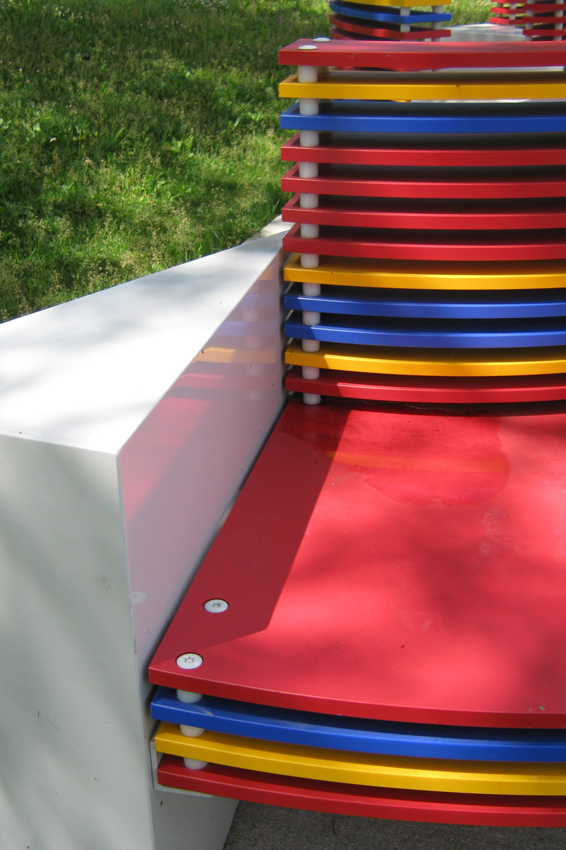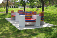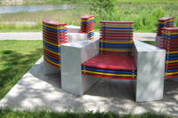 Colorée et ludique, la sculpture-banc réinterprète le confident, ce fauteuil ancien en forme de S où deux personnes peuvent s'asseoir en vis-à-vis. Les formes courbes ont été inspirées par les méandres de la rivière.
