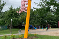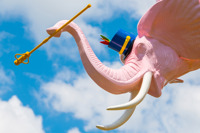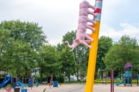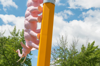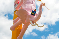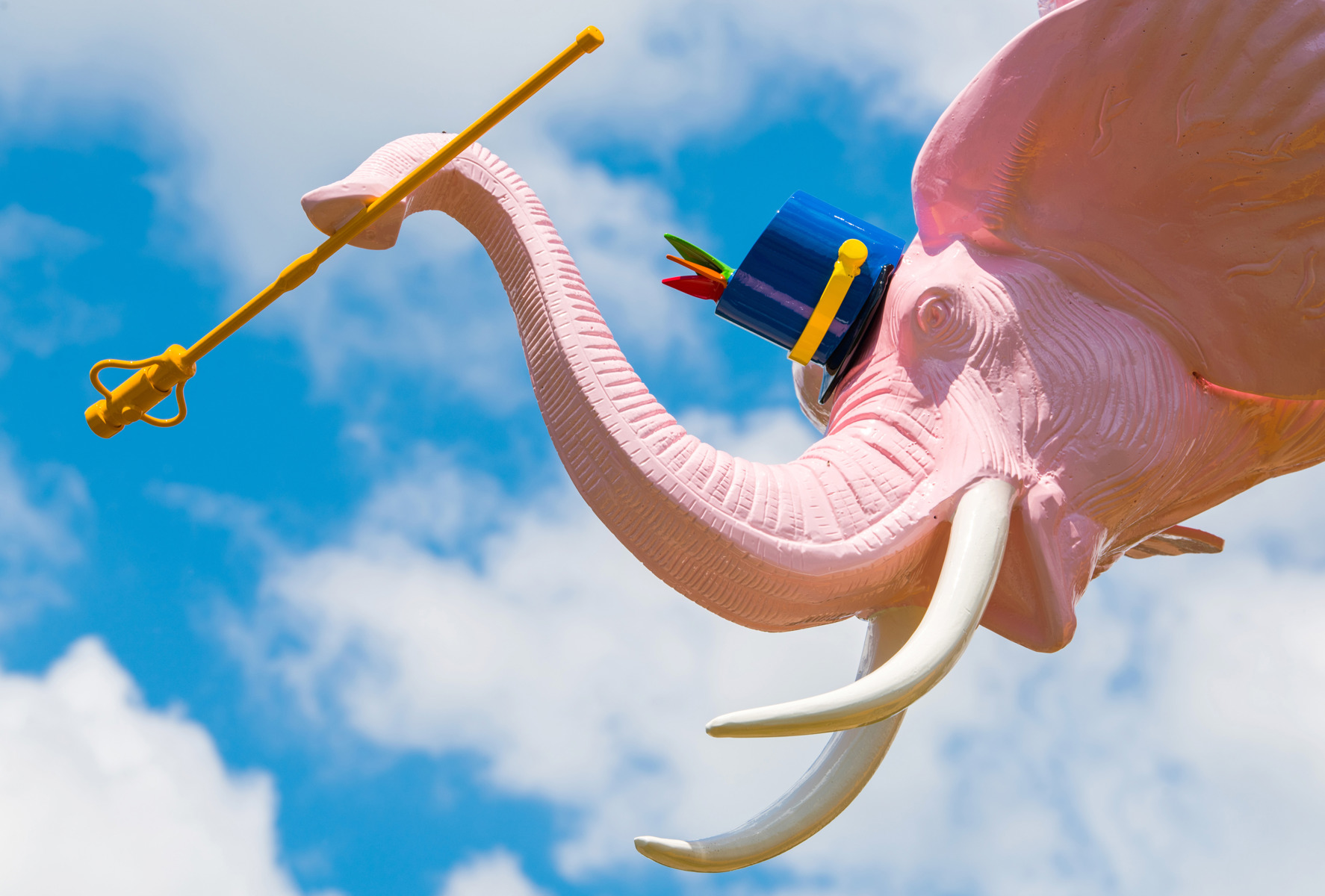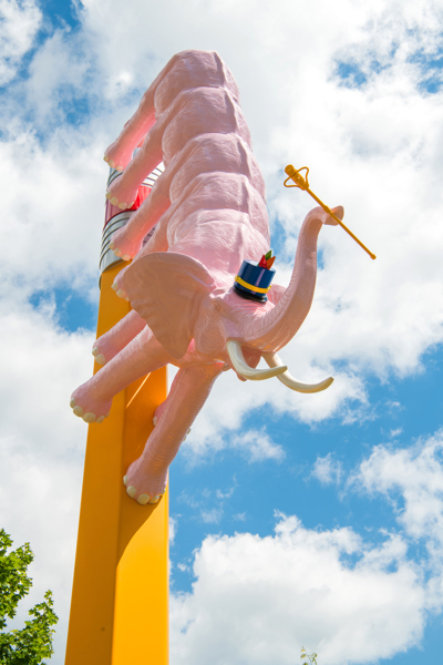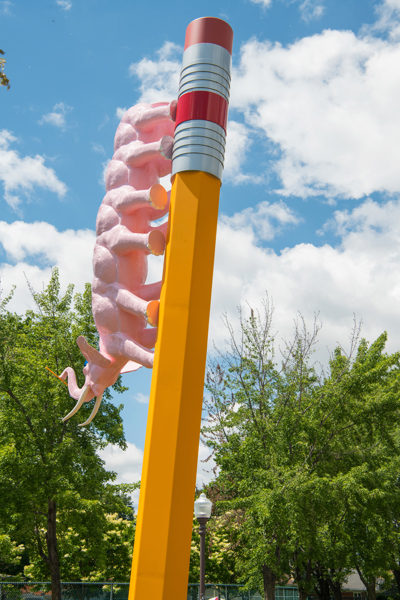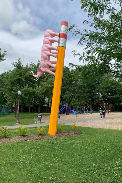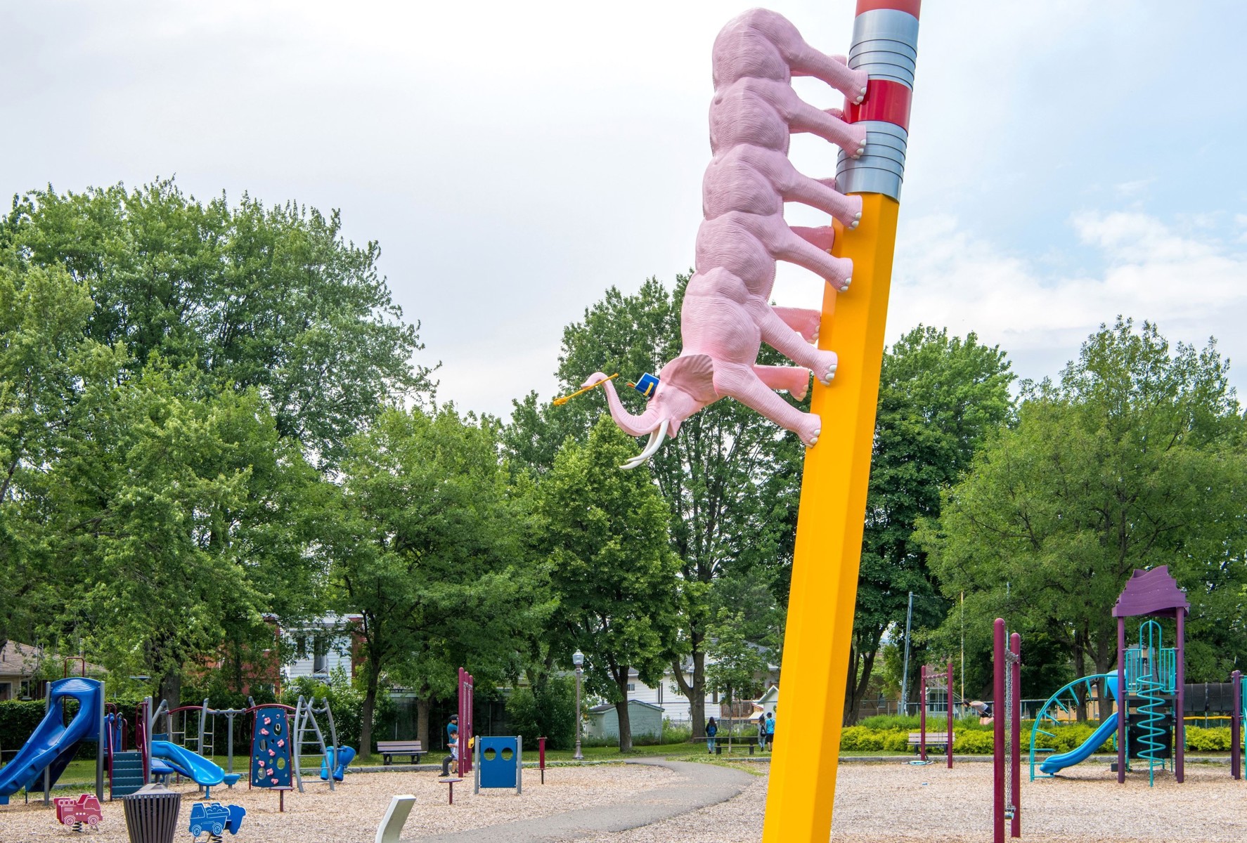 « Dessine-moi un mouton », implorait le Petit Prince. Cette chenille-éléphant l’aurait sûrement charmé! Coiffée d’une casquette de chef de fanfare, la créature rose trottine sur un crayon géant. L’outil symbolise l’éducation; l’éléphant, la sagesse; la chenille, la métamorphose. Leur rencontre improbable évoque le bonheur d’apprendre. Hommage à l’imagination enfantine, cette sculpture en aluminium peint est née d’une