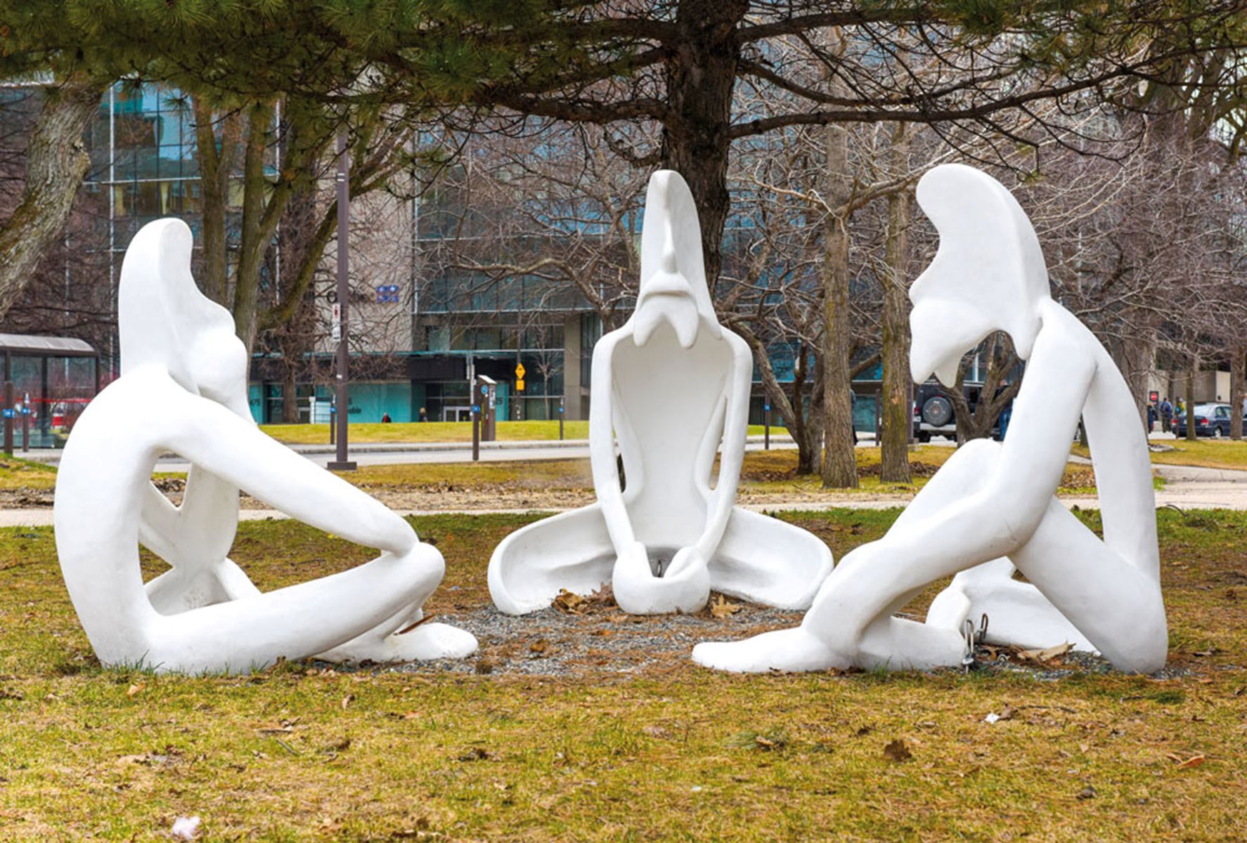 Sur le terrain du Grand Théâtre, trois sages assis en cercle semblent en pleine discussion. Mais l’atmosphère est au calme et à la réflexion plus qu’à la dispute. Fidèle à sa manière minimaliste, Lewis Pagé a exprimé en quelques traits bien accusés la profondeur de l’esprit humain.