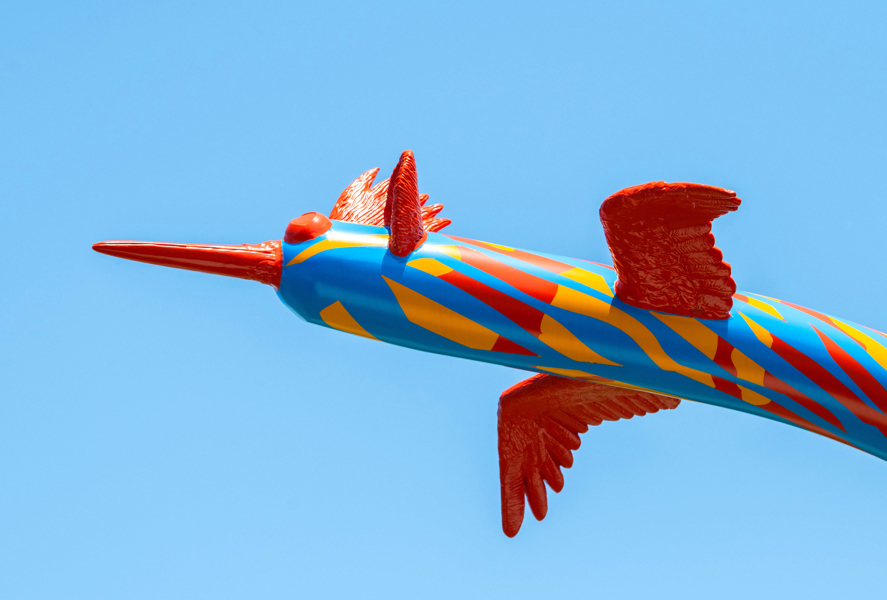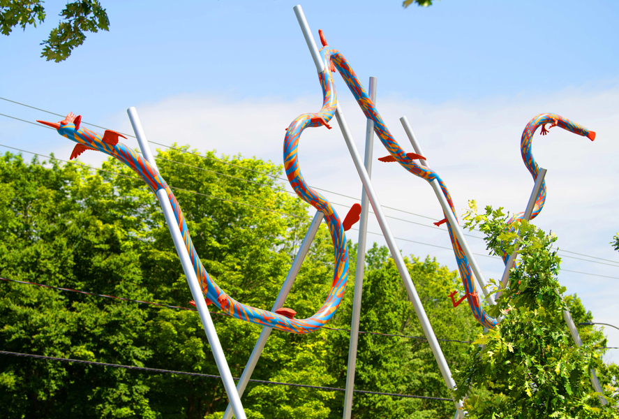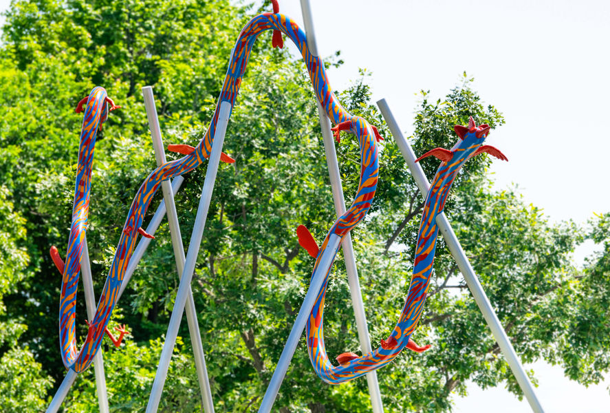 Du haut des airs, ce dragon contemporain convie le public à une escapade fantastique dans le parc. Sa danse enjouée évoque le simple plaisir d’aller bouger dehors. En créant des chimères du genre, l’artiste invite la nature en ville, plaidant ainsi pour une meilleure protection de la biodiversité.