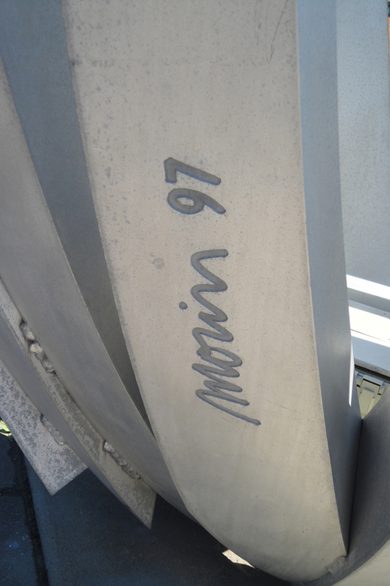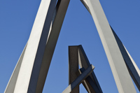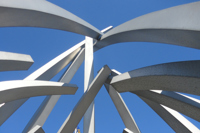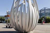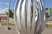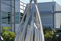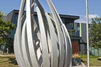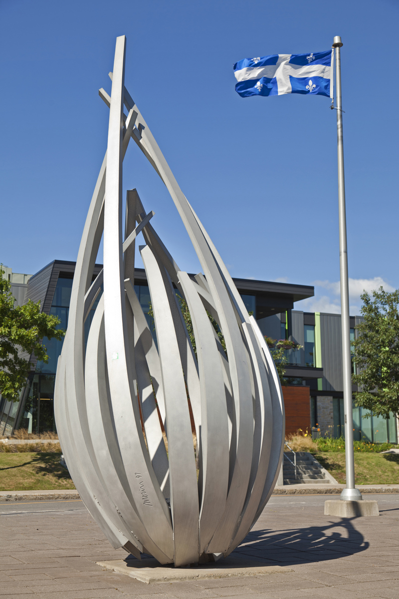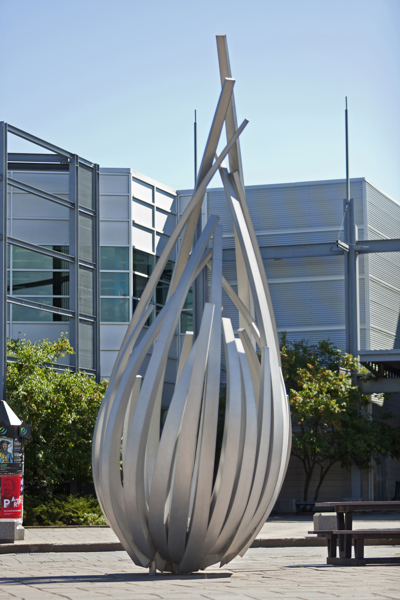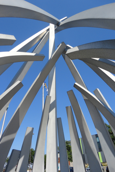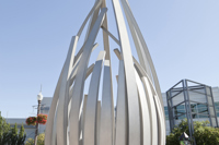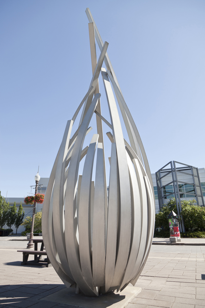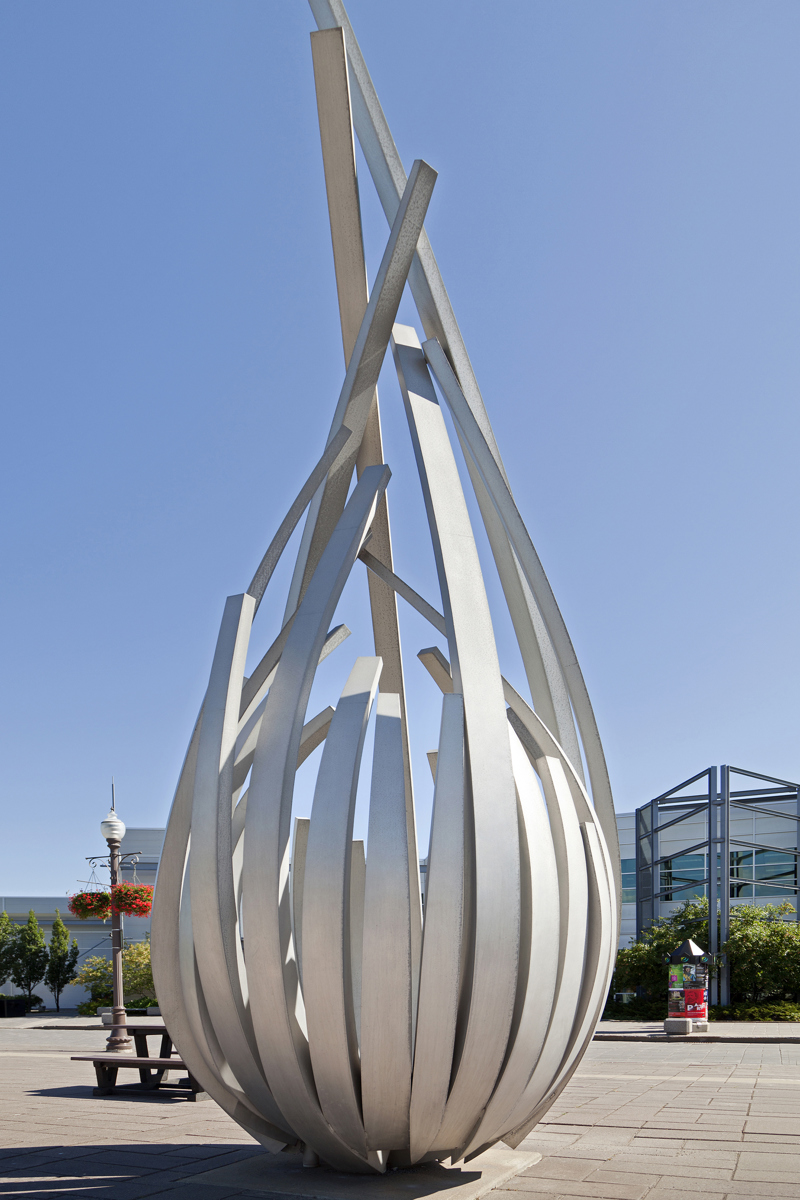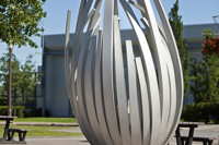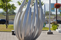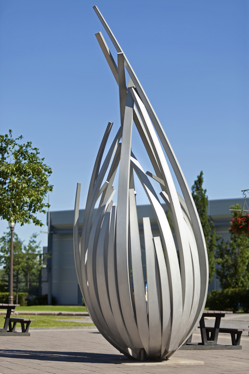 De loin, les grandes tiges de métal ressemblent à des bras jetés en l’air, prêts à célébrer à l’unisson un concert ou un événement sportif. Il faut s’approcher de la structure en aluminium pour prendre conscience d’une autre dimension de l’œuvre. On peut alors y distinguer un nid ou une corolle protectrice, abritant un être en devenir.
