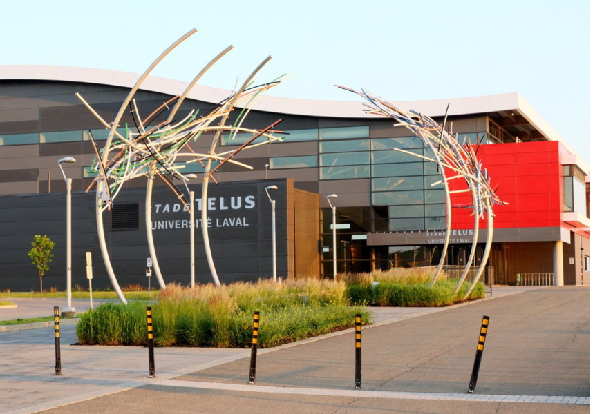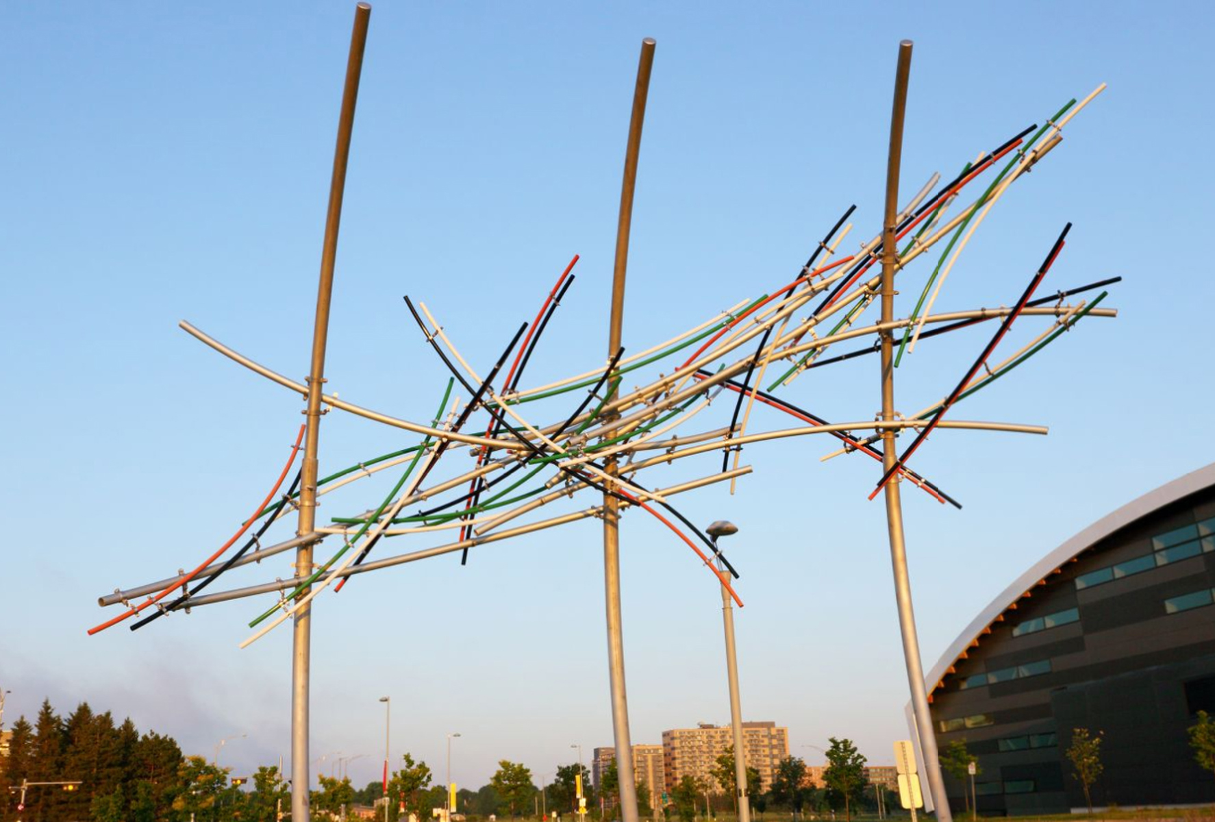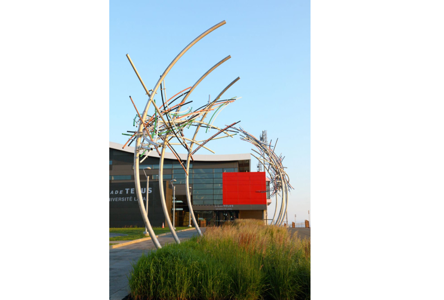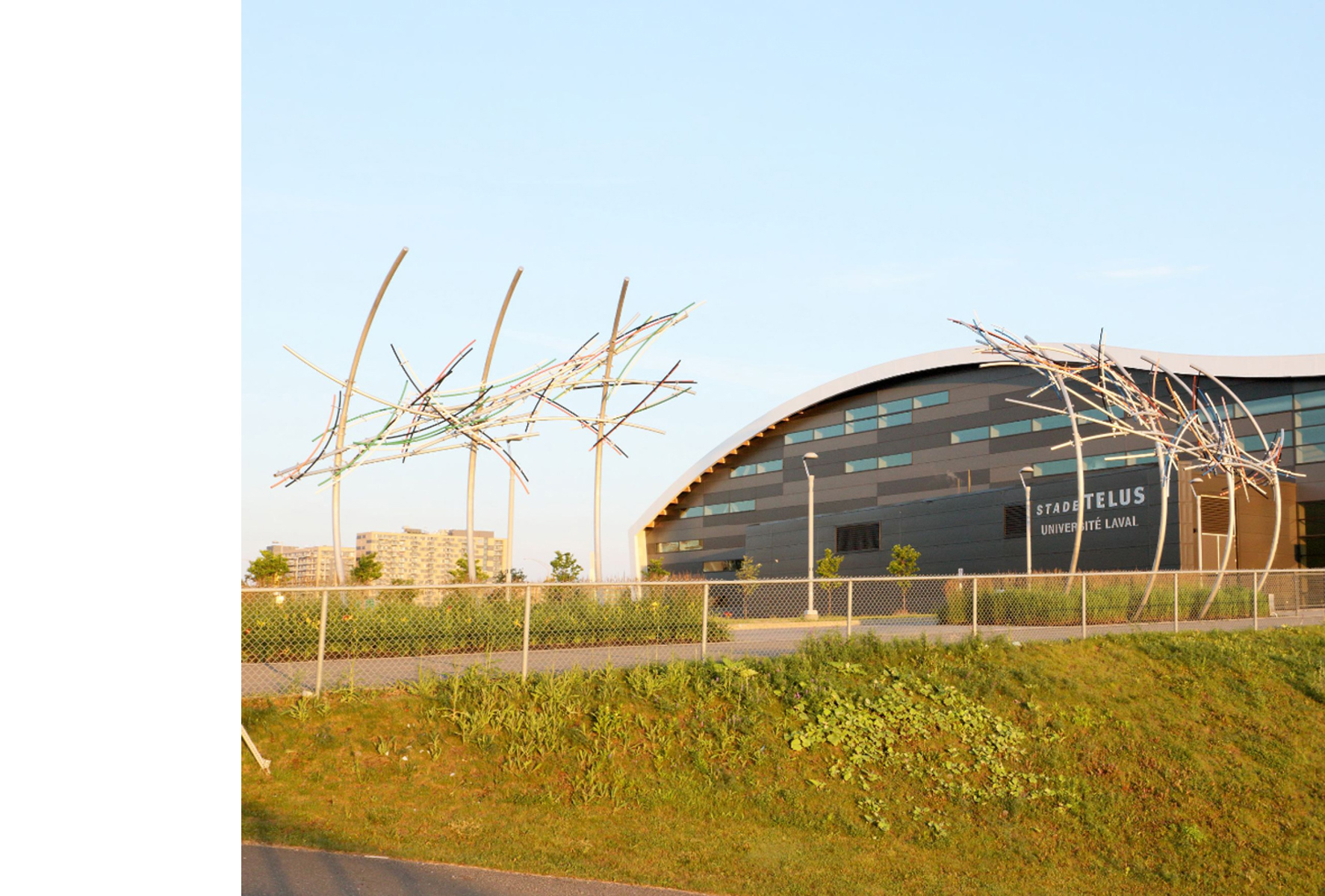 Cette figure est polarisée en deux mouvements, à la fois similaires et inversés, qui se déploient, tel un élan vital, en une zone de convergence ascendante qui atteint son sommet au centre de l’installation. L’implantation est conçue de manière à placer les deux éléments principaux de l’installation en opposition pour former un axe sinueux qui assouplit la linéarité de la promenade menant à l’entrée principale du bâtiment et au stade. Cette configuration s’intègre de façon organique à la fluidité de la circulation des piétons ainsi qu’à l’architecture du Complexe multisports.