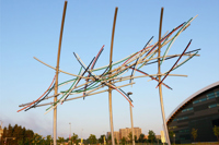 L’installation est constituée de deux alignements d’arcs porteurs auxquels sont attachés des tubes d’aluminium transversaux, également courbés, et qui, à leur tour, portent une multitude d’arcs colorés de plus petites dimensions. Ce foisonnement de coloris génère, de part et d’autre, un mouvement dynamique qui, au premier coup d’œil, insuffle à l’œuvre la figure d’une lancée, d’une impulsion.