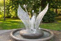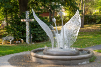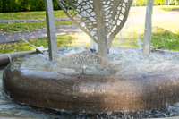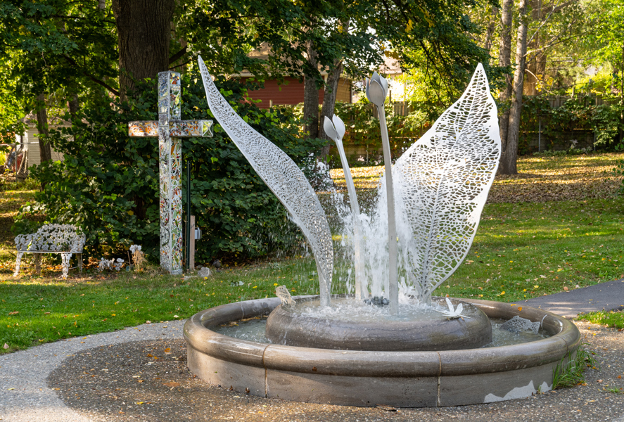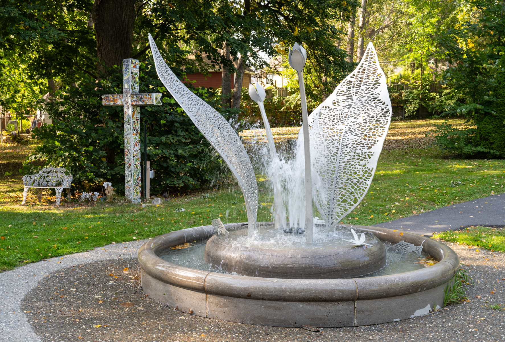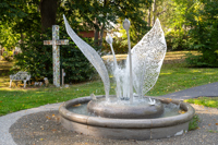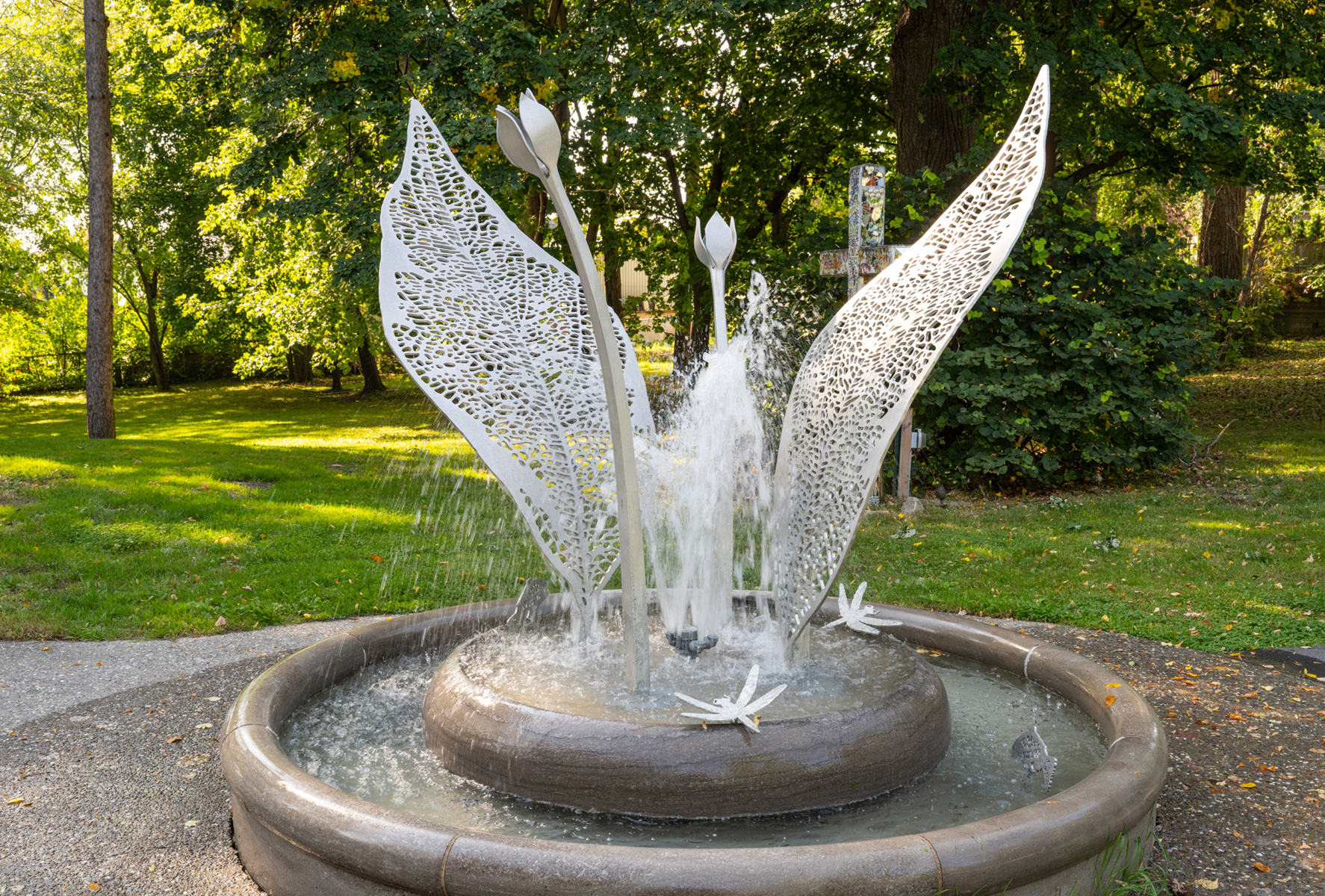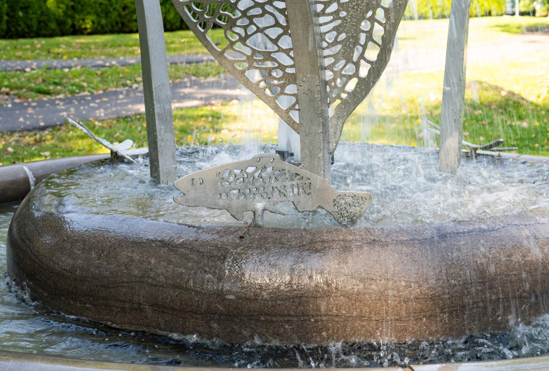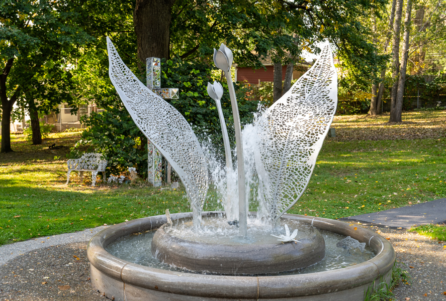 La sculpture-fontaine, réalisée dans le cadre de la Politique d’intégration des arts à l’architecture et à l’environnement, s’intègre harmonieusement à l’aménagement boisé tout en créant un lieu propice à la rencontre.