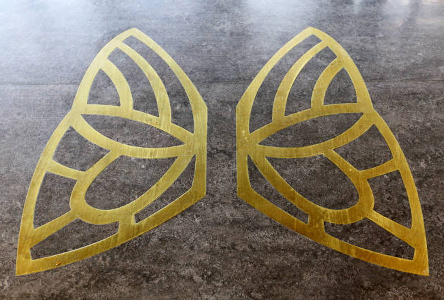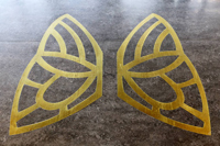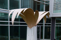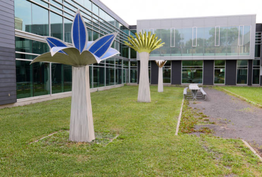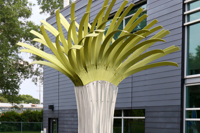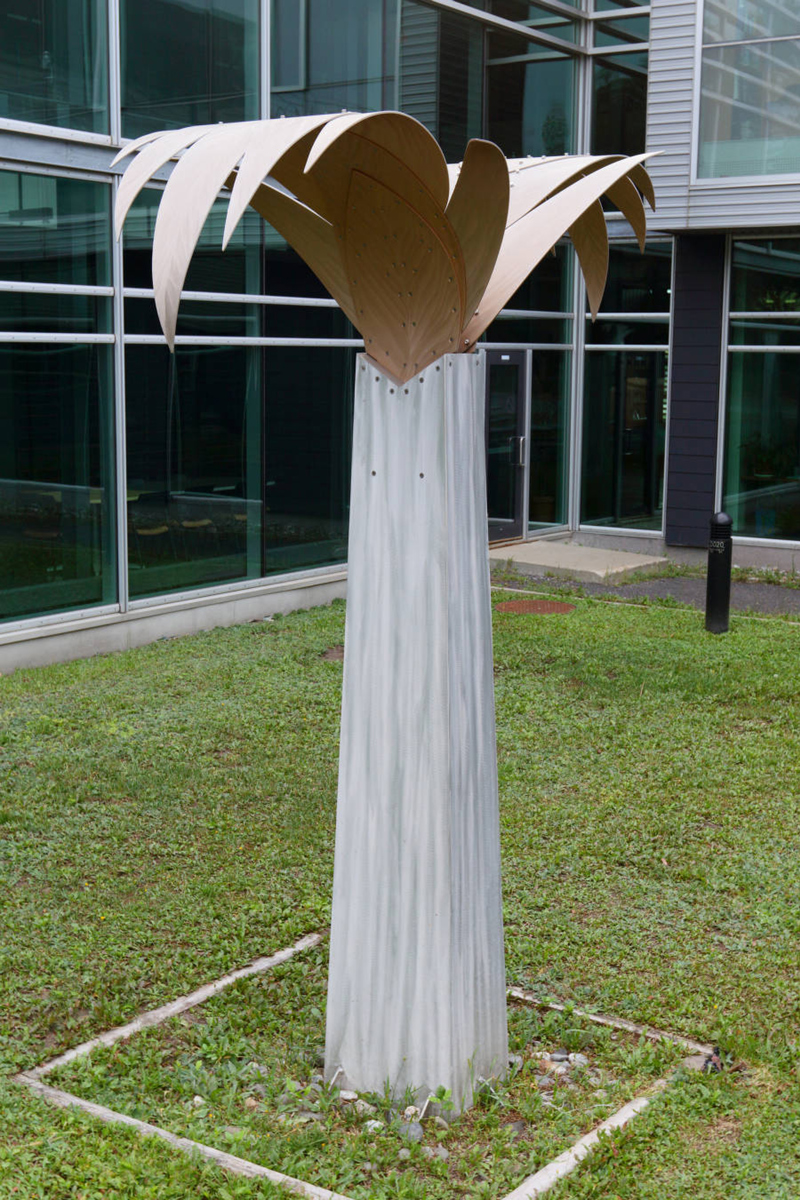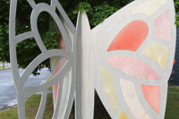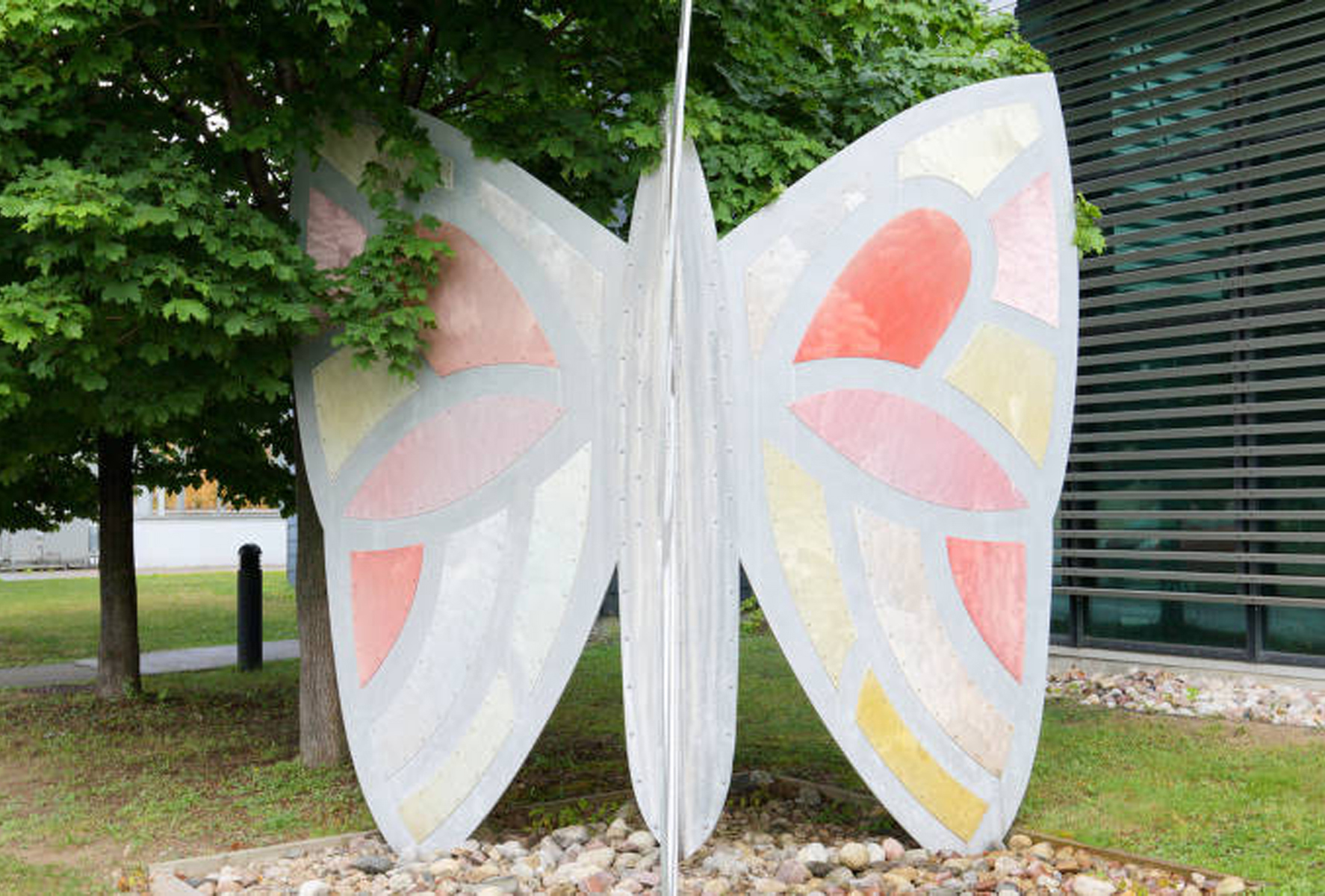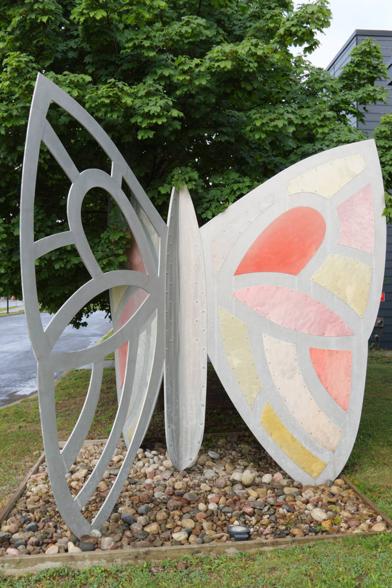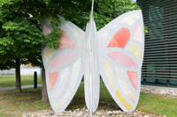 La sculpture représente cinq formes distinctes. La première forme est un papillon qui représente une étape de la chaîne alimentaire. Il s'agit d'un lépidoptère qui surprend par sa force et sa fragilité, mais surtout par sa beauté. Il a trois ailes dont une montre sa structure et fait penser à une dentelle et aux merveilles de la nature. La seconde forme, incrustée au sol, reprend le dessin des ailes du premier papillon. Elle fait le lien entre la première forme et le jardin situé à l'arrière du bâtiment.