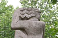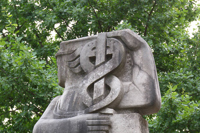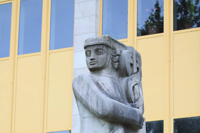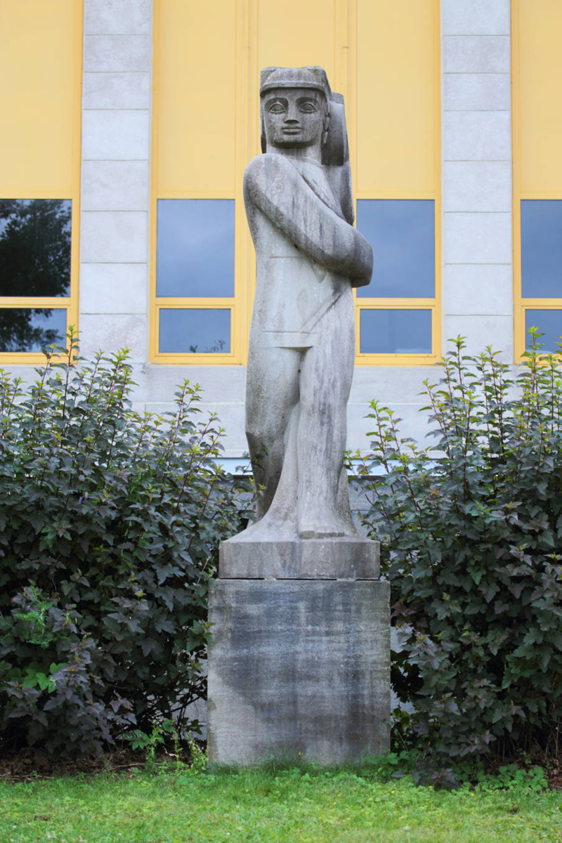 La sculpture représente Hermès, le dieu grec du commerce. Il est représenté comme un jeune homme debout, la tête de face, le corps de profil, les jambes de face et le pied gauche en avant. Il est accompagné de trois de ses attributs: il porte un casque et des sandales ailés et tient dans ses mains le caducée, c'est-à-dire un bâton ailé entouré de deux serpents, symbole du commerce.