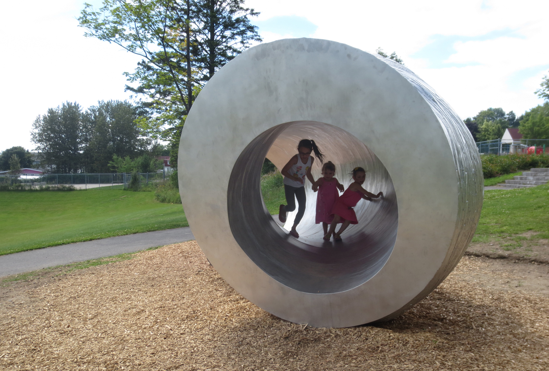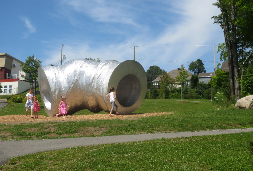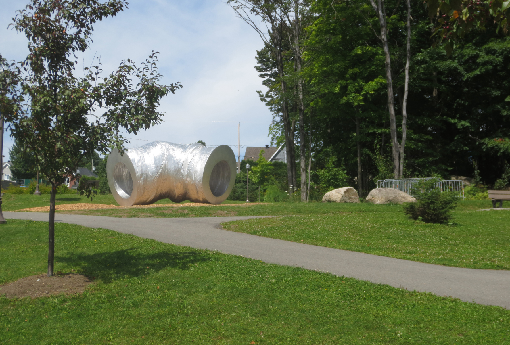 À la fois installation ludique et œuvre d’art, cette sculpture est le fruit d’une collaboration exceptionnelle entre un artiste et un groupe d’enfants de quatre et cinq ans de l’Atelier communautaire Saint-Émile. La forme de l’œuvre, inspirée de l’imaginaire des petits, invite à s’y glisser comme dans un tunnel. L’artiste l’a revêtue de lattes d’aluminium qui multiplient les jeux de texture et de lumière. Les enfants sont fiers d’y accourir en s’écriant : « Hey papa, t’as-tu vu notre stucpture ? »