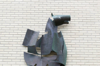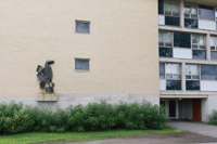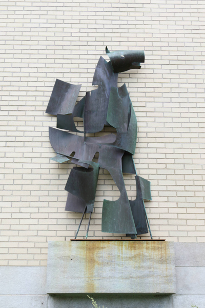 La sculpture représente un hippogriffe soit cet animal fantastique, moitié cheval, moitié griffon, tiré des romans médiévaux de chevalerie.