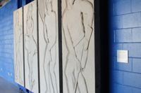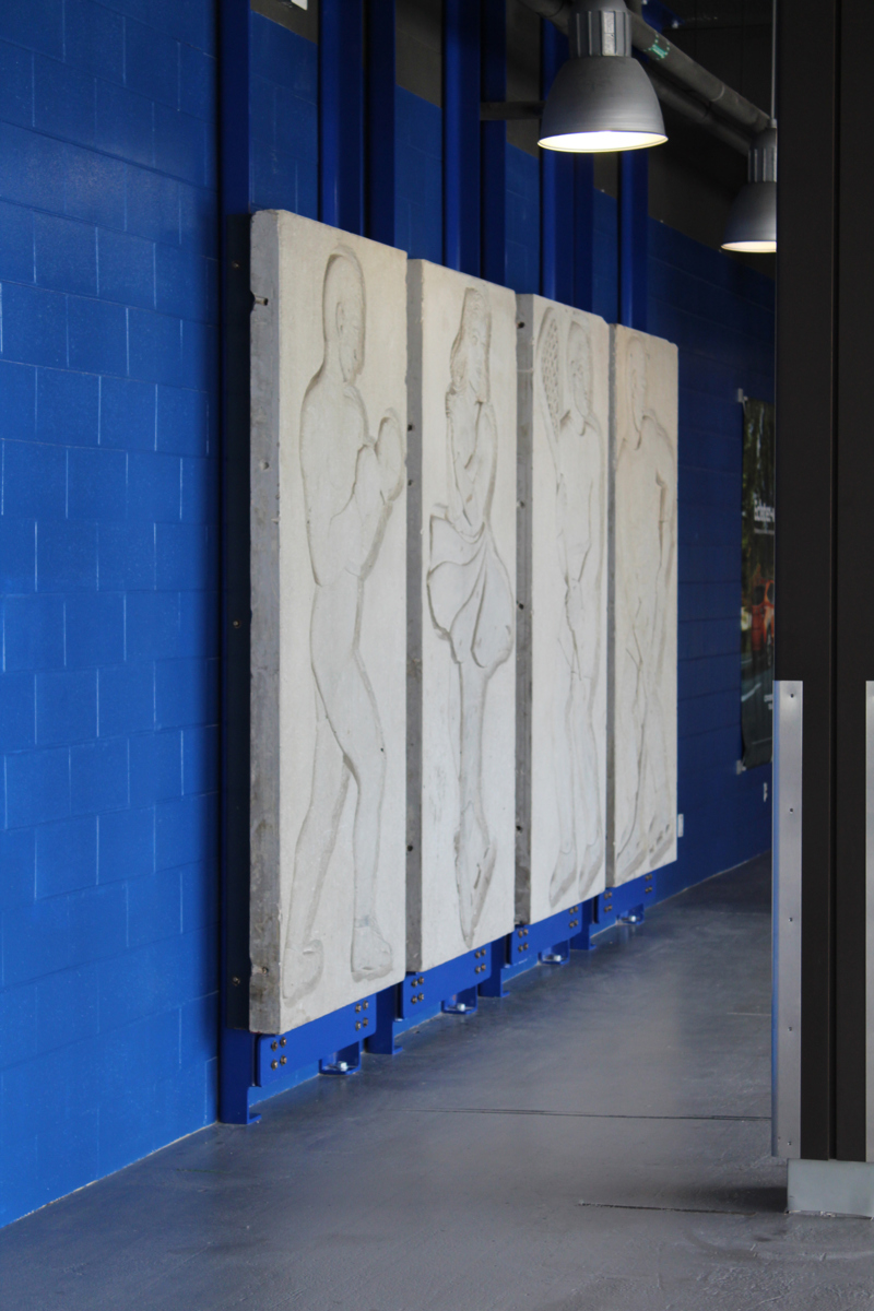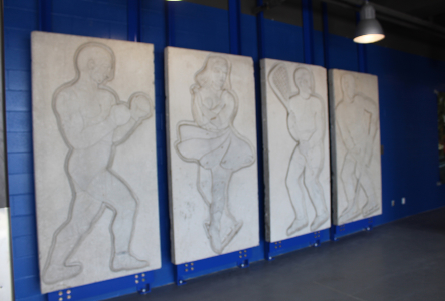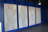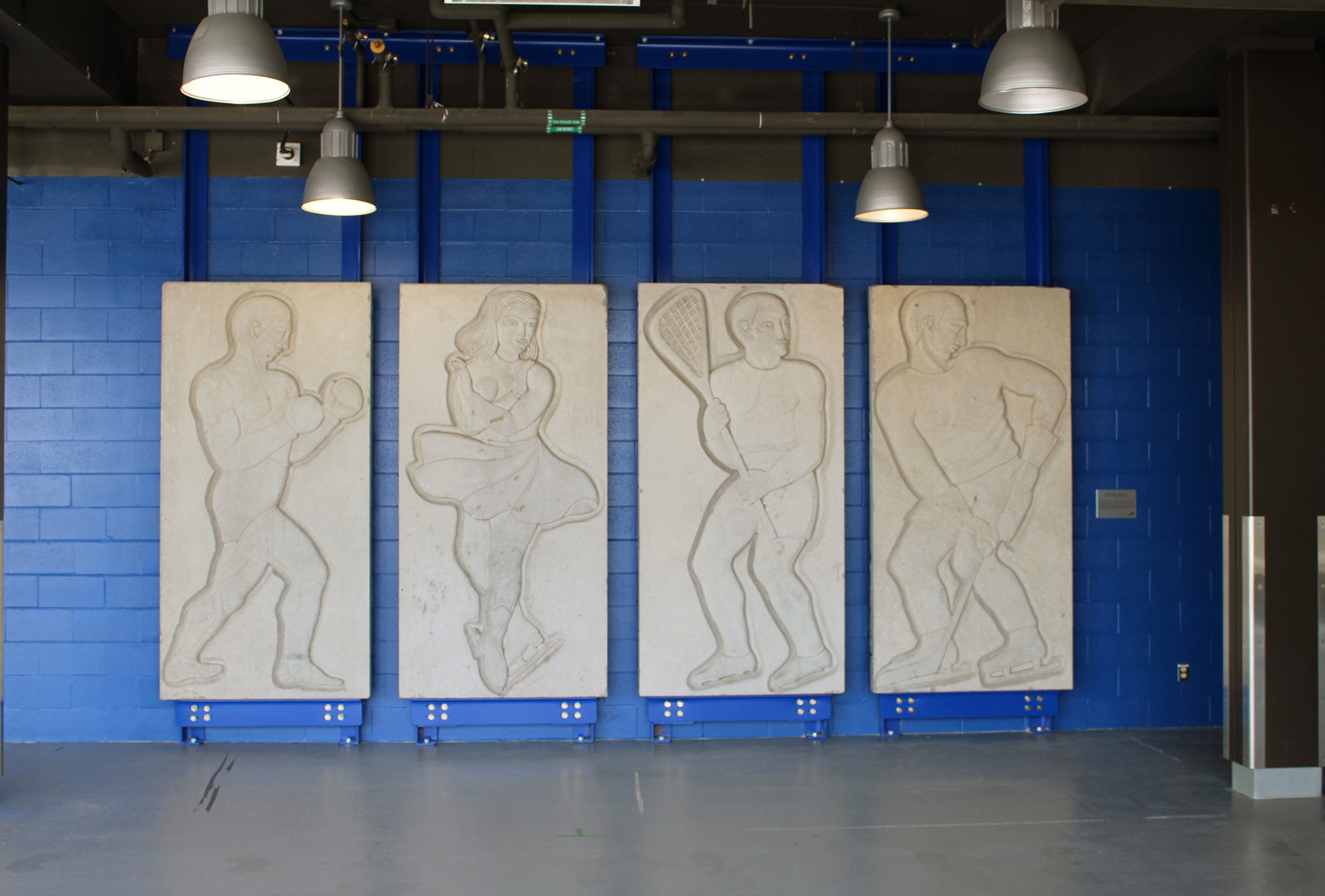 Ces bas-reliefs illustrent quatre activités populaires à Québec : la boxe, le patinage artistique, la crosse et le hockey. Ils ont été réalisés en 1950 pour orner le Colisée de Québec, construit l’année précédente. Intégrés à la façade du bâtiment, les bas-reliefs ont été déplacés dans le hall en 1981 lors de l’agrandissement du Colisée, puis réinstallés au Pavillon de la jeunesse en 2020. Les œuvres, en calcaire de la région du Niagara, sont attribuées à Raymond Delwaide, sculpteur sur pierre de l’entreprise de Québec Delwaide et Goffin Inc.