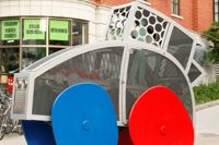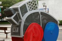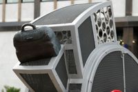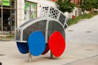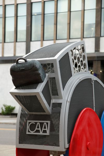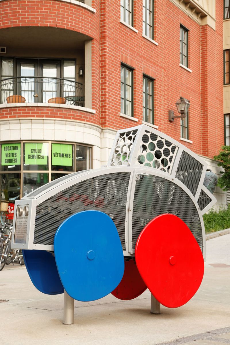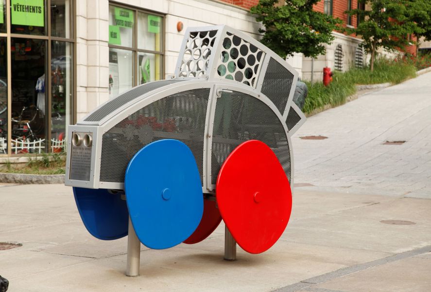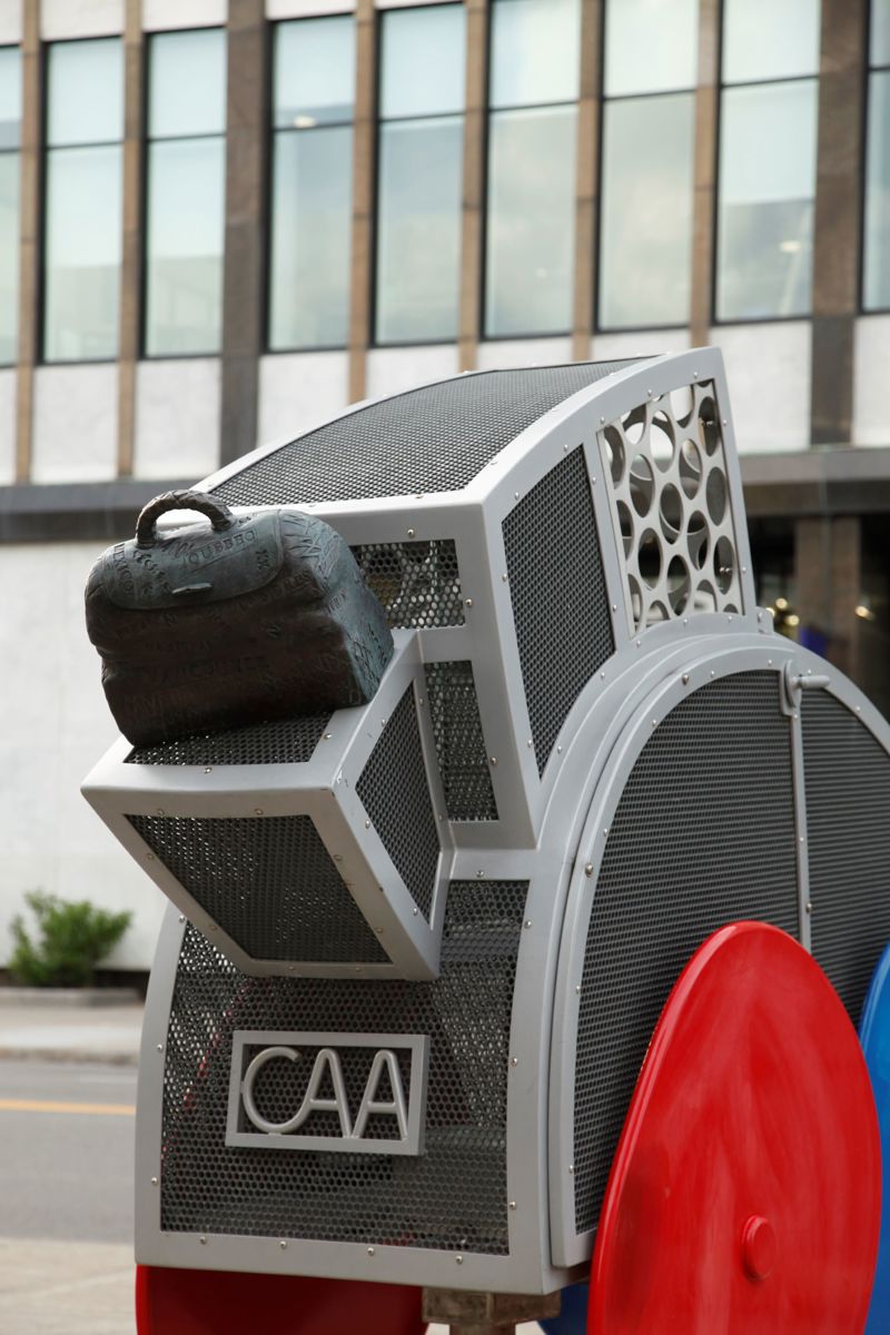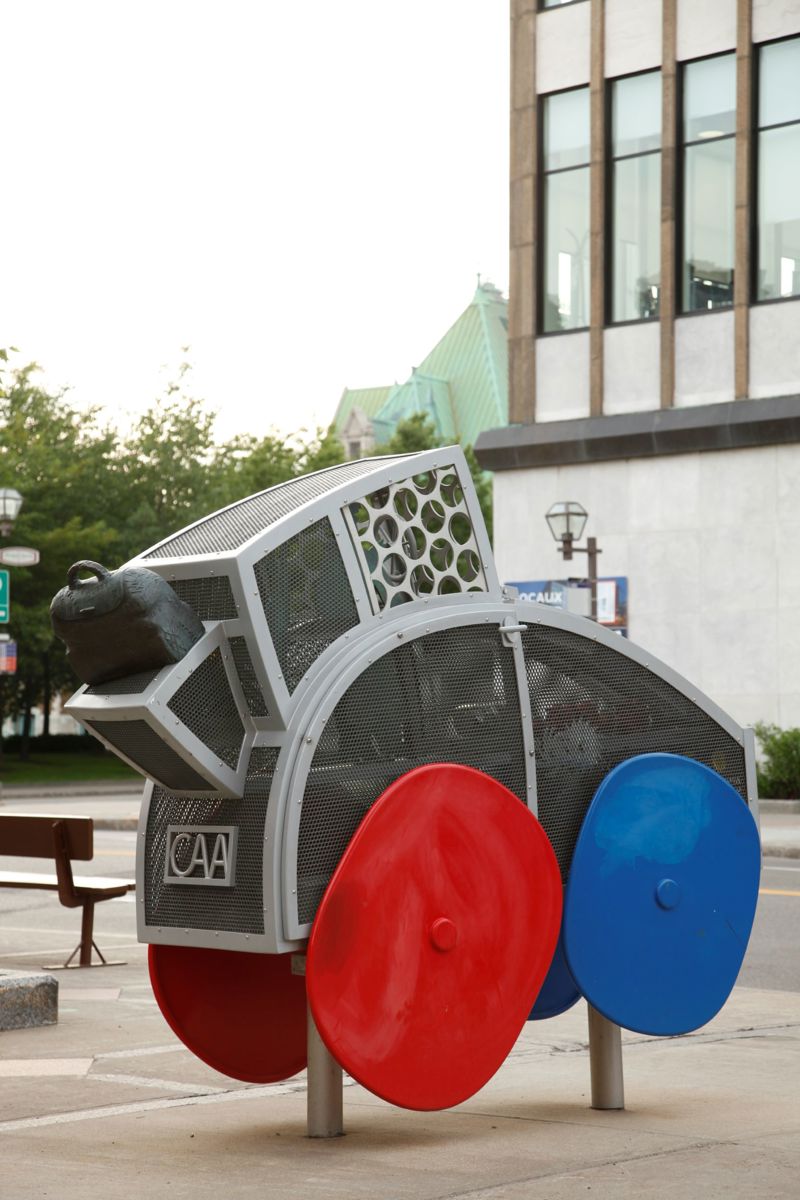 Cette voiture fantaisiste aux formes arrondies et aux couleurs vives semble tout droit sortie de l’imagination d’un enfant. Trois passagers y prennent place, leur valise déposée à l’arrière. Le moteur est constitué d’un ingénieux assemblage de pièces authentiques. L’œuvre est un don de CAA-Québec.