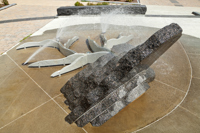 « Je vous entends rêver, douce comme rivière ». Extraite de la chanson Les gens de mon pays, de Gilles Vigneault, cette phrase a inspiré le titre de la sculpture-fontaine. L’œuvre est composée de deux masses de granit sombre aux formes irrégulières simulant le mouvement de la croûte terrestre qui a donné naissance au paysage environnant. À leur base émergent des lames d’aluminium brillant qui ondulent en tous sens, telles les rivières qui parcourent le territoire.
