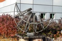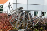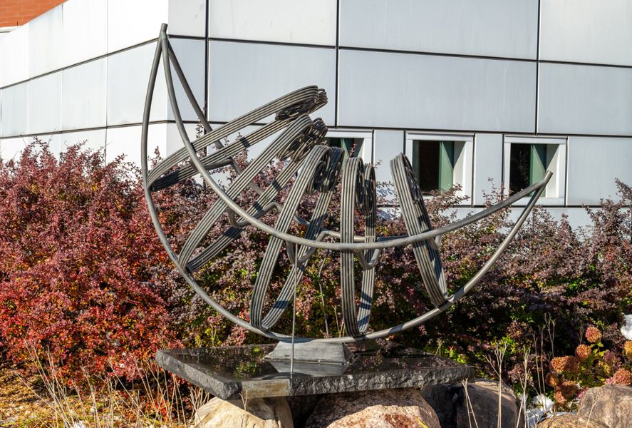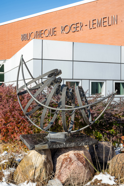 Cette sculpture qui allie le laiton et le granit orne l’entrée de la bibliothèque. Elle emprunte la forme des membrures d’un navire, rappelant que l’anse du Cap Rouge a abrité au 19e siècle un chantier de construction navale.