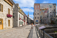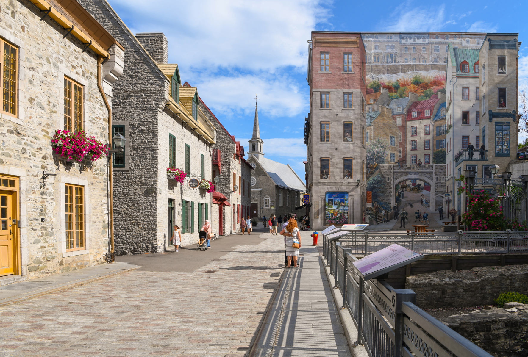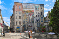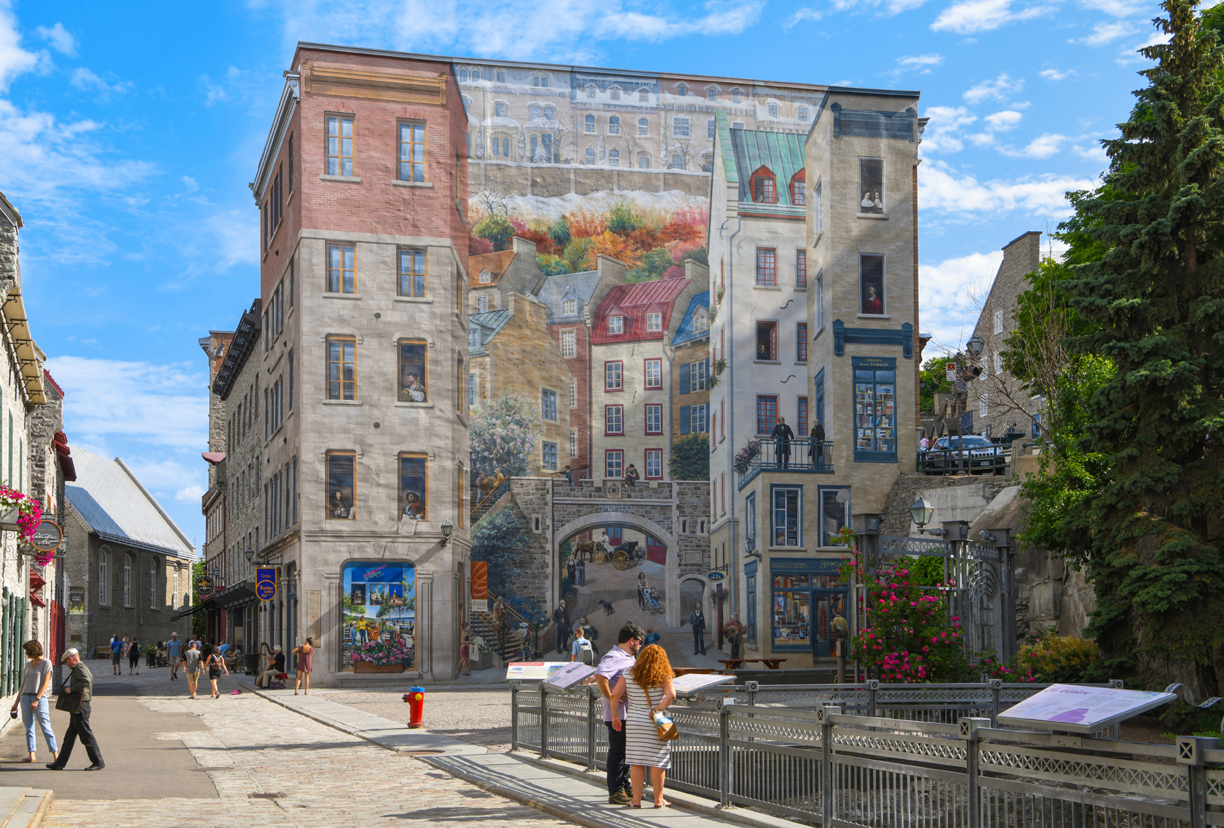 Cette fresque en trompe-l’œil, en plus de rendre hommage à des personnages historiques, met en relief les caractéristiques spécifiques de Québec : son architecture, ses fortifications, ses escaliers, etc.