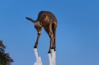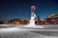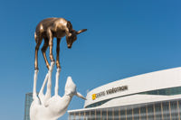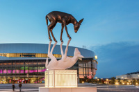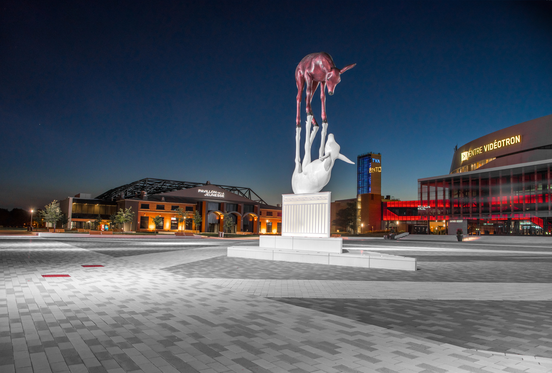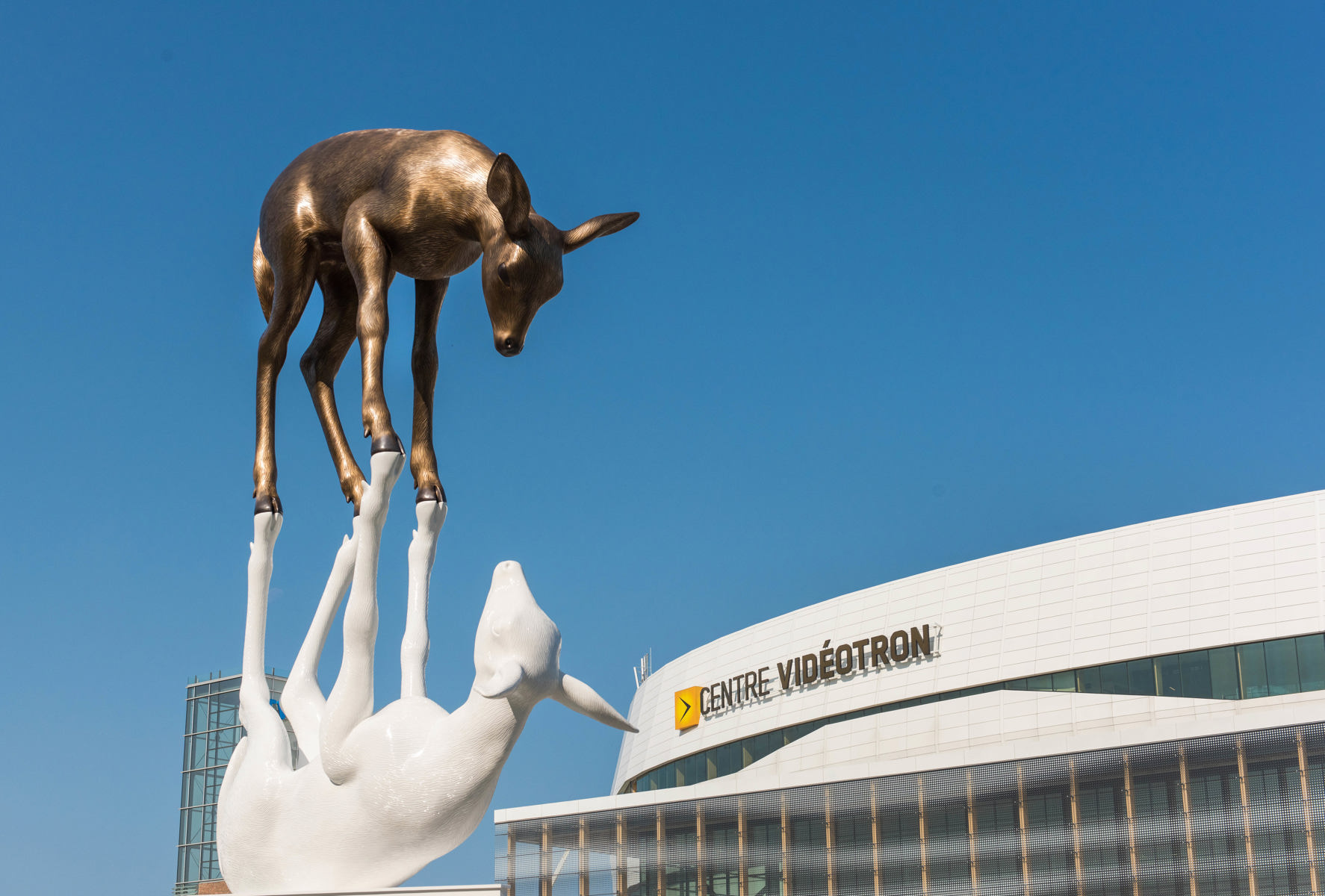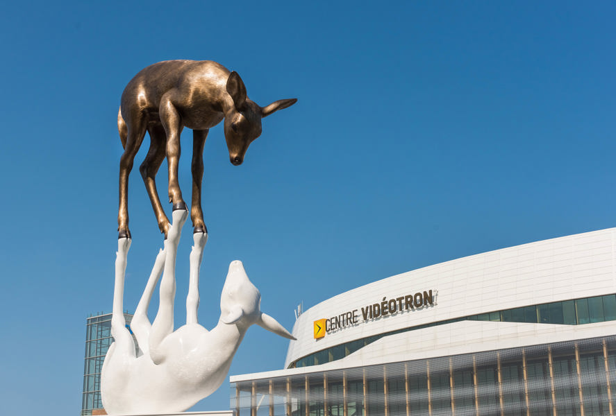 Monumentale, cette rencontre improbable fait tourner les têtes sur la place Jean-Béliveau. La sculpture de bronze de plus de 11 mètres de haut met-elle en scène un cerf penché sur son reflet? Ou un face-à-face avec autre cerf? Sa présence rappelle que la forêt n’est pas si loin de la ville de Québec. Le socle comporte un motif en lame de patin inspiré des rambardes d’escalier traditionnelles du quartier.