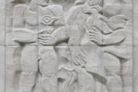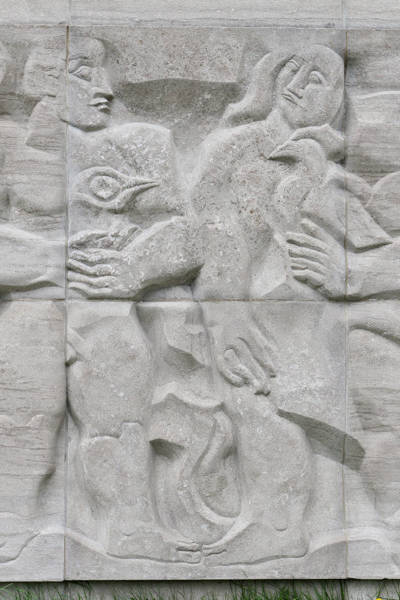 La sculpture représente deux personnages debout et semblent être en santé. À gauche, un personnage masculin tient entre ses mains ce qui semble être un oiseau, possiblement une corneille, laquelle est associée à Coronis, la mère d'Asclépios, dieu grec de la médecine. À droite, un personnage féminin tient sur son bras gauche un coq, un des attributs d'Asclépios qui symbolise la lumière naissante, le jour nouveau, le renouvellement ou encore la résurrection.
