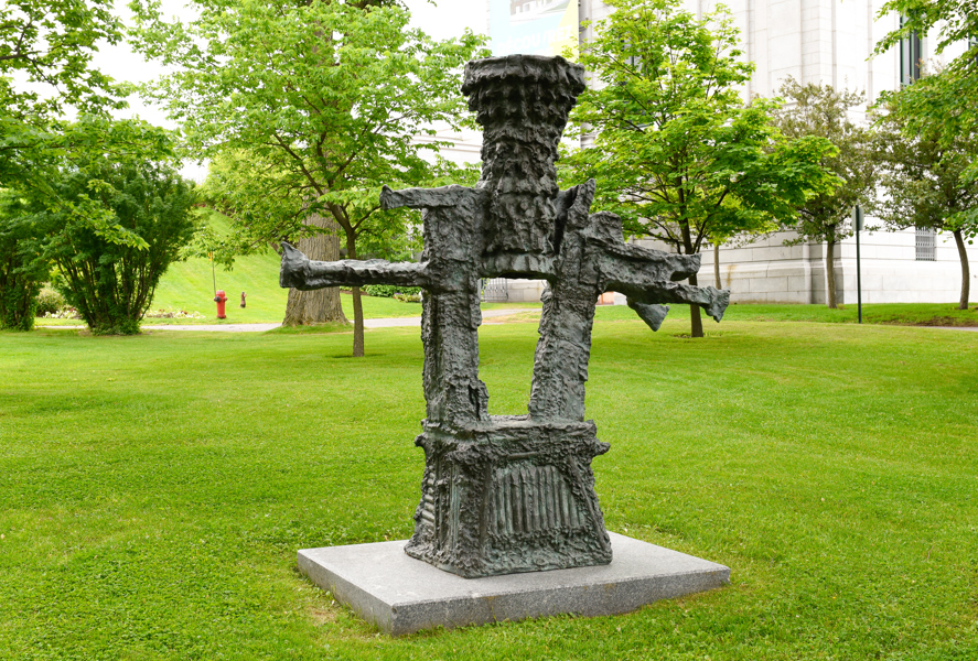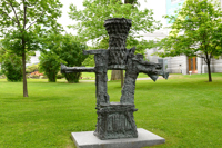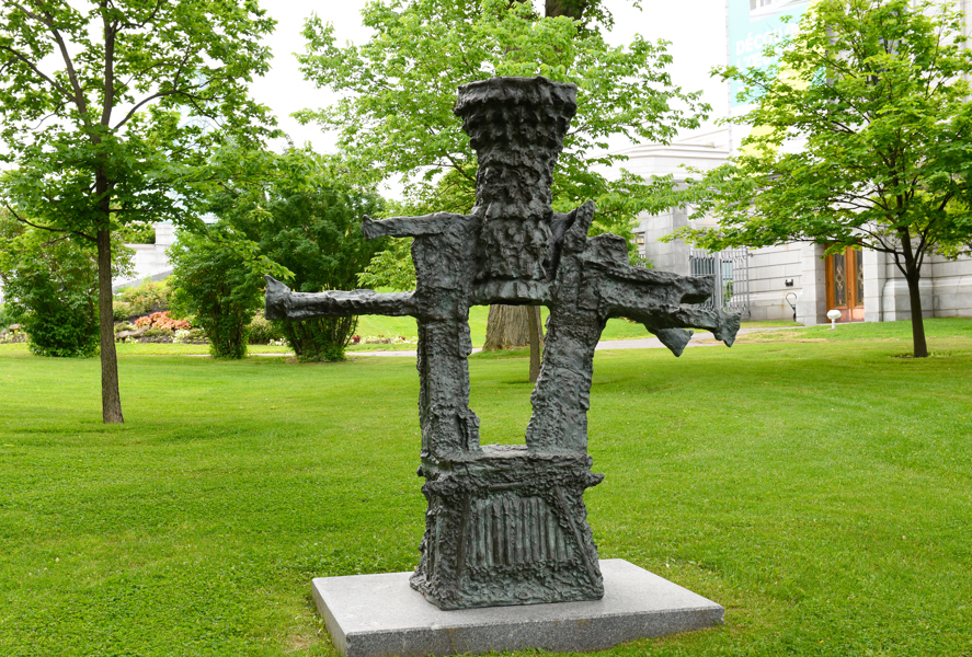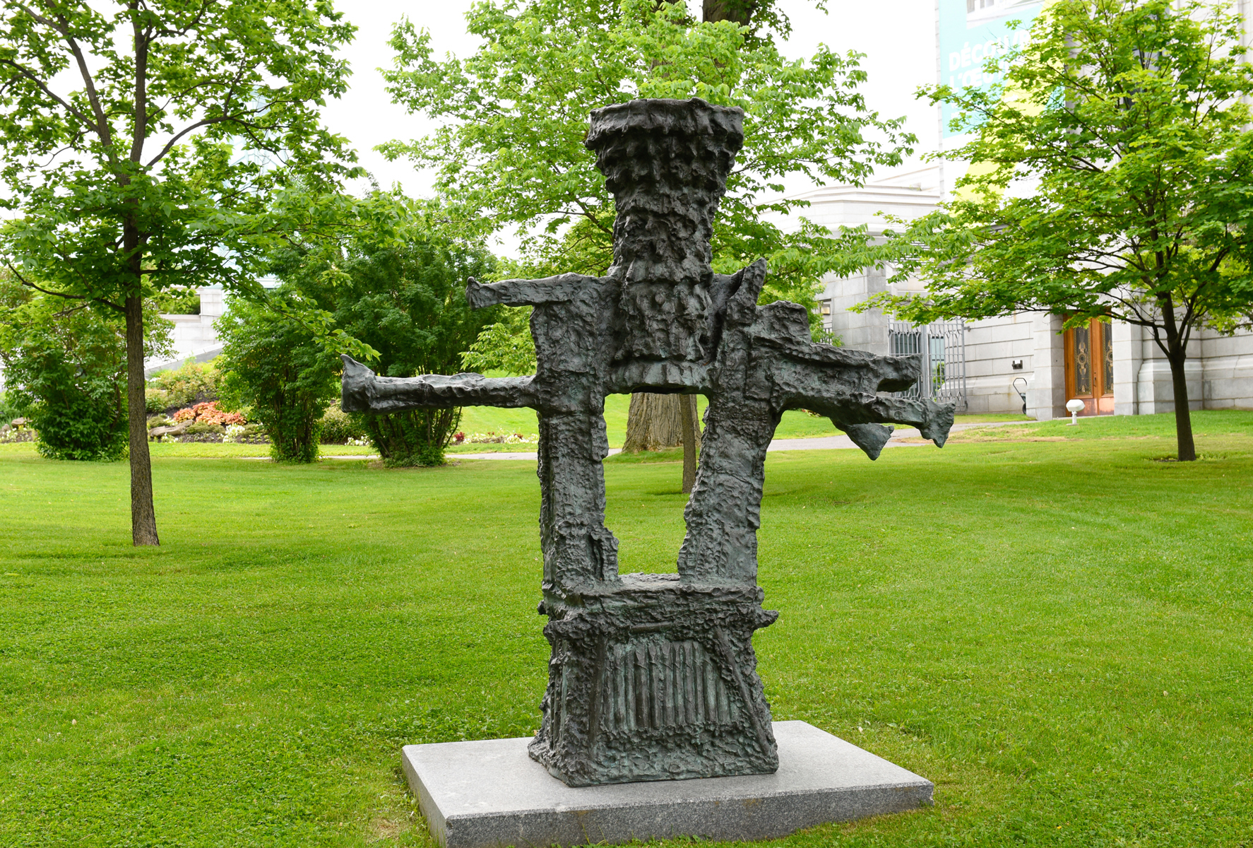 Cette sculpture monumentale dresse sa silhouette couronnée, tel un colosse campé sur son socle qui en appellerait aux forces de la nature. Figure totémique, elle se présente comme la déesse-mère abritant en son sein les hiboux emblématiques qui hantent l’univers de Riopelle. L’œuvre est issue d’un ensemble sculptural, La joute, exécuté en glaise en 1969-1970.