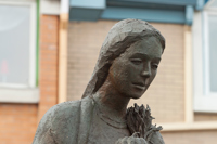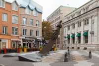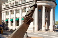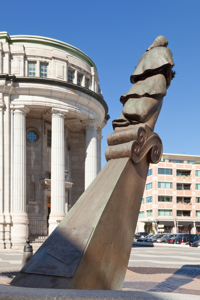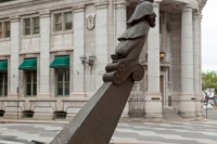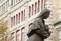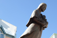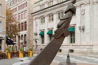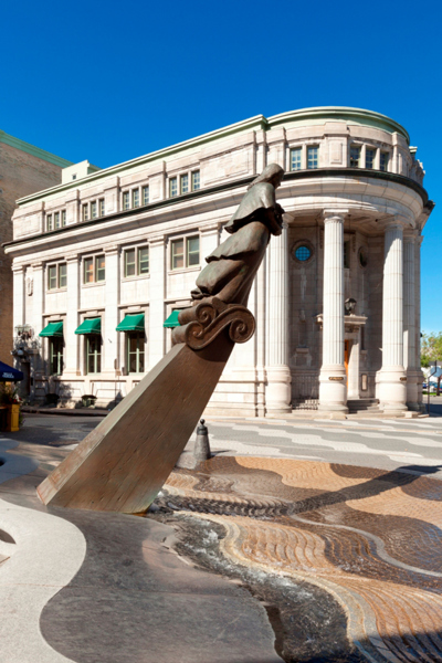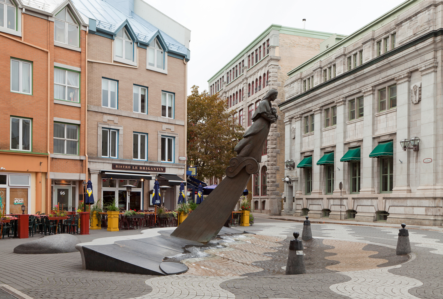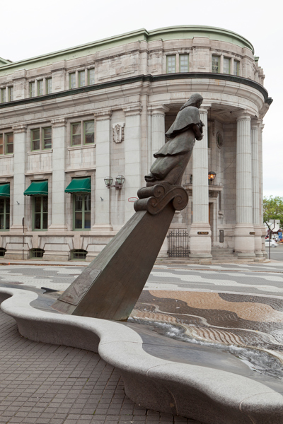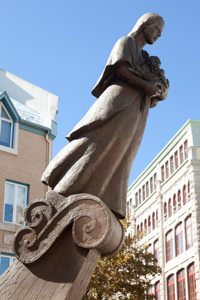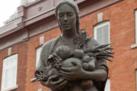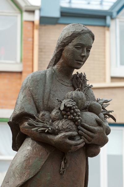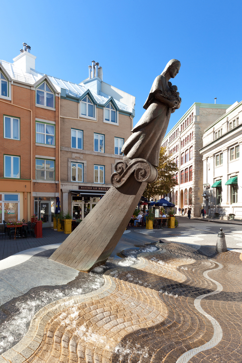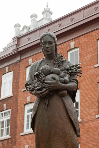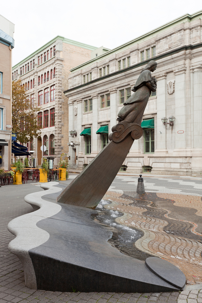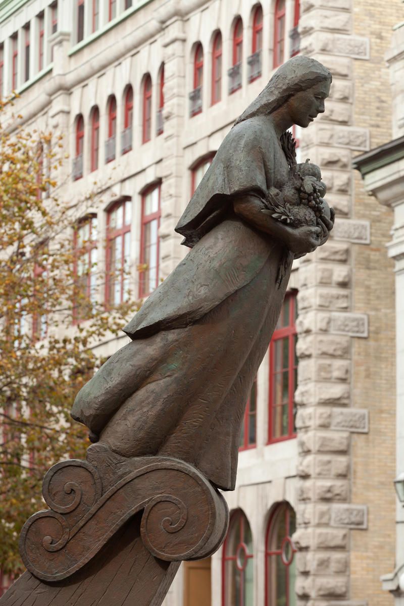 Évoquant une figure de proue, le personnage de cette sculpture-fontaine tient dans ses bras des aliments issus des quatre coins du monde. À ses pieds, des jets d’eau et des pavés dessinant des ondulations simulent les vagues du fleuve, par où transitent les navires chargés de produits de toutes sortes.