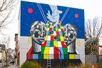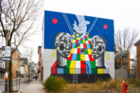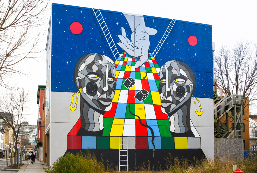 À la jonction de Saint-Roch et du Vieux-Limoilou, on peut admirer cette murale où deux entités personnifiant les quartiers s’adonnent à un jeu de serpents et échelles. Ce n’est pas tant la rivalité qui les caractérise, mais bien l’observation attentive de la partie, symbole de l’évolution et du dynamisme de la vie urbaine.