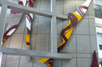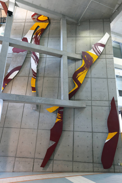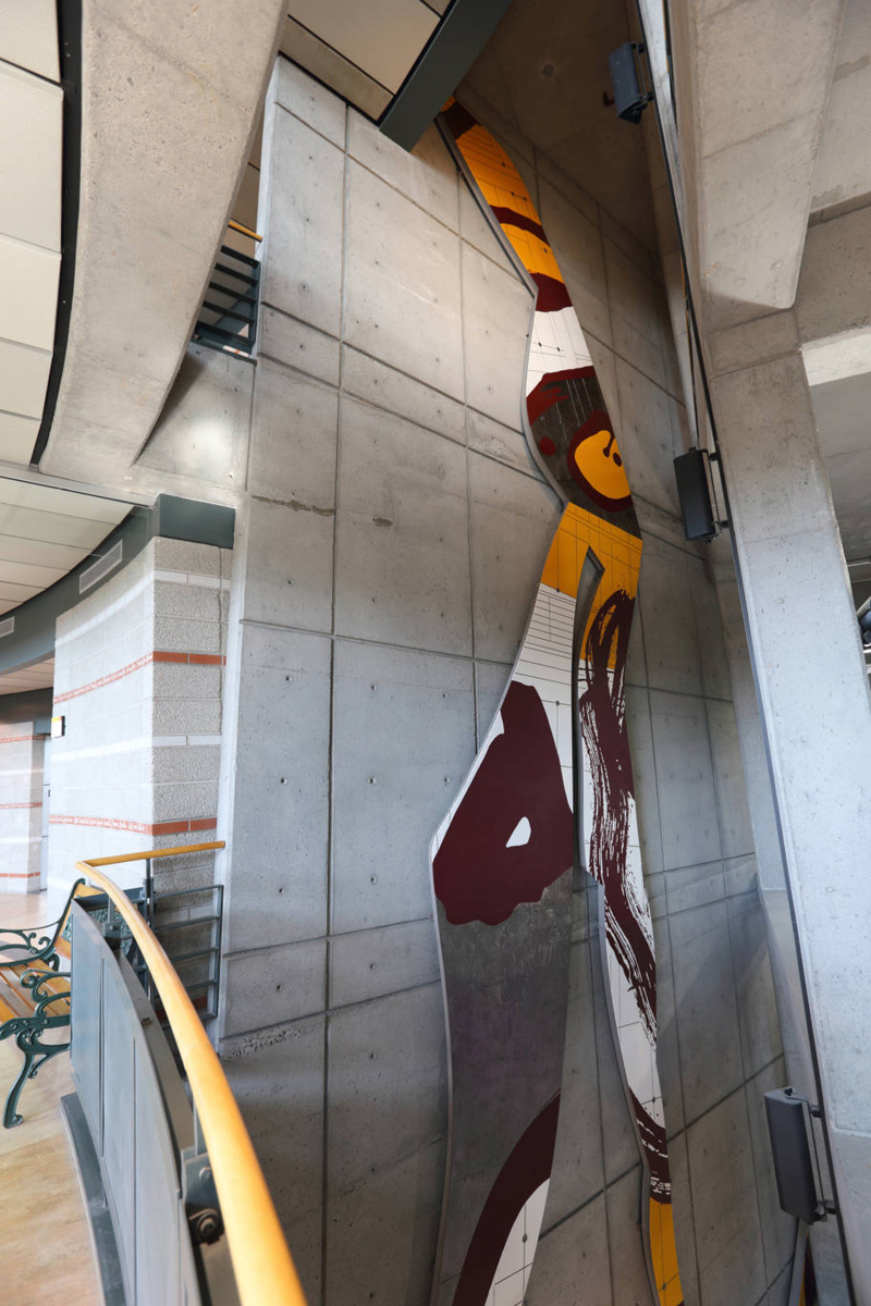 La sculpture illustre un extrait du poème « Le bateau ivre » écrit en 1871 par l'auteur français Arthur Rimbaud. Cet extrait a été choisi pour illustrer les notions de force, de déséquilibre et de mouvance exprimés par l'immensité du lieu : la vastitude du passage, l'atrium couronné d'une série d'ouvertures vitrées, le mur penché dans lequel viennent buter les structures des étages. Cet ensemble architectural donne l'impression d'être face à la coque d'un bateau à la dérive: le bateau ivre. Cet extrait fait aussi appel à l'intemporalité de l'art: un lien entre le passé et le futur qui suggère la continuité et la reconnaissance du vécu humain par le moyen de l'expression créatrice. Les formes organiques rappellent celles des éclairs et dynamisent la surface du mur à la pinceaux font référence au travail de la main de l'artiste. La trame des circuits électroniques (mur de béton) répond à l'ossature de l'architecture.