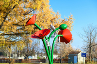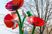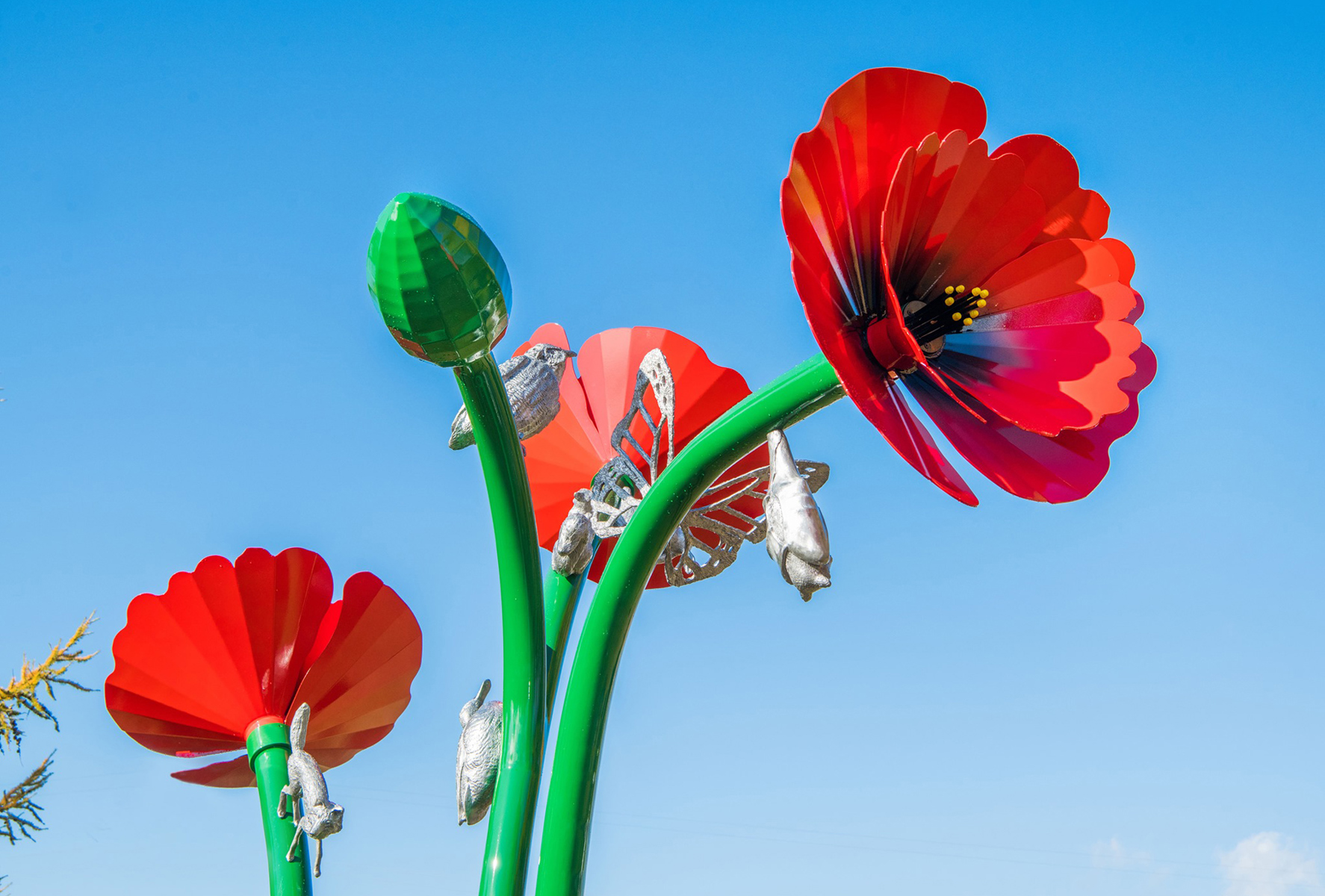 Comme surgi d’un conte fantastique, un bouquet de coquelicots géants invite à découvrir la nature. Sous les flamboyantes corolles, des animaux miniaturisés ont pris d’assaut les hautes tiges. Ils scintillent au soleil, évoquant l’esprit ludique d’enfants curieux.