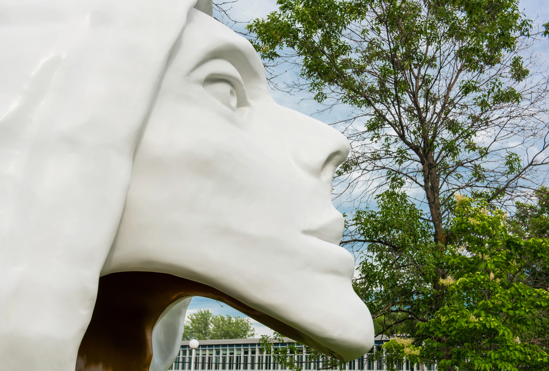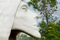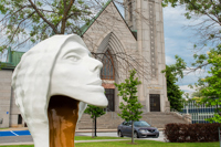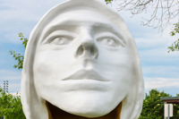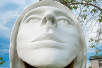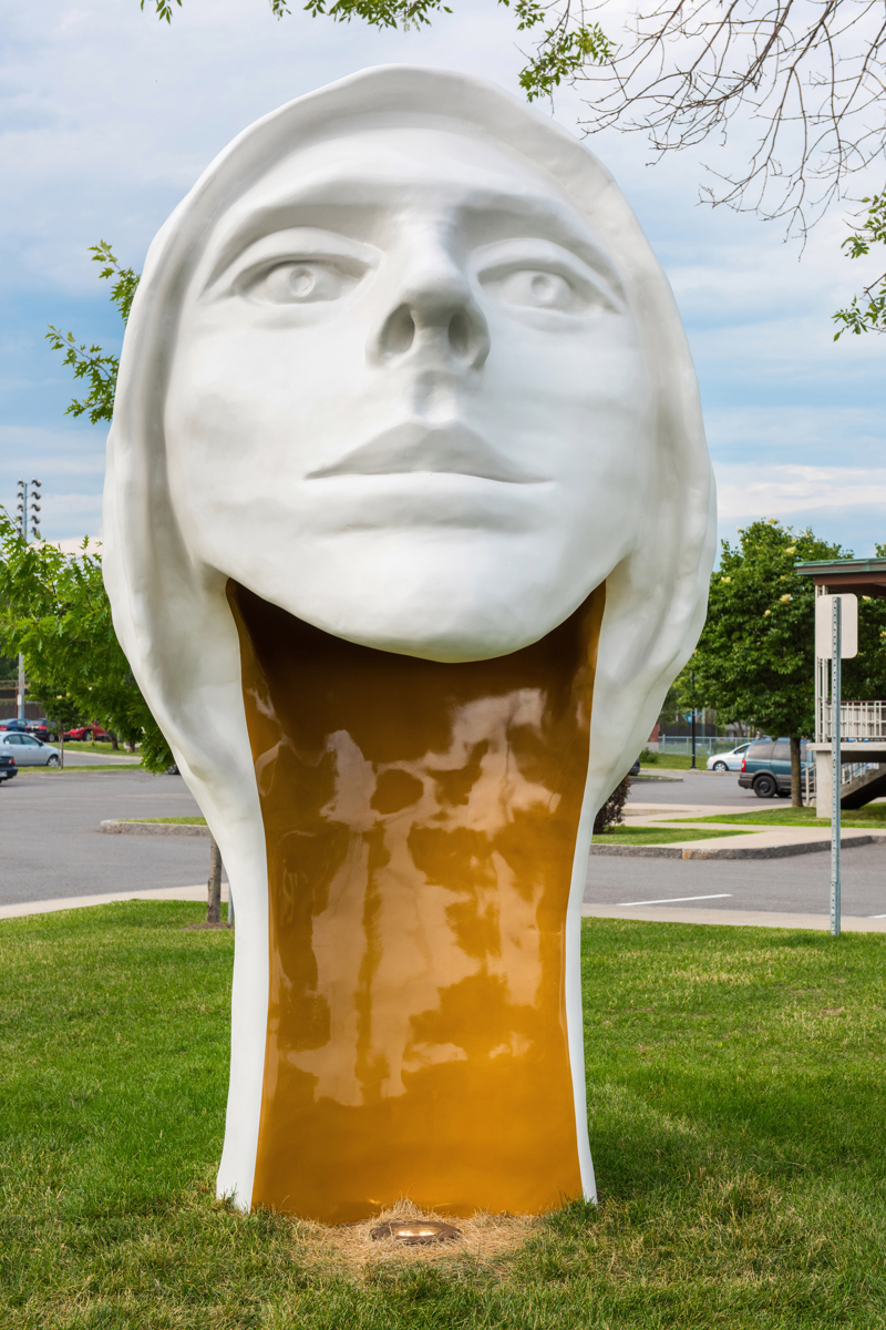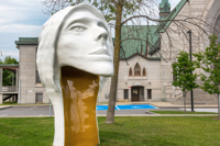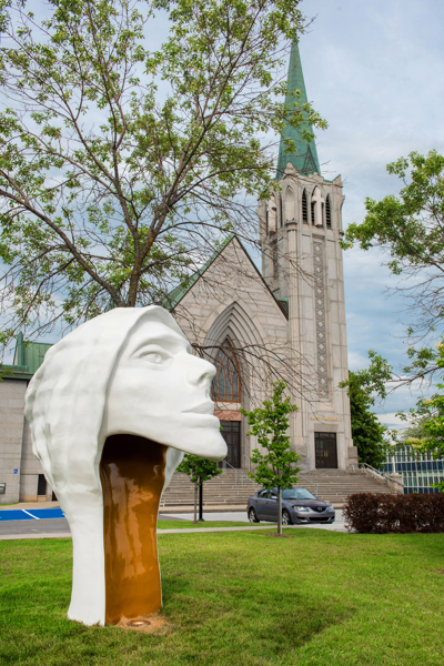 Une tête blanche et or aux lignes pures, coiffée d’un capuchon et assez grande pour qu’on puisse s’y introduire : l’artiste veut surprendre le passant, mais surtout lui faire vivre une expérience qui le mette en contact avec lui-même.