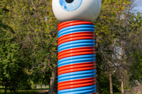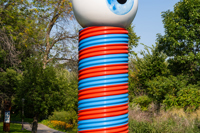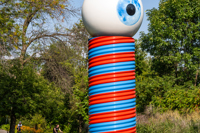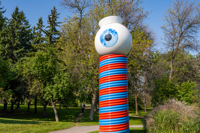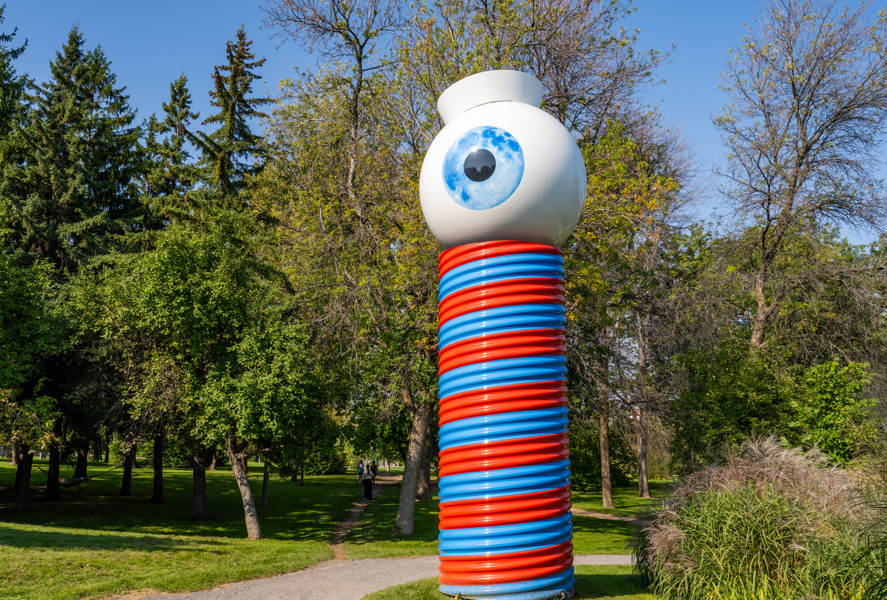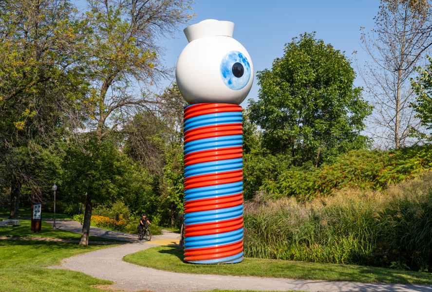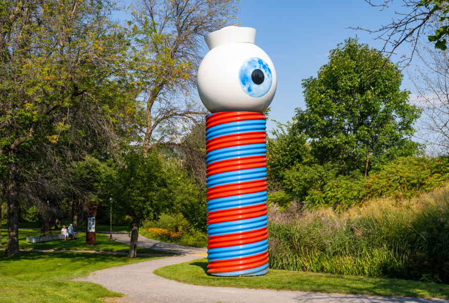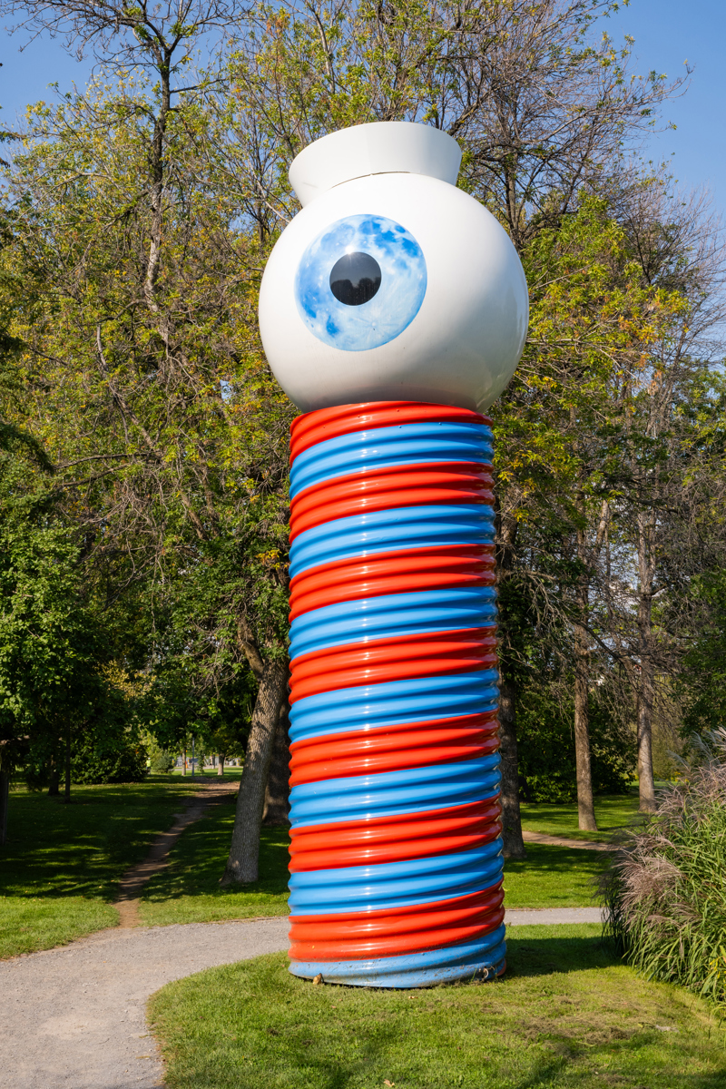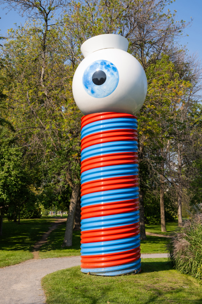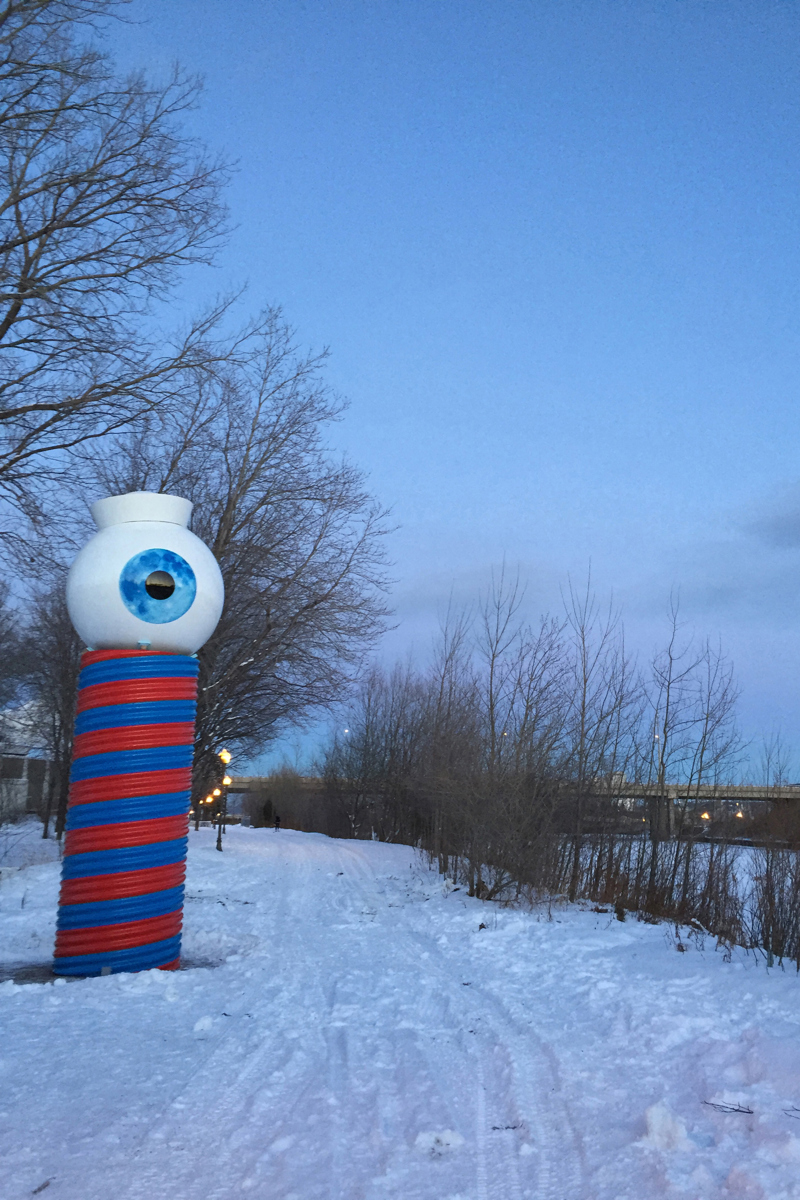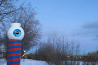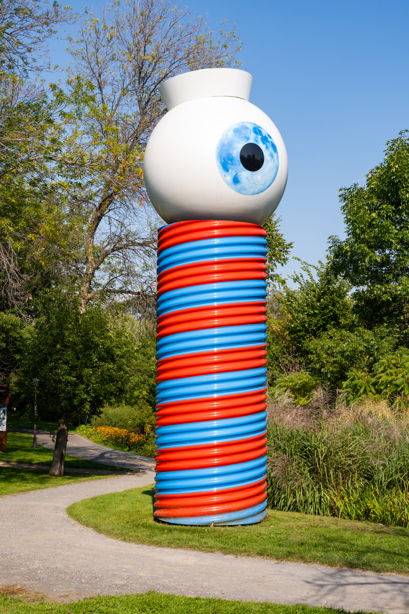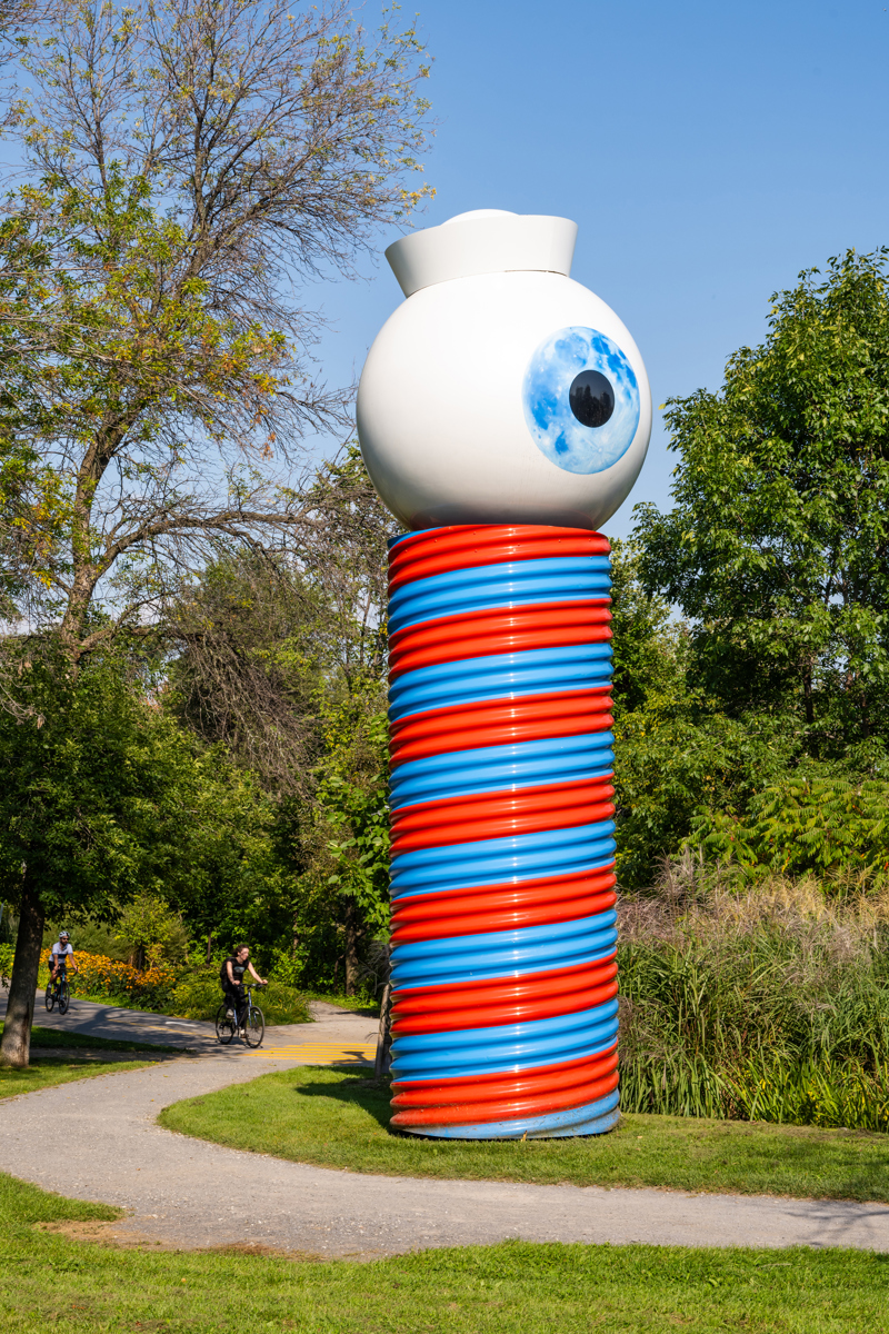 L’œuvre en deux parties est implantée de part et d’autre de la rivière Saint-Charles. Sur la rive sud, l’œuvre est installée au cœur de la Marina Saint-Roch tandis que sur la rive nord, elle est sise sur le site de la Maison Dorion-Coulombe, en bordure du parc linéaire de la Rivière-Saint-Charles, dans le quartier Limoilou. L’œil humain est intimement lié au phare dans l’imagerie populaire puisque, réunis, ces deux symboles suggèrent l’idée paradoxale de voir et d’être vu.