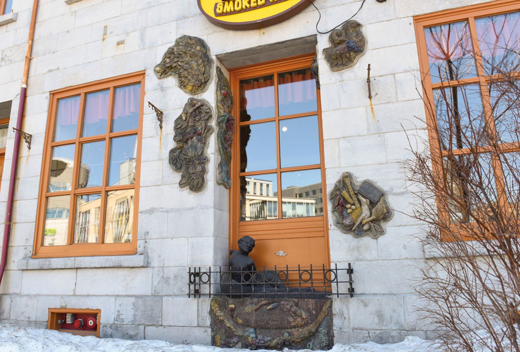 D’inspiration baroque, des hauts-reliefs fortement texturés tranchent sur le gris de la pierre et décorent la porte maintenant condamnée.