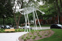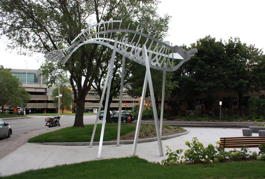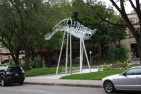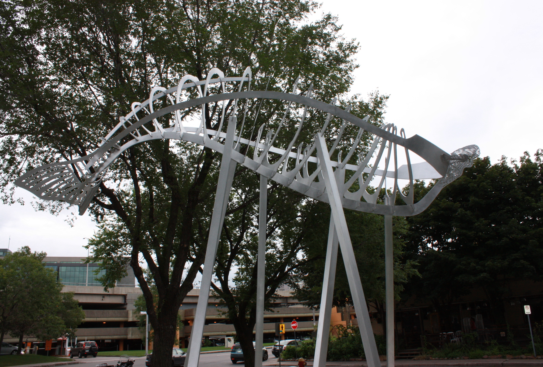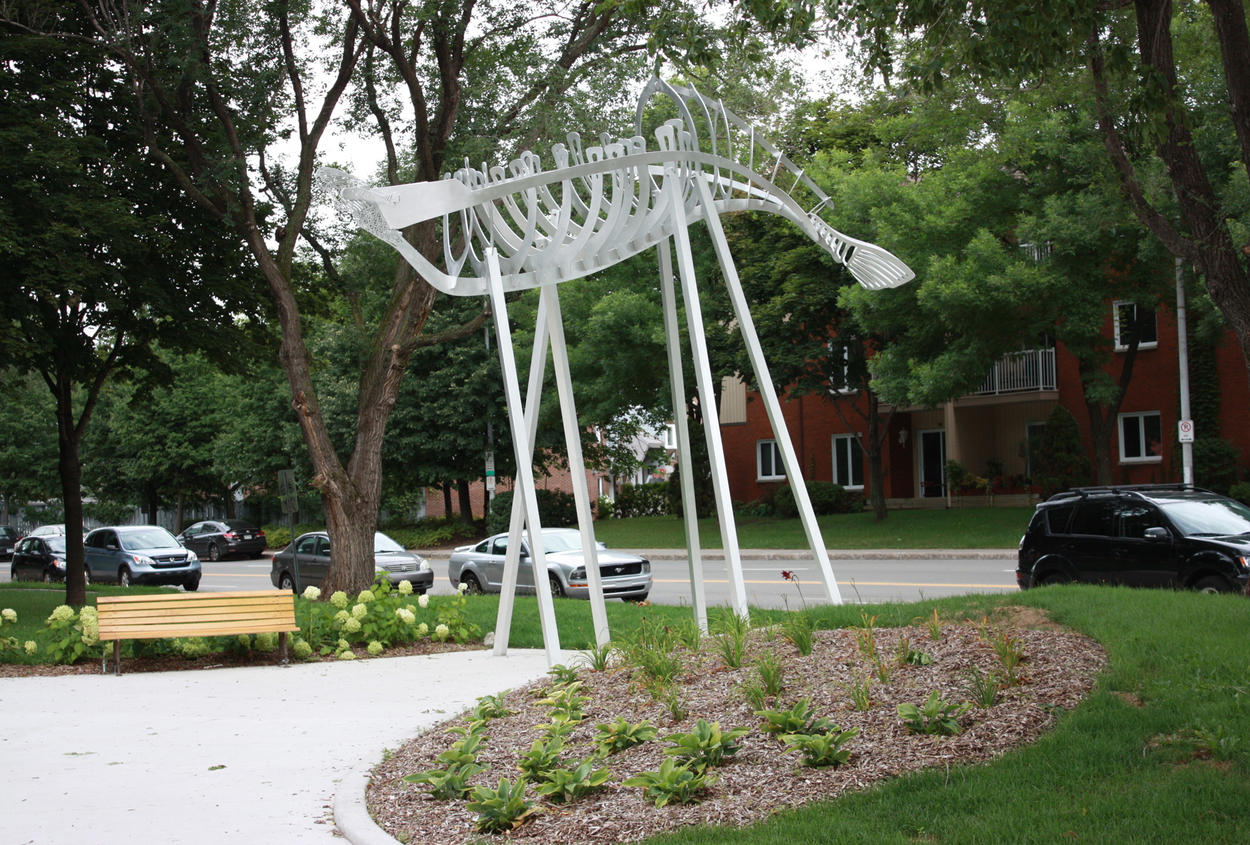 Membrures, arêtes et ondulations composent cette sculpture inspirée de la charpente d’un voilier, qui elle-même fait penser à l’ossature d’un poisson. Avec sa figure de proue en silhouette, le Roi du fleuve semble accoster à l’entrée du parc. Le titre reprend le surnom donné au John Munn, premier bateau à vapeur à sillonner le Saint-Laurent au 19e siècle, époque des grands chantiers navals.