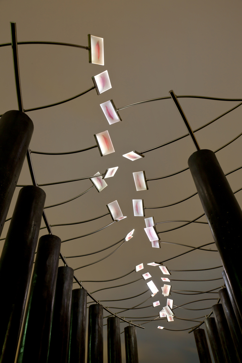 Conçu en hommage aux femmes qui ont contribué au développement de Québec, Le sentier des baisers agrémente le parc des Filles-du-Roi. Pour réaliser son œuvre, l’artiste a photographié des centaines de lèvres de femmes de tous les âges et a reproduit les images sur des plaques de verre. Il en a fixé un certain nombre à des tiges en acier inoxydable, qui elles-mêmes surmontent des colonnes en béton disposées sur deux rangées. Le promeneur qui déambule entre les colonnes a l’impression qu’un cortège de baisers l’accompagne. Des effets de bruine donnent à l’œuvre un aspect évanescent.