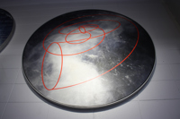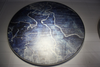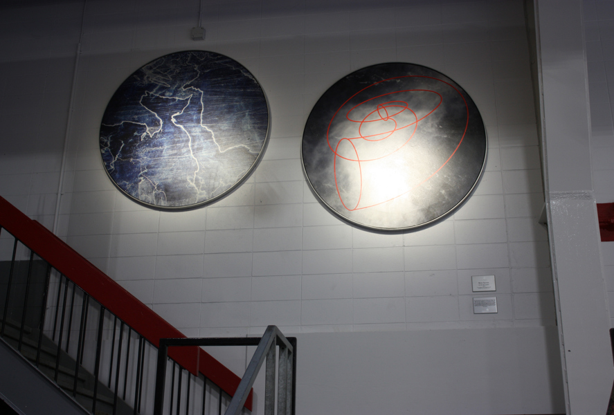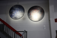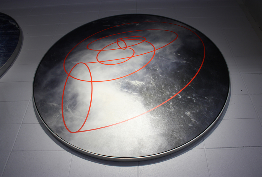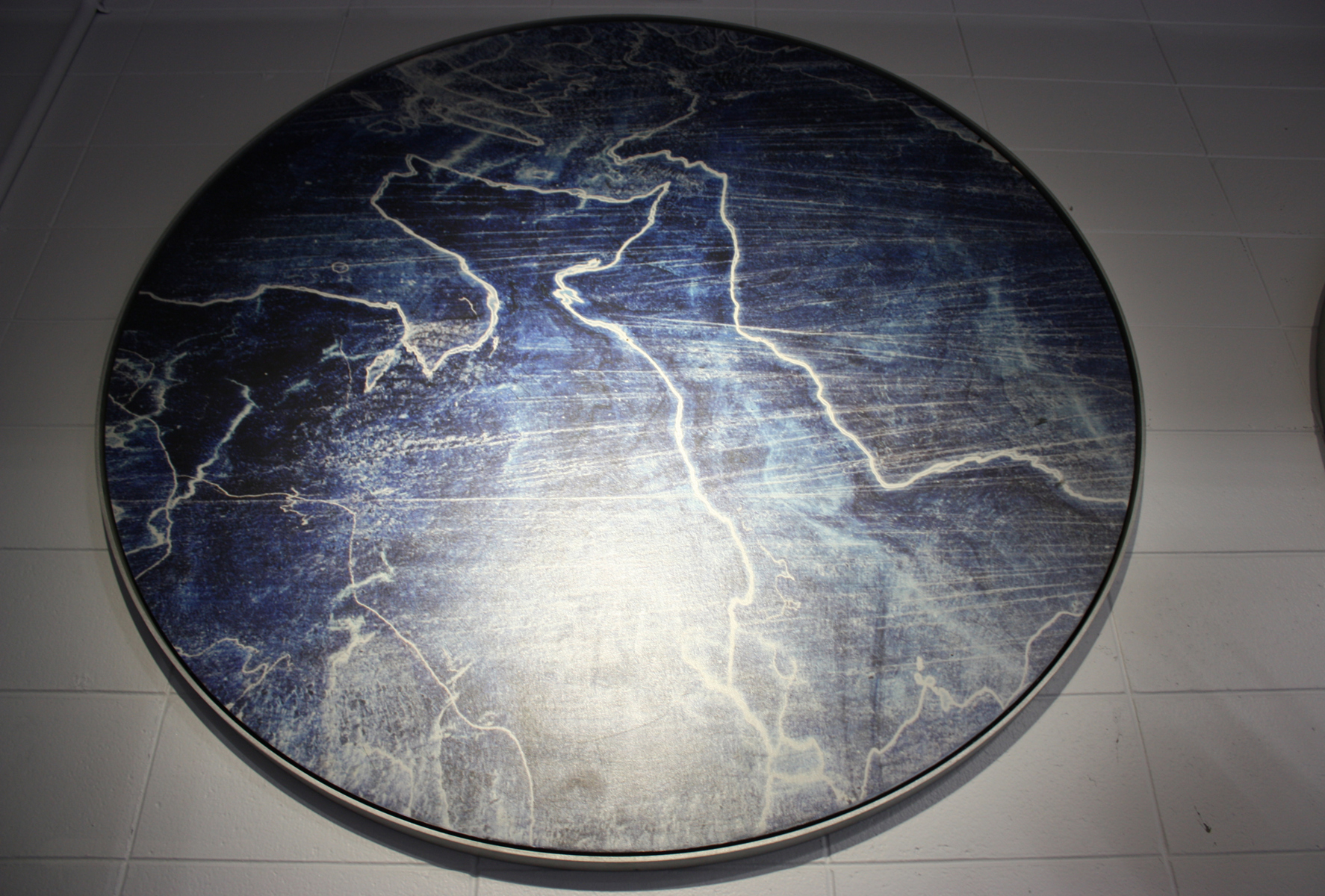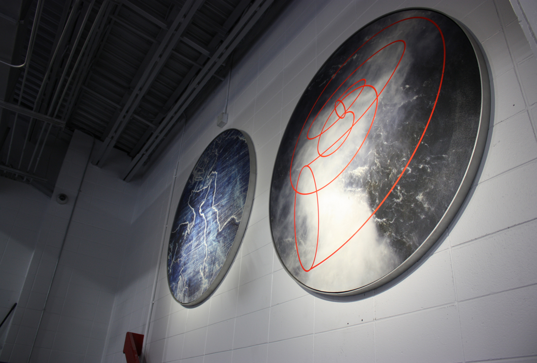 Cette œuvre met côte à côte, sous la forme d’un diptyque, deux images circulaires. La première, un microcosme en bleu, fait croire à des fendillements de l’air emprisonné dans la glace. La seconde, un macrocosme, fait voir de la vapeur d’eau à très grande échelle, des nuages sur lesquels est dessiné un canal auditif, une trompe d’Eustache permettant d’imaginer les bruits sourds, intenses, des trombes d’eau d’une chute ainsi que les craquements secs et puissants de la glace.