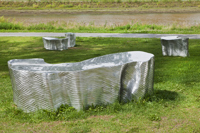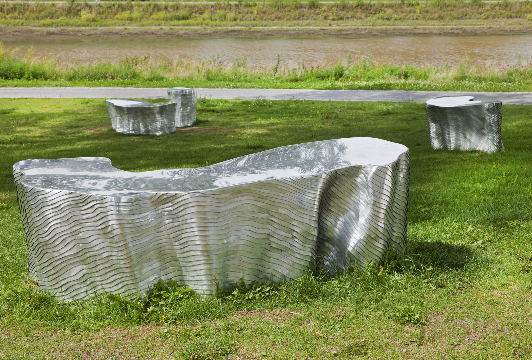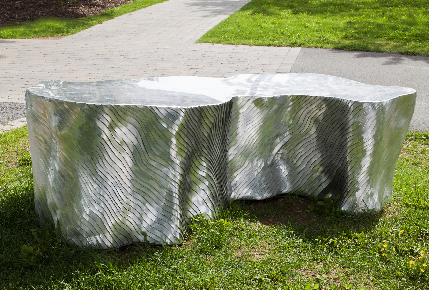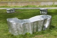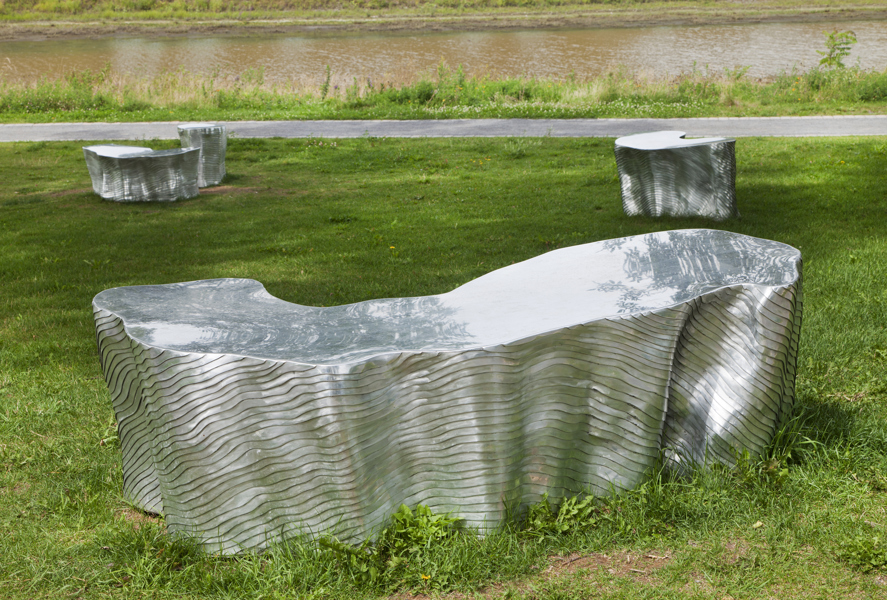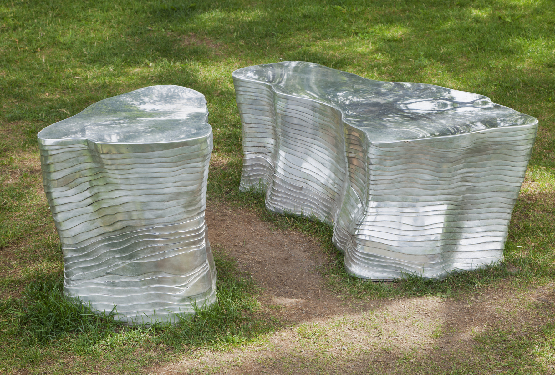 Ces sculptures-bancs faites de strates, telles des couches de glace superposées, font penser à des icebergs que les courants marins auraient dispersés. Leur matériau, l'aluminium, reflète la lumière ou semble la produire, pour ainsi exprimer l'aspect éphémère et changeant du paysage naturel.