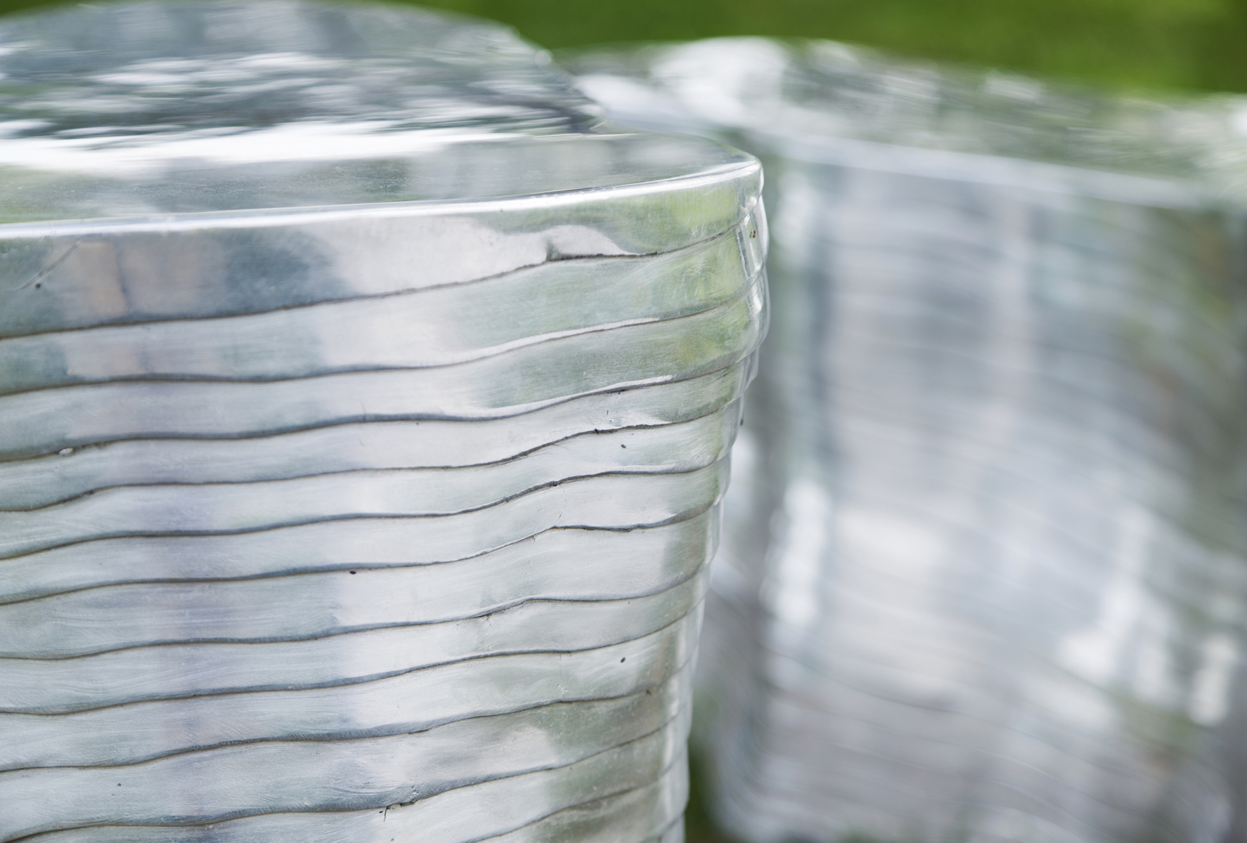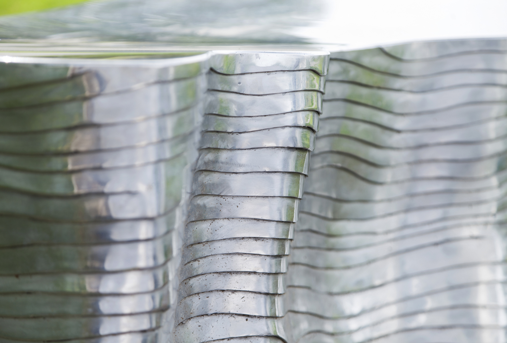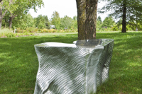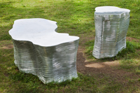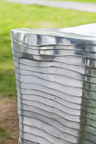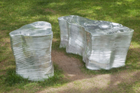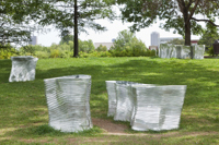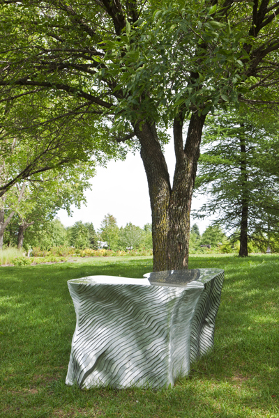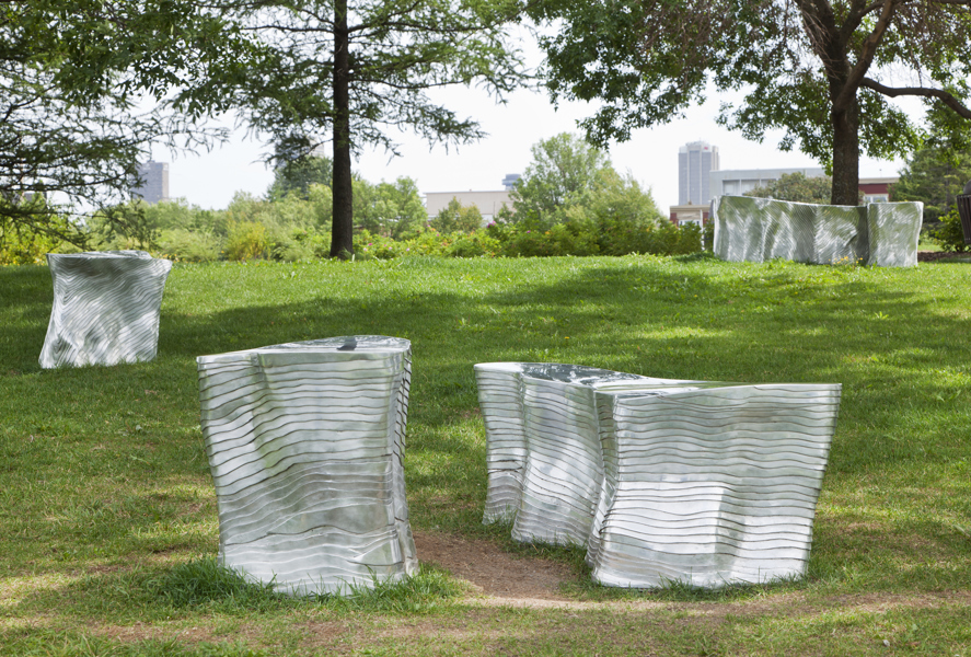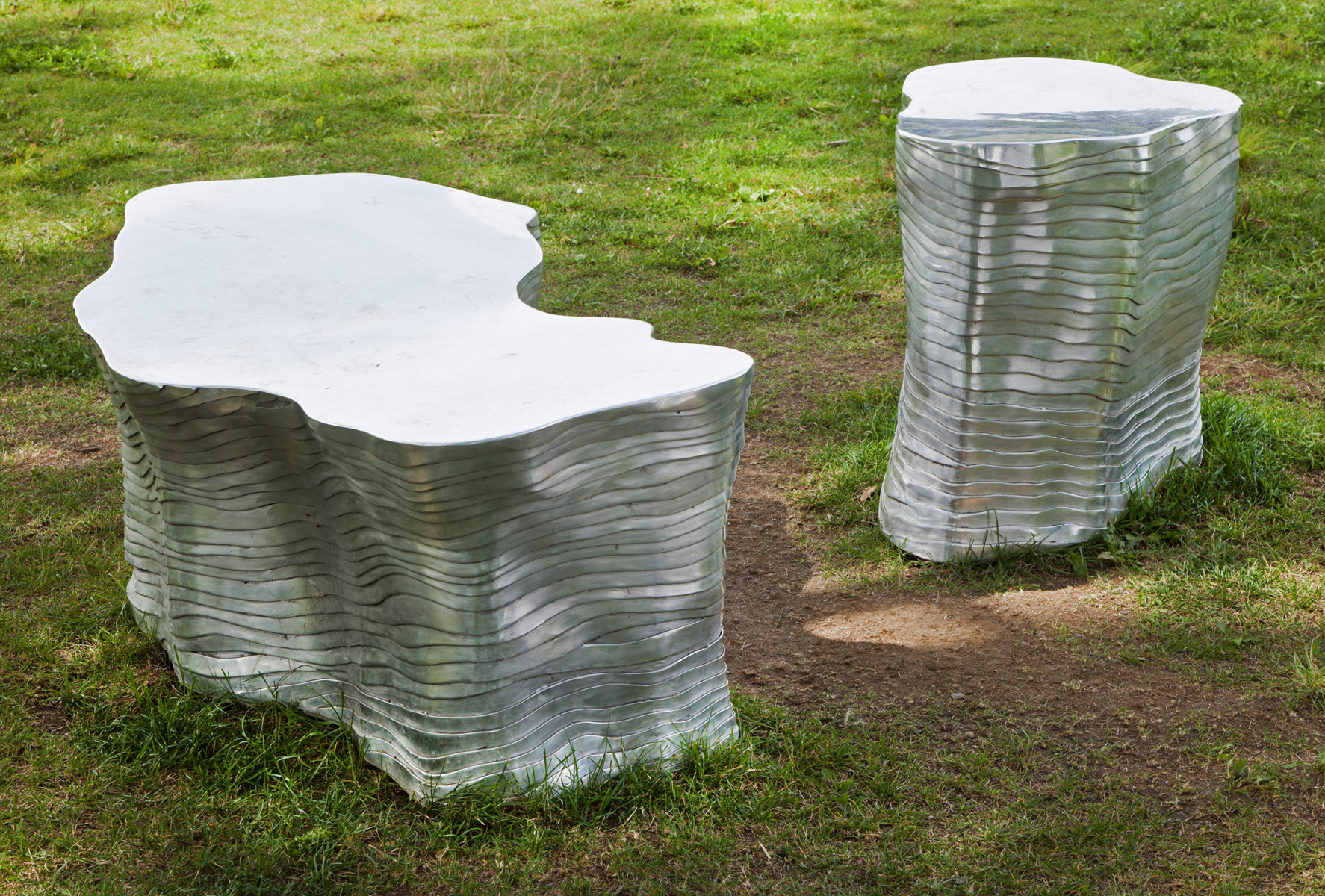 Ces sculptures-bancs faites de strates, telles des couches de glace superposées, font penser à des icebergs que les courants marins auraient dispersés. Leur matériau, l'aluminium, reflète la lumière ou semble la produire, pour ainsi exprimer l'aspect éphémère et changeant du paysage naturel.