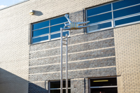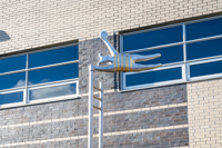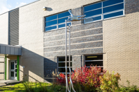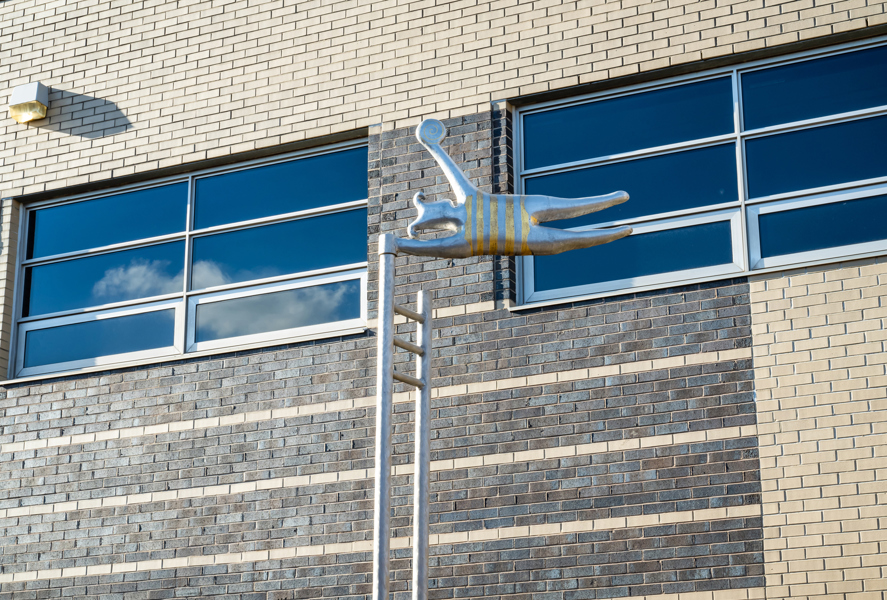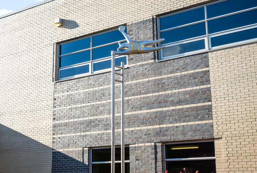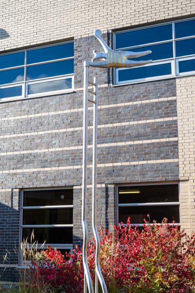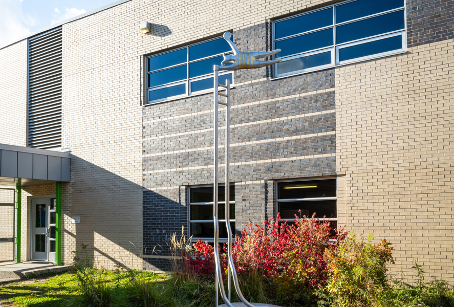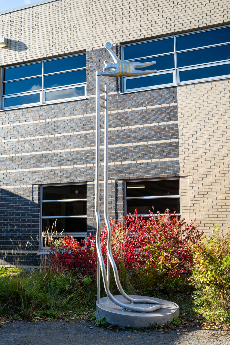 Cette œuvre, située sur le terrain avant de l'école des Prés-Verts, a été réalisée dans le cadre de la Politique d'intégration des arts à l'architecture et à l'environnement.