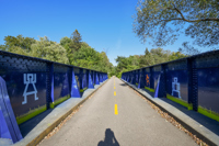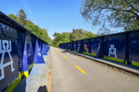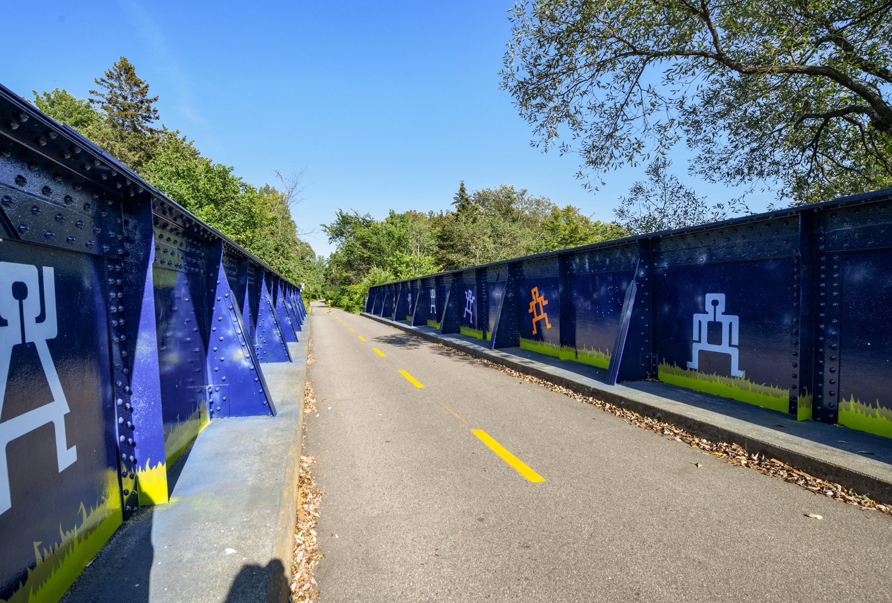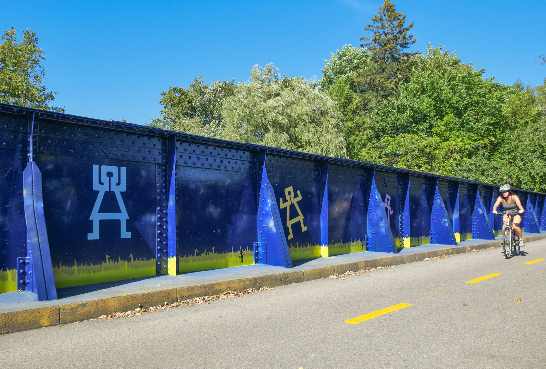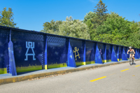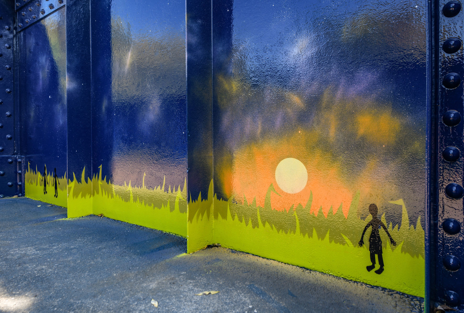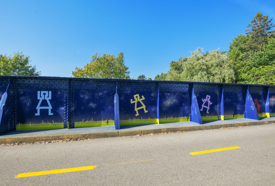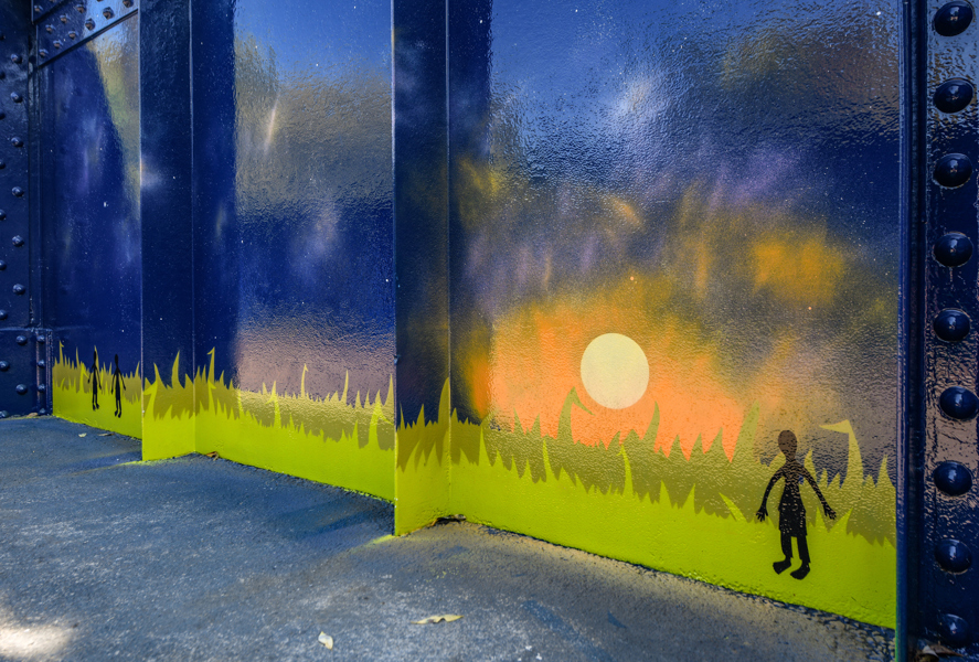 La rambarde de la passerelle est peinte du bleu saphir de la nuit. Des personnages minimalistes y racontent deux versions de la légende des Pléiades : masculine et féminine. Ouvrez l’œil : des kahinion’ah aux pieds palmés — qui auraient laissé leur empreinte dans le roc de la chute Kabir Kouba — vous épient au sol. L’œuvre est aussi semée de constellations diverses. Amusez-vous à les identifier !