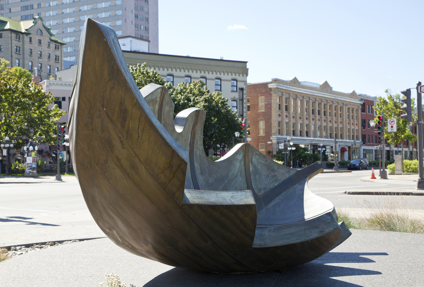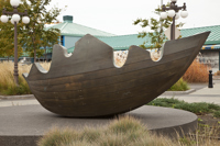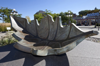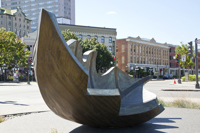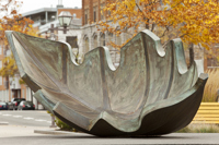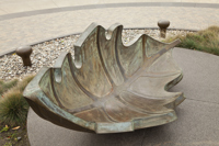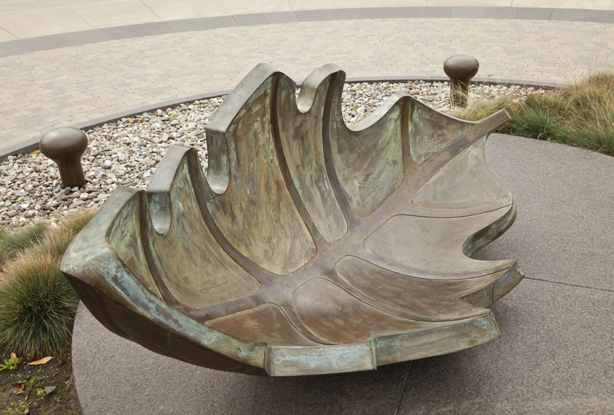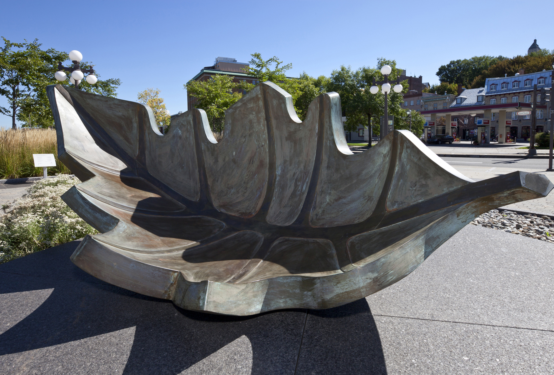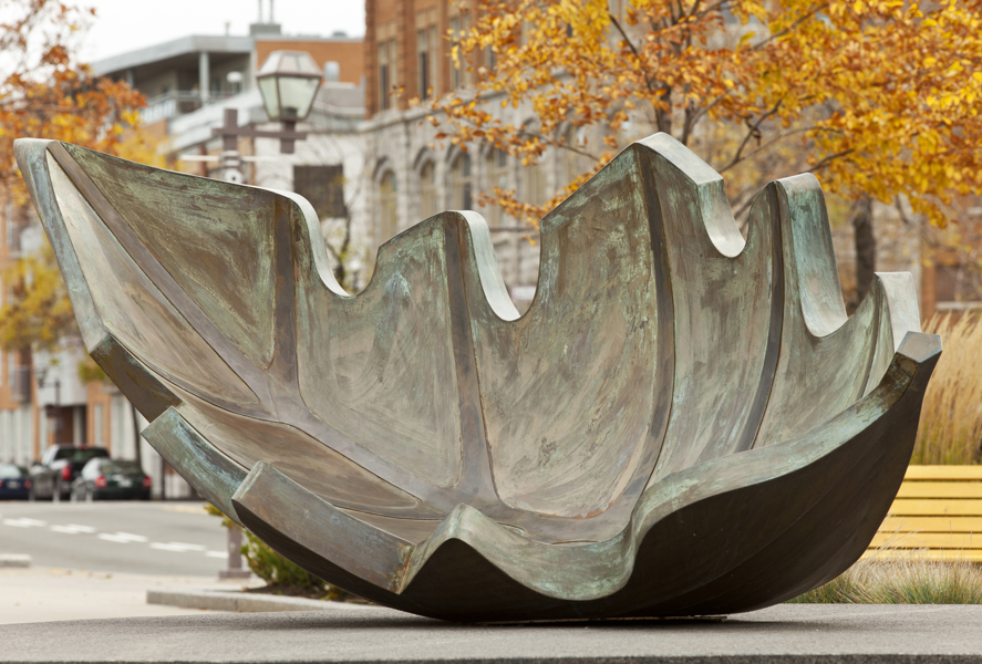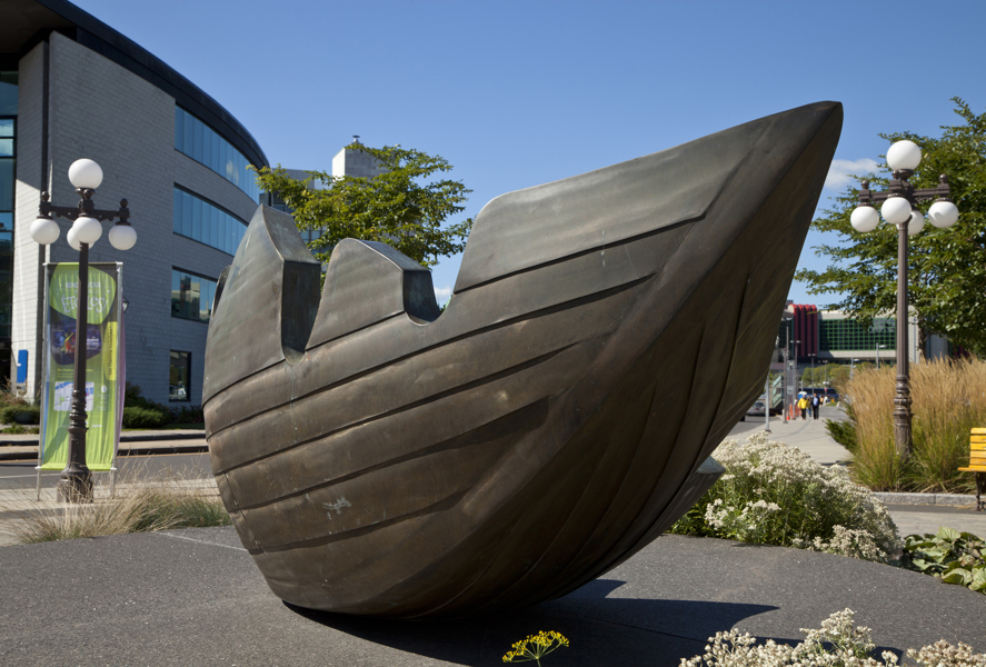 Une barque-feuille pourvue de ses bordages et tapissée de nervures rappelle l’importance du transport maritime dans le peuplement et l’essor commercial de Québec. Elle figure en même temps le voyage, l’enracinement et la métamorphose. Deux bollards placés à proximité sont gravés des premiers vers d’un poème de Saint-Denys Garneau. L’œuvre est un don de la Chambre de commerce de Québec.