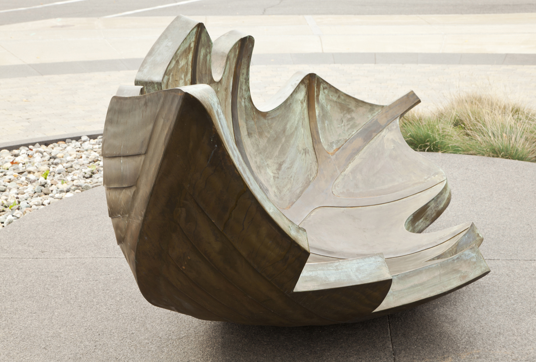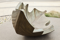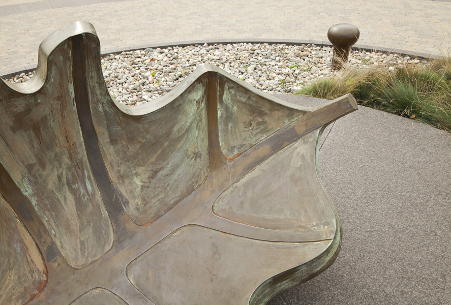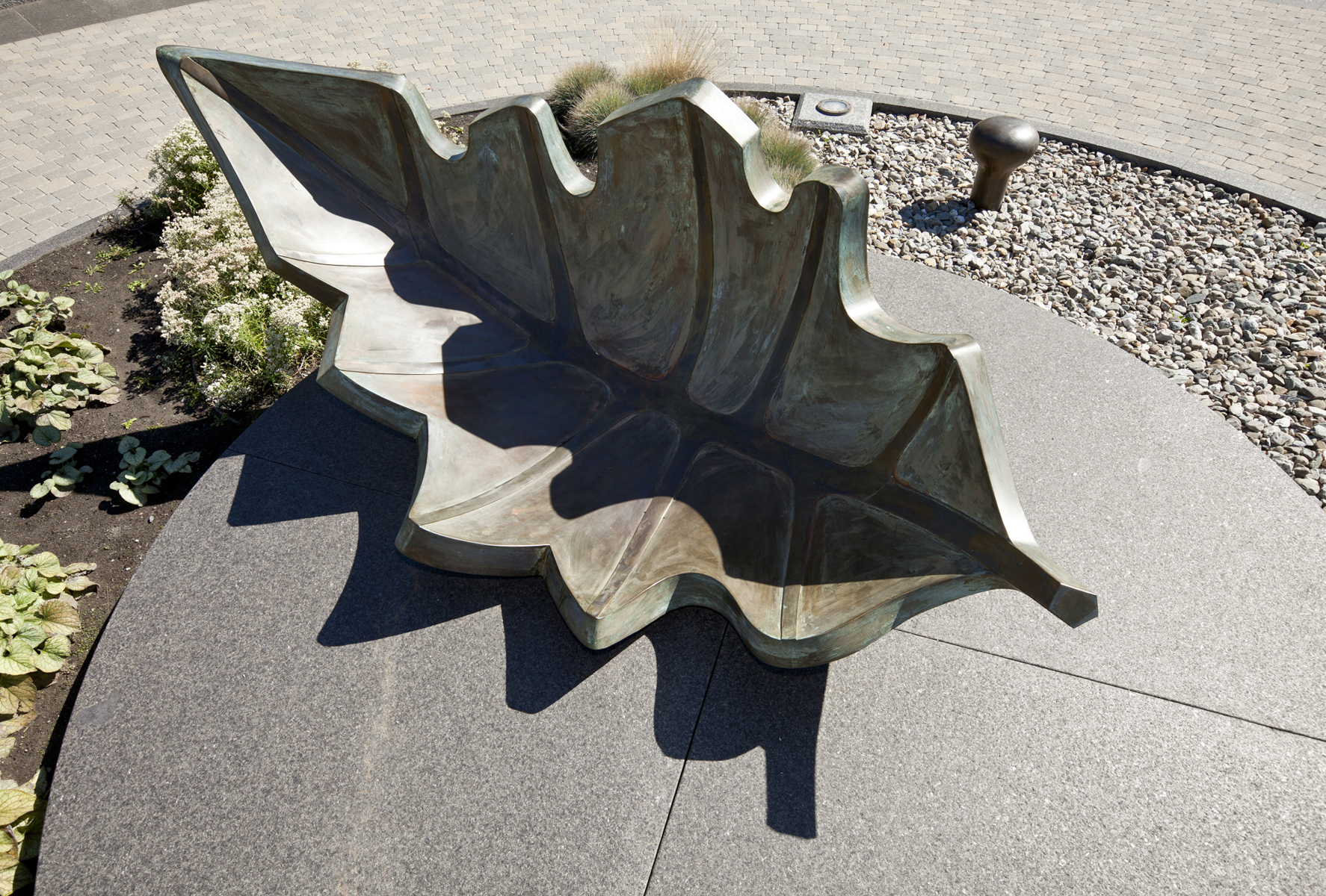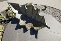 Une barque-feuille pourvue de ses bordages et tapissée de nervures rappelle l’importance du transport maritime dans le peuplement et l’essor commercial de Québec. Elle figure en même temps le voyage, l’enracinement et la métamorphose. Deux bollards placés à proximité sont gravés des premiers vers d’un poème de Saint-Denys Garneau. L’œuvre est un don de la Chambre de commerce de Québec.